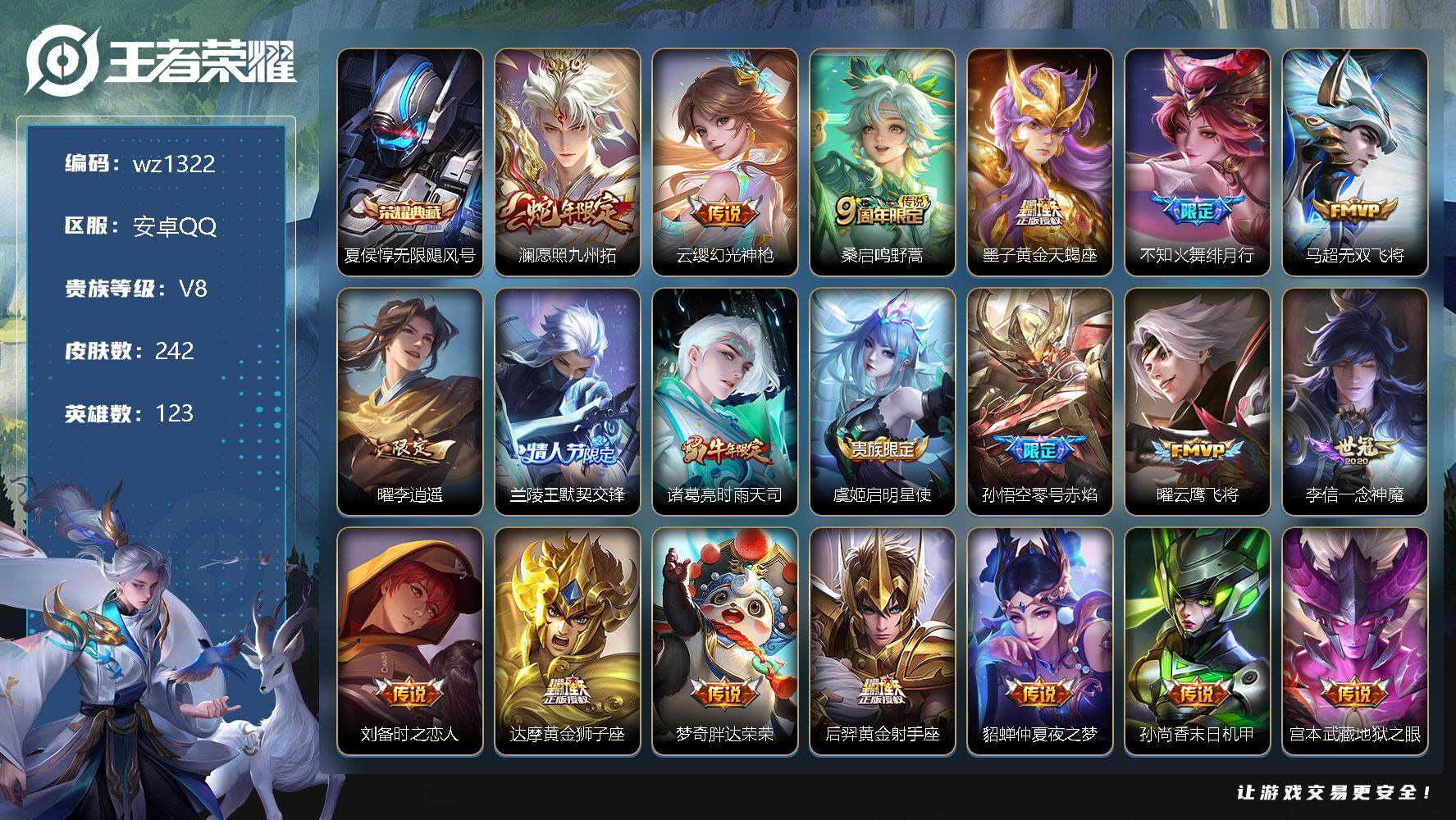 【账号佳】 【可二次实名】【wz1322】【商品标题】:安卓Q-V8-至尊星耀V段位-123英雄-242皮肤-1典藏-0珍品无双-0无双-0珍品传说-21传说-69史诗 【荣耀典藏】:夏侯惇无限飓风号 【传说皮肤】:澜愿照九州拓,云缨幻光神枪,桑启鸣野蒿,墨子黄金天蝎座,不知火舞绯月行,马超无双飞将,曜李逍遥 ,兰陵王默契交锋,诸葛亮时雨天司,虞姬启明星使,孙悟空零号赤焰,曜云鹰飞将,李信一念神魔,刘备时之恋人,达摩黄金狮子座,梦奇胖达荣荣,后羿黄金射手座,貂蝉仲夏夜之梦,孙尚香末日机甲,宫本武藏地狱之眼,狄仁杰超时空战士 【限定皮肤】:暃埋骨钱,蒙犽顽岩魄,大乔绒语心约,姜子牙天穹之誓,狄仁杰阴阳师,赵云皇家上将,墨子神迹守卫,孙尚香蔷薇恋人,庄周高山流水,钟无艳超时空战士,孙膑天狼运算者,芈月白晶晶,芈月幻夜卜梦,吕布御风骁将,元歌云间偶戏,元歌无心,甄姬落雪兰心,狄仁杰魔术师,狄仁杰万华元夜,达摩沙漠行僧,项羽海滩派对,老夫子航海奇遇记,程咬金演武夺筹,兰陵王默契交锋,兰陵王金庭之子,花木兰默契交锋,不知火舞绯月行,亚瑟潮玩骑士王,孙悟空零号赤焰,孙悟空孙行者,李元芳云中旅人,虞姬启明星使,钟馗驱傩正仪,干将莫邪冰霜恋舞曲,鬼谷子原初探秘者,鬼谷子五谷丰年,诸葛亮时雨天司,黄忠火炮绅士,苏烈千军破阵,梦奇顽趣,沈梦溪大漠名商,裴擒虎擒涛扼浪,云中君纤云弄巧,猪八戒猪悟能,曜李逍遥 ,鲁班大师探海日志,桑启海盐诗旅,张良古海寻踪,鬼谷子天穹祈灯,姬小满妄想食味,鲁班七号蔬乡物语,李元芳蔬乡物语,刘邦剑破天穹,程咬金群星魔术团,镜青焰无极,项羽苍威无极,刘备异域游侠,周瑜熔金海岸 【年限皮肤】:吕布御风骁将,诸葛亮时雨天司 【赛季限定】:狄仁杰万华元夜,达摩沙漠行僧,程咬金演武夺筹,兰陵王金庭之子,张良古海寻踪,李元芳云中旅人,钟馗驱傩正仪,鬼谷子原初探秘者,苏烈千军破阵,梦奇顽趣,沈梦溪大漠名商,裴擒虎擒涛扼浪,鲁班大师探海日志,桑启海盐诗旅,鬼谷子天穹祈灯,刘邦剑破天穹,姜子牙天穹之誓 【战令限定】:墨子神迹守卫,钟无艳超时空战士,芈月幻夜卜梦,元歌云间偶戏,甄姬落雪兰心,老夫子航海奇遇记,亚瑟潮玩骑士王,黄忠火炮绅士,鲁班七号蔬乡物语,李元芳蔬乡物语,镜青焰无极,项羽苍威无极 【史诗皮肤】:鲁班七号电玩小子,露娜紫霞仙子,阿轲暗夜猫娘,赵云皇家上将,赵云未来纪元,貂蝉圣诞恋歌,甄姬冰雪圆舞曲,王昭君偶像歌手,狄仁杰魔术师,廉颇地狱岩魂,宫本武藏鬼剑武藏,孙尚香蔷薇恋人,孙尚香水果甜心,嬴政摇滚巨星,妲己魅力维加斯,妲己女仆咖啡,墨子金属风暴,吕布圣诞狂欢,刘禅绅士熊喵,曹操幽灵船长,李白千年之狐,韩信白龙吟,花木兰水晶猎龙者,刘邦德古拉伯爵,夏侯惇乘风破浪,小乔缤纷独角兽,兰陵王暗隐猎兽者,诸葛亮黄金分割率,亚瑟心灵战警,安琪拉心灵骇客,百里守约特工魅影,铠曙光守护者,刘禅天才门将,李元芳逐浪之夏,程咬金功夫厨神,孙策猫狗日记,大乔猫狗日记,干将莫邪冰霜恋舞曲,伽罗箭羽风息,狄仁杰鹰眼统帅,娜可露露晚萤,橘右京修罗,孙尚香时之恋人,云中君纤云弄巧,孙膑天狼运算者,元歌云间偶戏,芈月白晶晶,吕布御风骁将,花木兰默契交锋,老夫子航海奇遇记,杨戬天秀启明,孙悟空孙行者,猪八戒猪悟能,庄周高山流水,黄忠火炮绅士,澜赏金猎手,艾琳奇遇舞章,钟无艳超时空战士,鬼谷子五谷丰年,元歌无心,梦奇顽趣,姬小满妄想食味,鲁班七号蔬乡物语,镜青焰无极,黄忠怒海争锋,蒙犽顽岩魄,暃埋骨钱,阿轲化蝶舞,狂铁龙之律动 【其他皮肤】:项羽海滩派对,韩信教廷特使,韩信街头霸王,露娜哥特玫瑰,达摩大发明家,赵云白执事,赵云忍炎影,白起白色死神,牛魔西部大镖客,武则天东方不败,扁鹊化身博士,扁鹊救世之瞳,宫本武藏未来纪元,安琪拉玩偶对对碰,孙膑天使之翼,妲己少女阿狸,典韦黄金武士,亚瑟死亡骑士,达摩拳王,花木兰兔女郎,张飞五福同心,甄姬花好人间,刘备万事如意,宫本武藏万象初新,狄仁杰阴阳师,刘备纽约教父,刘备汉昭烈帝,关羽龙腾万里,钟无艳海滩丽影,狂铁命运角斗场,老夫子功夫老勺,孙尚香沉稳之力,李白敏锐之力,鬼谷子幻乐之宴,苏烈坚韧之力,大乔守护之力,明世隐虹云星官,张良幽兰居士,小乔丁香结,吕布野性能量,孙膑归虚梦演,沈梦溪鲨炮海盗猫,姜子牙炽热元素使,哪吒次元突破,狂铁特工战影,鬼谷子原初探秘者,狄仁杰万华元夜,亚瑟潮玩骑士王,刘禅秘密基地,杨戬次元傲视,露娜瓷语鉴心,程咬金演武夺筹,张良缤纷绘卷,钟馗驱傩正仪,墨子神迹守卫,鲁班大师乓乓大师,苏烈千军破阵,典韦铁甲之心,达摩沙漠行僧,芈月幻夜卜梦,程咬金无双福将,兰陵王金庭之子,刘禅唤灵魔甲,沈梦溪大漠名商,蒙恬蔚蓝守将,甄姬落雪兰心,李元芳云中旅人,刘备潮玩造梦师,桑启海盐诗旅,猪八戒潮玩探月行,白起乐园追猎者,裴擒虎擒