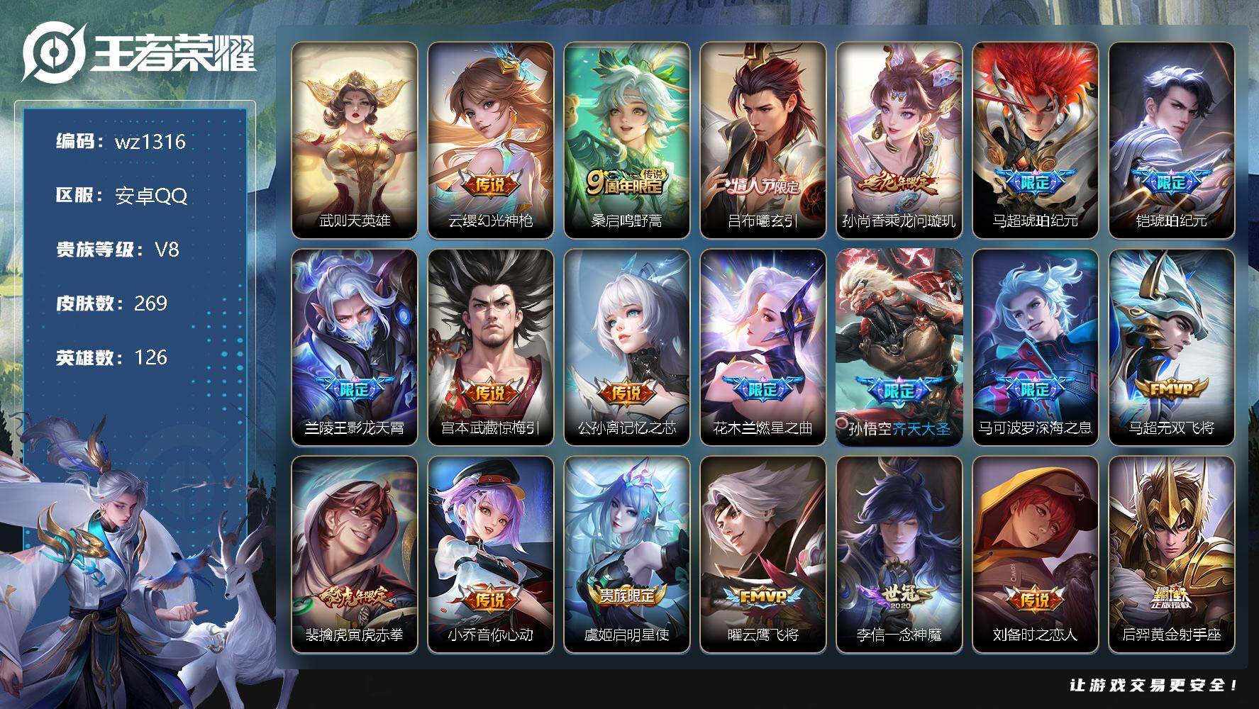 【账号佳】 【可二次实名】【wz1316】【商品标题】:安卓Q-V8-最强王者段位-126英雄-269皮肤-0典藏-0珍品无双-0无双-0珍品传说-24传说-75史诗 【荣耀典藏】:武则天英雄 【传说皮肤】:云缨幻光神枪,桑启鸣野蒿,吕布曦玄引,孙尚香乘龙问璇玑,马超琥珀纪元,铠琥珀纪元,兰陵王影龙天霄,宫本武藏惊梅引,公孙离记忆之芯,花木兰燃星之曲,孙悟空齐天大圣,马可波罗深海之息,马超无双飞将,裴擒虎寅虎赤拳,小乔音你心动,虞姬启明星使,曜云鹰飞将,李信一念神魔,刘备时之恋人,后羿黄金射手座,孙尚香末日机甲,宫本武藏地狱之眼,孙悟空地狱火,狄仁杰超时空战士 【限定皮肤】:蔡文姬夏日便利店,大乔绒语心约,虞姬夏日便利店,姜子牙天穹之誓,狄仁杰阴阳师,赵云皇家上将,孙尚香蔷薇恋人,钟无艳超时空战士,扁鹊奇幻香踪,白起夜都怪侠,吕布猎兽之王,吕布御风骁将,元歌无心,甄姬落雪兰心,马可波罗深海之息,狄仁杰魔术师,达摩沙漠行僧,项羽海滩派对,王昭君午后时光,兰陵王影龙天霄,兰陵王金庭之子,花木兰瑞麟志,花木兰燃星之曲,孙悟空至尊宝,孙悟空孙行者,孙悟空齐天大圣,李元芳匿光侦查者,李元芳云中旅人,虞姬启明星使,女娲朔望之晖,蔡文姬繁星吟游,鬼谷子五谷丰年,铠青龙志,百里玄策原初追逐者,百里守约朱雀志,沈梦溪大漠名商,明世隐疑决卦,明世隐吟游魔法,裴擒虎寅虎赤拳,裴擒虎擒涛扼浪,狂铁电玩高手,云中君纤云弄巧,上官婉儿梁祝,嫦娥拒霜思,嫦娥暖冬兔眠,西施玲珑珍味,鲁班大师探海日志,桑启海盐诗旅,暃星界游侠,戈娅驭风魔法,艾琳流音漫舞,司空震地狱燃心,阿古朵江河有灵,张良古海寻踪,蒙恬荣光圣徽,高渐离燃音魔法,妲己灵卜魔法,鬼谷子天穹祈灯,伽罗琥珀纪元,铠琥珀纪元,马超琥珀纪元,孙尚香乘龙问璇玑,吕布曦玄引,百里玄策超元猎域,沈梦溪龙舞盛年,鲁班七号蔬乡物语,李元芳蔬乡物语,刘邦剑破天穹,周瑜熔金海岸 【年限皮肤】:百里守约朱雀志,花木兰瑞麟志,铠青龙志,裴擒虎寅虎赤拳,吕布御风骁将,孙尚香乘龙问璇玑 【赛季限定】:达摩沙漠行僧,兰陵王金庭之子,张良古海寻踪,李元芳云中旅人,百里玄策原初追逐者,沈梦溪大漠名商,明世隐疑决卦,裴擒虎擒涛扼浪,鲁班大师探海日志,桑启海盐诗旅,鬼谷子天穹祈灯,蒙恬荣光圣徽,刘邦剑破天穹,姜子牙天穹之誓 【战令限定】:蔡文姬夏日便利店,虞姬夏日便利店,钟无艳超时空战士,扁鹊奇幻香踪,白起夜都怪侠,吕布猎兽之王,甄姬落雪兰心,王昭君午后时光,艾琳流音漫舞,女娲朔望之晖,明世隐吟游魔法,狂铁电玩高手,嫦娥暖冬兔眠,西施玲珑珍味,司空震地狱燃心,暃星界游侠,戈娅驭风魔法,高渐离燃音魔法,妲己灵卜魔法,鲁班七号蔬乡物语,李元芳蔬乡物语 【史诗皮肤】:鲁班七号电玩小子,赵云皇家上将,赵云未来纪元,貂蝉圣诞恋歌,甄姬冰雪圆舞曲,王昭君偶像歌手,狄仁杰魔术师,廉颇地狱岩魂,宫本武藏鬼剑武藏,孙尚香蔷薇恋人,孙尚香水果甜心,嬴政暗夜贵公子,妲己魅力维加斯,妲己女仆咖啡,吕布圣诞狂欢,刘禅绅士熊喵,李白千年之狐,吕布末日机甲,张飞乱世虎臣,孙悟空至尊宝,花木兰水晶猎龙者,刘邦德古拉伯爵,夏侯惇乘风破浪,兰陵王暗隐猎兽者,亚瑟心灵战警,雅典娜冰冠公主,铠曙光守护者,蔡文姬舞动绿茵,李元芳逐浪之夏,程咬金功夫厨神,孙策猫狗日记,铠青龙志,百里守约朱雀志,花木兰瑞麟志,狄仁杰鹰眼统帅,上官婉儿梁祝,蔡文姬繁星吟游,小乔青蛇,橘右京修罗,孙尚香时之恋人,百里玄策原初追逐者,云中君纤云弄巧,吕布御风骁将,西施诗语江南,钟馗乐园奇幻夜,孙悟空孙行者,嫦娥拒霜思,明世隐吟游魔法,高渐离天秀音浪,狂铁电玩高手,钟无艳超时空战士,鬼谷子五谷丰年,元歌无心,暃星界游侠,扁鹊奇幻香踪,戈娅驭风魔法,李元芳匿光侦查者,司空震地狱燃心,阿古朵江河有灵,妲己灵卜魔法,高渐离燃音魔法,蒙恬荣光圣徽,伽罗琥珀纪元,百里玄策超元猎域,鲁班七号蔬乡物语,黄忠怒海争锋,蔡文姬夏日便利店,大司命东方月初,廉颇撼地雄心,亚连破空之剑,弈星万物之道,狄仁杰绮世丹青,阿轲化蝶舞,刘禅鸭鸭历险记,狂铁龙之律动,黄忠百相守梦 【其他皮肤】:项羽海滩派对,韩信教廷特使,韩信街头霸王,露娜哥特玫瑰,阿轲爱心护理,达摩大发明家,赵云白执事,赵云忍炎影,芈月红桃皇后,程咬金爱与正义,白起白色死神,牛魔西部大镖客,武则天东方不败,扁鹊化身博士,扁鹊救世之瞳,宫本武藏未来纪元,孙膑天使之翼,姜子牙时尚教父,妲己少女阿狸,典韦黄金武士,亚瑟死亡骑士,达摩拳王,花木兰兔女郎,张飞五福同心,甄姬花好人间,刘备万事如意,后羿阿尔法小队,狄仁杰阴阳师,刘备纽约教父,李元芳黑猫爱糖果,关羽龙腾万里,墨子进击墨子号,钟无艳海滩丽影,狂铁命运角斗场,老夫子功夫老勺,诸葛亮掌控之力,李白敏锐之力,鬼谷子幻乐之宴,大乔守护之力,吕布猎