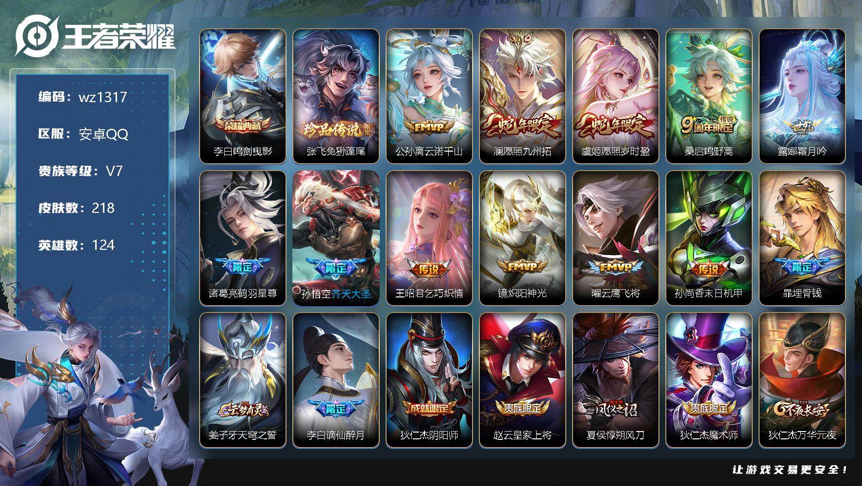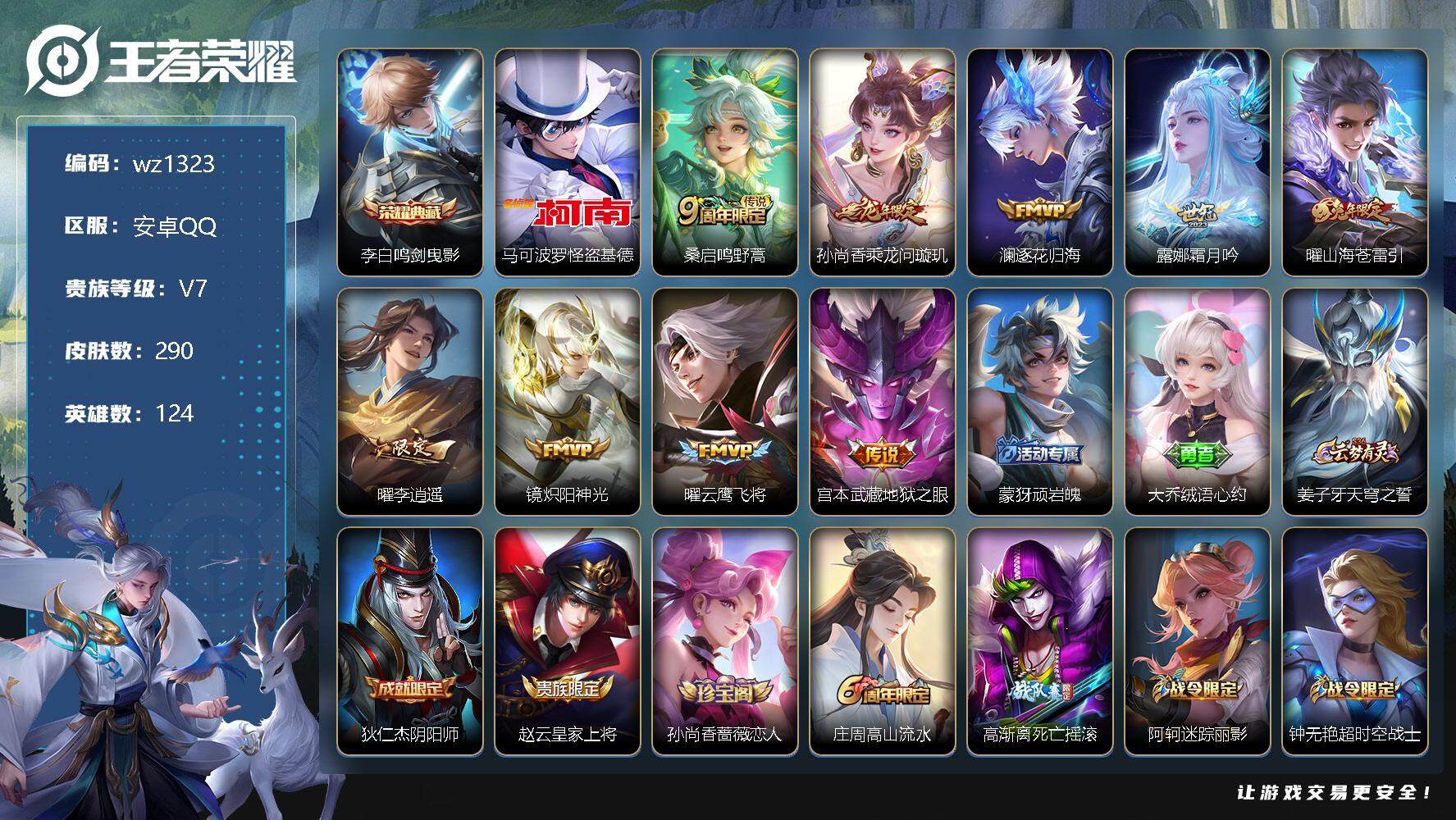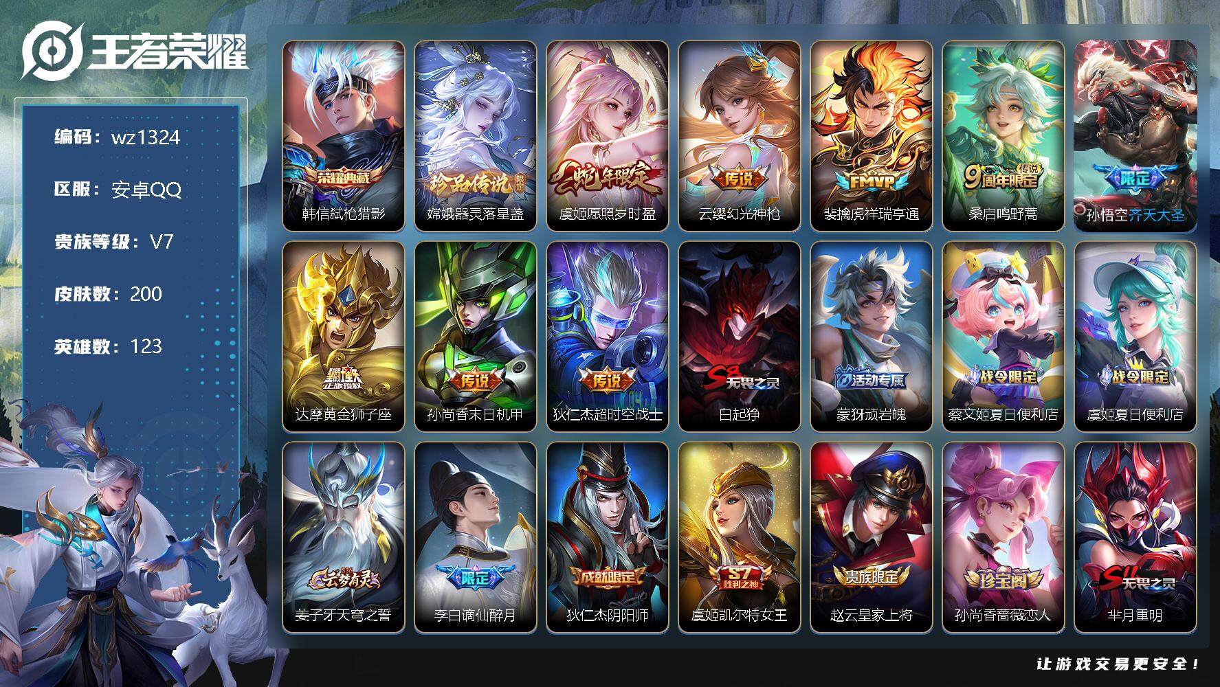【账号佳】 【可二次实名】【wz1324】【商品标题】:安卓Q-V7-最强王者段位-123英雄-200皮肤-1典藏-0珍品无双-0无双-1珍品传说-8传说-51史诗 【荣耀典藏】:韩信弑枪猎影 【珍品传说】:嫦娥器灵落星盏 【传说皮肤】:虞姬愿照岁时盈,云缨幻光神枪,裴擒虎祥瑞亨通,桑启鸣野蒿,孙悟空齐天大圣,达摩黄金狮子座,孙尚香末日机甲,狄仁杰超时空战士 【限定皮肤】:白起狰,蒙犽顽岩魄,蔡文姬夏日便利店,虞姬夏日便利店,姜子牙天穹之誓,李白谪仙醉月,狄仁杰阴阳师,虞姬凯尔特女王,赵云皇家上将,孙尚香蔷薇恋人,芈月重明,芈月幻夜卜梦,元歌无心,夏侯惇朔风刀,曹操烛龙,狄仁杰魔术师,狄仁杰万华元夜,达摩沙漠行僧,项羽海滩派对,老夫子醍醐杖,程咬金演武夺筹,韩信傲雪梅枪,王昭君午后时光,兰陵王金庭之子,花木兰默契交锋,孙悟空齐天大圣,牛魔御旌,李元芳云中旅人,钟馗驱傩正仪,太乙真人饕餮,鬼谷子原初探秘者,鬼谷子五谷丰年,黄忠火炮绅士,苏烈千军破阵,弈星混沌棋,公孙离玉兔公主,沈梦溪大漠名商,明世隐疑决卦,裴擒虎李小龙,裴擒虎擒涛扼浪,狂铁御狮,狂铁电玩高手,米莱狄御霄,嫦娥暖冬兔眠,西施玲珑珍味,鲁班大师探海日志,桑启海盐诗旅,暃星界游侠,鬼谷子天穹祈灯,姬小满妄想食味,沈梦溪龙舞盛年,刘邦剑破天穹,程咬金群星魔术团,周瑜熔金海岸 【赛季限定】:白起狰,芈月重明,夏侯惇朔风刀,曹操烛龙,狄仁杰万华元夜,达摩沙漠行僧,老夫子醍醐杖,程咬金演武夺筹,兰陵王金庭之子,牛魔御旌,李元芳云中旅人,虞姬凯尔特女王,钟馗驱傩正仪,太乙真人饕餮,鬼谷子原初探秘者,苏烈千军破阵,弈星混沌棋,沈梦溪大漠名商,明世隐疑决卦,裴擒虎擒涛扼浪,狂铁御狮,米莱狄御霄,鲁班大师探海日志,桑启海盐诗旅,鬼谷子天穹祈灯,刘邦剑破天穹,姜子牙天穹之誓 【战令限定】:蔡文姬夏日便利店,虞姬夏日便利店,芈月幻夜卜梦,王昭君午后时光,黄忠火炮绅士,狂铁电玩高手,嫦娥暖冬兔眠,西施玲珑珍味,暃星界游侠 【史诗皮肤】:露娜紫霞仙子,赵云皇家上将,赵云未来纪元,甄姬冰雪圆舞曲,狄仁杰魔术师,宫本武藏鬼剑武藏,孙尚香蔷薇恋人,孙尚香水果甜心,嬴政摇滚巨星,妲己魅力维加斯,妲己女仆咖啡,墨子金属风暴,曹操幽灵船长,吕布末日机甲,张飞乱世虎臣,花木兰水晶猎龙者,夏侯惇乘风破浪,小乔缤纷独角兽,诸葛亮黄金分割率,亚瑟心灵战警,雅典娜冰冠公主,安琪拉心灵骇客,百里守约特工魅影,李元芳逐浪之夏,程咬金功夫厨神,白起星夜王子,阿轲节奏热浪,孙策猫狗日记,狄仁杰鹰眼统帅,橘右京修罗,裴擒虎李小龙,花木兰默契交锋,百里玄策热力回旋,黄忠火炮绅士,韩信傲雪梅枪,夏洛特永昼,公孙离玉兔公主,狂铁电玩高手,鬼谷子五谷丰年,元歌无心,暃星界游侠,百里守约真我赫兹,姬小满妄想食味,蔡文姬夏日便利店,蒙犽顽岩魄,姬小满战舞者,亚连破空之剑,李白谪仙醉月,狂铁龙之律动,周瑜百相守梦,黄忠百相守梦 【其他皮肤】:项羽海滩派对,韩信教廷特使,韩信街头霸王,达摩大发明家,赵云忍炎影,芈月红桃皇后,白起白色死神,扁鹊化身博士,扁鹊救世之瞳,宫本武藏未来纪元,安琪拉玩偶对对碰,妲己少女阿狸,典韦黄金武士,亚瑟死亡骑士,花木兰兔女郎,甄姬花好人间,刘备万事如意,狄仁杰阴阳师,刘备汉昭烈帝,关羽龙腾万里,虞姬凯尔特女王,白起狰,钟无艳海滩丽影,太乙真人饕餮,曹操烛龙,王昭君幻想奇妙夜,芈月重明,狂铁命运角斗场,老夫子功夫老勺,孙尚香沉稳之力,李白敏锐之力,鬼谷子幻乐之宴,狂铁御狮,苏烈坚韧之力,大乔守护之力,米莱狄御霄,明世隐虹云星官,牛魔御旌,吕布野性能量,孙膑归虚梦演,沈梦溪鲨炮海盗猫,姜子牙炽热元素使,夏侯惇朔风刀,弈星混沌棋,哪吒次元突破,明世隐疑决卦,盾山圆桌骑士,老夫子醍醐杖,狂铁特工战影,鬼谷子原初探秘者,狄仁杰万华元夜,刘禅秘密基地,程咬金演武夺筹,张良缤纷绘卷,钟馗驱傩正仪,鲁班大师乓乓大师,苏烈千军破阵,达摩沙漠行僧,芈月幻夜卜梦,程咬金无双福将,兰陵王金庭之子,刘禅唤灵魔甲,王昭君午后时光,沈梦溪大漠名商,蒙恬蔚蓝守将,李元芳云中旅人,戈娅危途狂花,桑启海盐诗旅,嫦娥暖冬兔眠,猪八戒潮玩探月行,白起乐园追猎者,赵怀真太极少年,裴擒虎擒涛扼浪,莱西奥西部游侠,鲁班大师探海日志,西施玲珑珍味,姬小满零食大作战,亚连破局者,鬼谷子天穹祈灯,朵莉亚金色潮汐,廉颇功夫炙烤,沈梦溪龙舞盛年,扁鹊无尽旅途,刘邦剑破天穹,程咬金群星魔术团,姜子牙天穹之誓,周瑜熔金海岸,虞姬夏日便利店,孙悟空神迹守卫,盘古敬我三分,东皇太一噬灭天穹,太乙真人谧流熔炉,姜子牙星梦巡礼,戈娅玫蓝誓约,刘备浪漫序章,钟馗虚灵犬护,阿古朵布丁狗之约,甄姬逆浪荇歌,孙策百相守梦,庄周锦麟游梦,鲁班七号福禄兄弟,鲁班七号木偶奇遇记,貂蝉异域舞娘,孙悟空西部大镖客,