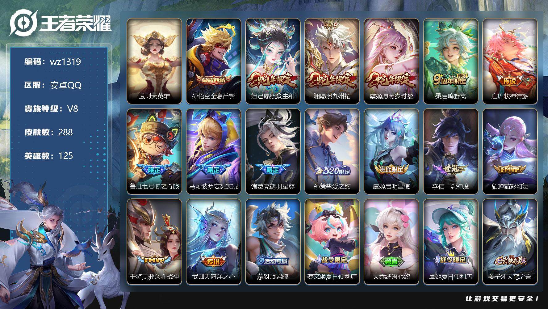 【账号佳】 【可二次实名】【wz1319】【商品标题】:安卓Q-V8-永恒钻石II段位-125英雄-288皮肤-1典藏-0珍品无双-0无双-0珍品传说-14传说-81史诗 【荣耀典藏】:武则天英雄,孙悟空全息碎影 【传说皮肤】:妲己愿照众生和,澜愿照九州拓,虞姬愿照岁时盈,桑启鸣野蒿,庄周牧神诗旅,鲁班七号时之奇旅,马可波罗妄想实况,诸葛亮鹤羽星尊,孙策挚爱之约,虞姬启明星使,李信一念神魔,貂蝉猫影幻舞,干将莫邪久胜战神,武则天海洋之心 【限定皮肤】:蒙犽顽岩魄,蔡文姬夏日便利店,大乔绒语心约,虞姬夏日便利店,姜子牙天穹之誓,杨戬破阵退雄兵,狄仁杰阴阳师,赵云皇家上将,墨子神迹守卫,妲己时之彼端,孙尚香蔷薇恋人,鲁班七号乒乒小将,鲁班七号时之奇旅,庄周高山流水,高渐离玩趣恶龙,钟无艳超时空战士,芈月幻夜卜梦,吕布御风骁将,元歌云间偶戏,夏侯惇朔风刀,夏侯惇匿光决锋者,甄姬落雪兰心,典韦岱宗,马可波罗妄想实况,狄仁杰魔术师,狄仁杰万华元夜,达摩沙漠行僧,项羽海滩派对,老夫子醍醐杖,貂蝉逐梦之音,程咬金演武夺筹,兰陵王驯魔猎人,兰陵王金庭之子,亚瑟潮玩骑士王,孙悟空美猴王,孙悟空至尊宝,孙悟空孙行者,刘备百相守梦,李元芳银河之约,李元芳匿光侦查者,李元芳云中旅人,虞姬启明星使,钟馗驱傩正仪,杨玉环遇见飞天,鬼谷子原初探秘者,鬼谷子五谷丰年,诸葛亮鹤羽星尊,黄忠火炮绅士,苏烈千军破阵,百里玄策原初追逐者,弈星混沌棋,沈梦溪大漠名商,明世隐疑决卦,裴擒虎擒涛扼浪,狂铁御狮,云中君纤云弄巧,盾山御銮,孙策挚爱之约,猪八戒西部大镖客,上官婉儿梁祝,嫦娥拒霜思,嫦娥暖冬兔眠,西施玲珑珍味,蒙犽狂想玩偶喵,鲁班大师探海日志,桑启海盐诗旅,戈娅驭风魔法,艾琳流音漫舞,司空震地狱燃心,阿古朵江河有灵,张良古海寻踪,蒙犽百解令,高渐离燃音魔法,妲己灵卜魔法,鬼谷子天穹祈灯,伽罗琥珀纪元,沈梦溪龙舞盛年,刘邦剑破天穹,程咬金群星魔术团,项羽苍威无极,周瑜熔金海岸 【年限皮肤】:孙悟空美猴王,吕布御风骁将,典韦岱宗 【赛季限定】:夏侯惇朔风刀,狄仁杰万华元夜,达摩沙漠行僧,老夫子醍醐杖,程咬金演武夺筹,兰陵王金庭之子,张良古海寻踪,李元芳云中旅人,钟馗驱傩正仪,鬼谷子原初探秘者,苏烈千军破阵,百里玄策原初追逐者,弈星混沌棋,沈梦溪大漠名商,明世隐疑决卦,裴擒虎擒涛扼浪,狂铁御狮,盾山御銮,鲁班大师探海日志,桑启海盐诗旅,鬼谷子天穹祈灯,刘邦剑破天穹,姜子牙天穹之誓 【战令限定】:墨子神迹守卫,蔡文姬夏日便利店,虞姬夏日便利店,钟无艳超时空战士,芈月幻夜卜梦,元歌云间偶戏,甄姬落雪兰心,兰陵王驯魔猎人,艾琳流音漫舞,亚瑟潮玩骑士王,李元芳银河之约,黄忠火炮绅士,猪八戒西部大镖客,嫦娥暖冬兔眠,西施玲珑珍味,蒙犽狂想玩偶喵,司空震地狱燃心,戈娅驭风魔法,高渐离燃音魔法,妲己灵卜魔法,项羽苍威无极 【史诗皮肤】:赵云皇家上将,赵云未来纪元,貂蝉圣诞恋歌,甄姬冰雪圆舞曲,王昭君偶像歌手,狄仁杰魔术师,廉颇地狱岩魂,宫本武藏鬼剑武藏,孙尚香蔷薇恋人,孙尚香水果甜心,嬴政暗夜贵公子,嬴政摇滚巨星,妲己魅力维加斯,妲己女仆咖啡,墨子金属风暴,吕布圣诞狂欢,刘禅绅士熊喵,曹操幽灵船长,李白千年之狐,吕布末日机甲,貂蝉逐梦之音,孙悟空至尊宝,花木兰水晶猎龙者,刘邦德古拉伯爵,夏侯惇乘风破浪,小乔缤纷独角兽,诸葛亮黄金分割率,亚瑟心灵战警,雅典娜冰冠公主,安琪拉心灵骇客,百里守约特工魅影,铠曙光守护者,刘禅天才门将,李元芳逐浪之夏,程咬金功夫厨神,白起星夜王子,阿轲节奏热浪,杨玉环遇见飞天,孙策猫狗日记,大乔猫狗日记,狄仁杰鹰眼统帅,兰陵王驯魔猎人,上官婉儿梁祝,李元芳银河之约,典韦岱宗,妲己时之彼端,蒙犽狂想玩偶喵,百里玄策原初追逐者,云中君纤云弄巧,元歌云间偶戏,吕布御风骁将,鲁班七号乒乒小将,孙悟空孙行者,庄周高山流水,嫦娥拒霜思,黄忠火炮绅士,夏侯惇匿光决锋者,钟无艳超时空战士,鬼谷子五谷丰年,刘备百相守梦,戈娅驭风魔法,李元芳匿光侦查者,司空震地狱燃心,阿古朵江河有灵,蒙犽百解令,妲己灵卜魔法,高渐离燃音魔法,伽罗琥珀纪元,蔡文姬夏日便利店,蒙犽顽岩魄,亚连破空之剑,马可波罗星界特工,孙膑茶境仙,弈星万物之道,阿轲化蝶舞,刘禅鸭鸭历险记,狂铁龙之律动,扁鹊灵蛊蚀心,百里守约雪豹霜爪,后羿石田雨龙,周瑜百相守梦,黄忠百相守梦 【其他皮肤】:项羽海滩派对,韩信教廷特使,韩信街头霸王,露娜哥特玫瑰,达摩大发明家,赵云白执事,赵云忍炎影,芈月红桃皇后,程咬金星际陆战队,白起白色死神,武则天东方不败,扁鹊化身博士,扁鹊救世之瞳,宫本武藏未来纪元,妲己少女阿狸,亚瑟死亡骑士,达摩拳王,孙悟空美猴王,花木兰兔女郎,张飞五福同心,甄姬花好人间,宫本武藏万象初新,后羿阿尔法小队,狄仁杰阴阳师,刘备纽约
