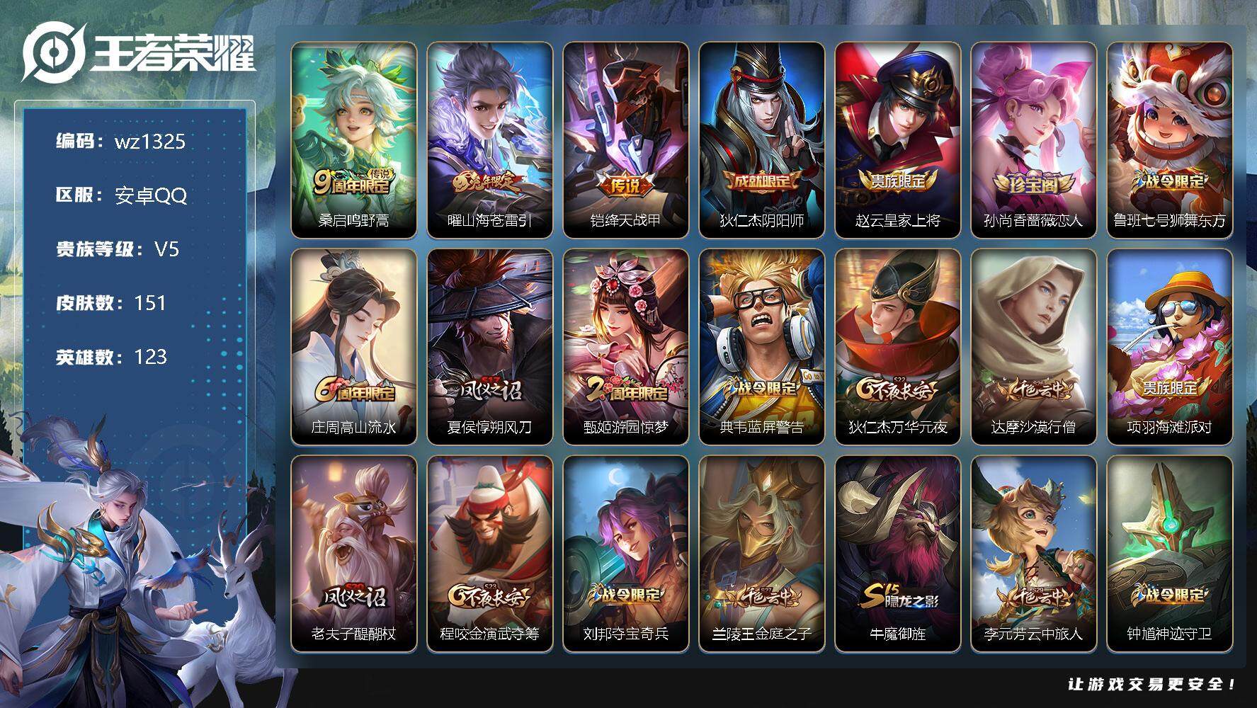 【账号佳】 【可二次实名】【wz1325】【商品标题】:安卓Q-V5-最强王者段位-123英雄-151皮肤-0典藏-0珍品无双-0无双-0珍品传说-3传说-25史诗 【传说皮肤】:桑启鸣野蒿,曜山海苍雷引,铠绛天战甲 【限定皮肤】:狄仁杰阴阳师,赵云皇家上将,孙尚香蔷薇恋人,鲁班七号狮舞东方,庄周高山流水,夏侯惇朔风刀,甄姬游园惊梦,典韦蓝屏警告,狄仁杰万华元夜,达摩沙漠行僧,项羽海滩派对,老夫子醍醐杖,程咬金演武夺筹,刘邦夺宝奇兵,兰陵王金庭之子,牛魔御旌,李元芳云中旅人,钟馗神迹守卫,钟馗驱傩正仪,女娲朔望之晖,鬼谷子原初探秘者,鬼谷子五谷丰年,苏烈千军破阵,弈星混沌棋,沈梦溪大漠名商,明世隐疑决卦,裴擒虎擒涛扼浪,米莱狄御霄,盾山御銮,曜山海苍雷引,鲁班大师探海日志,桑启海盐诗旅,张良古海寻踪,鬼谷子天穹祈灯,周瑜熔金海岸 【年限皮肤】:曜山海苍雷引 【赛季限定】:夏侯惇朔风刀,狄仁杰万华元夜,达摩沙漠行僧,老夫子醍醐杖,程咬金演武夺筹,兰陵王金庭之子,张良古海寻踪,牛魔御旌,李元芳云中旅人,钟馗驱傩正仪,鬼谷子原初探秘者,苏烈千军破阵,弈星混沌棋,沈梦溪大漠名商,明世隐疑决卦,裴擒虎擒涛扼浪,米莱狄御霄,盾山御銮,鲁班大师探海日志,桑启海盐诗旅,鬼谷子天穹祈灯 【战令限定】:鲁班七号狮舞东方,典韦蓝屏警告,刘邦夺宝奇兵,钟馗神迹守卫,女娲朔望之晖 【史诗皮肤】:赵云皇家上将,甄姬冰雪圆舞曲,孙尚香蔷薇恋人,孙尚香水果甜心,嬴政摇滚巨星,妲己魅力维加斯,墨子龙骑士,墨子金属风暴,刘禅绅士熊喵,韩信白龙吟,小乔缤纷独角兽,兰陵王暗隐猎兽者,甄姬游园惊梦,程咬金功夫厨神,白起星夜王子,阿轲节奏热浪,典韦蓝屏警告,鲁班七号狮舞东方,狄仁杰鹰眼统帅,庄周高山流水,鬼谷子五谷丰年,百里守约百相守梦,孙膑茶境仙,狂铁龙之律动,黄忠百相守梦 【其他皮肤】:项羽海滩派对,韩信教廷特使,韩信街头霸王,达摩大发明家,芈月红桃皇后,白起白色死神,牛魔西部大镖客,扁鹊化身博士,宫本武藏未来纪元,孙膑天使之翼,姜子牙时尚教父,妲己少女阿狸,典韦黄金武士,亚瑟死亡骑士,甄姬花好人间,刘备万事如意,后羿阿尔法小队,狄仁杰阴阳师,刘备汉昭烈帝,关羽龙腾万里,钟无艳海滩丽影,老夫子功夫老勺,鬼谷子幻乐之宴,苏烈坚韧之力,大乔守护之力,项羽科学大爆炸,米莱狄御霄,明世隐虹云星官,庄周奇妙博物学,牛魔御旌,女娲朔望之晖,小乔丁香结,钟馗神迹守卫,盾山御銮,沈梦溪鲨炮海盗猫,姜子牙炽热元素使,夏侯惇朔风刀,弈星混沌棋,哪吒次元突破,明世隐疑决卦,刘邦夺宝奇兵,老夫子醍醐杖,狂铁特工战影,鬼谷子原初探秘者,狄仁杰万华元夜,程咬金演武夺筹,钟馗驱傩正仪,苏烈千军破阵,达摩沙漠行僧,兰陵王金庭之子,沈梦溪大漠名商,李元芳云中旅人,桑启海盐诗旅,猪八戒潮玩探月行,赵怀真太极少年,裴擒虎擒涛扼浪,鲁班大师探海日志,李元芳妄想特派,张良古海寻踪,鬼谷子天穹祈灯,廉颇功夫炙烤,周瑜熔金海岸,东皇太一噬灭天穹,老夫子百相守梦,苍苍林狼骑,太乙真人谧流熔炉,典韦铁骨偃魂,马超访茗客,西施雪境奇遇,明世隐景韶洛都,戈娅玫蓝誓约,钟馗虚灵犬护,张良灵野札记,阿古朵布丁狗之约,露娜命运加冕,甄姬逆浪荇歌,庄周锦麟游梦,空空儿戏梦巡演,高渐离落日弦歌,莱西奥踏浪烽翎,鲁班七号福禄兄弟,鲁班七号木偶奇遇记,高渐离金属狂潮,貂蝉异域舞娘,王昭君精灵公主,狄仁杰锦衣卫,孙膑未来旅行,孙悟空西部大镖客,后羿精灵王,刘禅英喵野望,李元芳特种部队,关羽天启骑士,夏侯惇战争骑士,雅典娜战争女神,马可波罗激情绿茵,苍维京掠夺者,杨戬埃及法老,哪吒三太子,黄忠芝加哥教父,干将莫邪第七人偶,鬼谷子阿摩司公爵,铠龙域领主,百里玄策威尼斯狂欢,明世隐占星师,公孙离花间舞,裴擒虎街头旋风,元歌午夜歌剧院,孙策海之征途,盾山极冰防御线,伽罗花见巫女,沈梦溪棒球奇才,李信灼热之刃,猪八戒年年有余,盘古创世神祝,云中君荷鲁斯之眼,曜归虚梦演,马超幸存者,蒙犽归虚梦演,镜冰刃幻境,澜孤猎,司空震启蛰,云缨赤焰之缨,桑启画中游 【内测皮肤】:孙尚香蔷薇恋人,狂铁特工战影 【营地ID】:2113691052