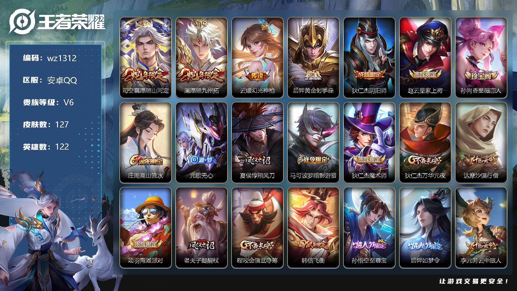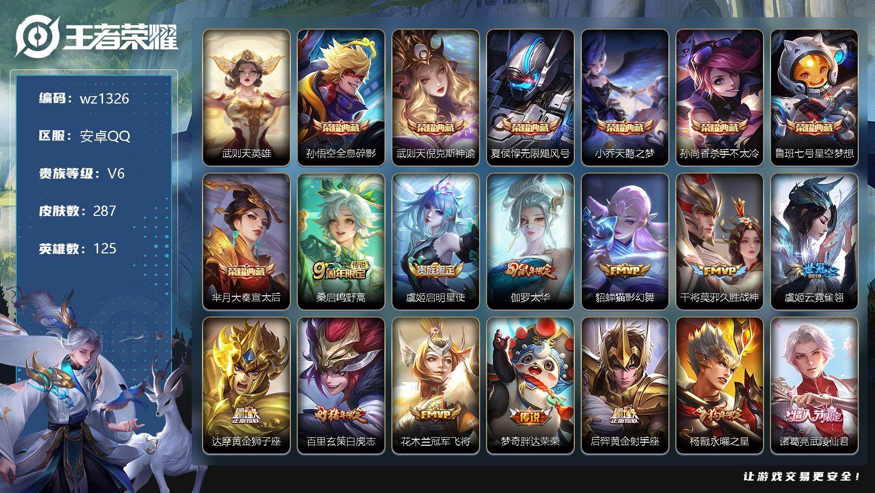 【账号佳】 【可二次实名】【wz1326】【商品标题】:安卓Q-V6-至尊星耀I段位-125英雄-287皮肤-7典藏-0珍品无双-0无双-0珍品传说-20传说-77史诗 【荣耀典藏】:武则天英雄,孙悟空全息碎影,武则天倪克斯神谕,夏侯惇无限飓风号,小乔天鹅之梦,孙尚香杀手不太冷,鲁班七号星空梦想,芈月大秦宣太后 【传说皮肤】:桑启鸣野蒿,虞姬启明星使,伽罗太华,貂蝉猫影幻舞,干将莫邪久胜战神,虞姬云霓雀翎,达摩黄金狮子座,百里玄策白虎志,花木兰冠军飞将,梦奇胖达荣荣,后羿黄金射手座,杨戬永曜之星,诸葛亮武陵仙君,貂蝉仲夏夜之梦,李白凤求凰,宫本武藏地狱之眼,孙悟空地狱火,吕布天魔缭乱,武则天海洋之心,狄仁杰超时空战士 【限定皮肤】:白起狰,狄仁杰阴阳师,虞姬凯尔特女王,赵云皇家上将,赵云龙胆,妲己时之彼端,嬴政白昼王子,鲁班七号狮舞东方,庄周云端筑梦师,庄周玄嵩,高渐离死亡摇滚,高渐离玩趣恶龙,钟无艳王者之锤,孙膑妖精王,扁鹊炼金王,芈月重明,吕布天魔缭乱,吕布猎兽之王,周瑜赤莲之焰,元歌云间偶戏,夏侯惇朔风刀,甄姬幽恒,甄姬游园惊梦,曹操烛龙,典韦穷奇,典韦蓝屏警告,典韦岱宗,狄仁杰魔术师,狄仁杰万华元夜,项羽海滩派对,老夫子醍醐杖,安琪拉魔法小厨娘,程咬金演武夺筹,露娜一生所爱,韩信逐梦之影,韩信飞衡,兰陵王驯魔猎人,花木兰青春决赛季,花木兰瑞麟志,亚瑟潮玩骑士王,孙悟空至尊宝,牛魔御旌,后羿辉光之辰,后羿如梦令,李元芳银河之约,虞姬霸王别姬,虞姬启明星使,钟馗神迹守卫,钟馗驱傩正仪,杨玉环遇见飞天,杨戬永曜之星,女娲朔望之晖,哪吒逐梦之翼,雅典娜黎明之约,蔡文姬繁星吟游,太乙真人饕餮,鬼谷子原初探秘者,诸葛亮武陵仙君,黄忠烈魂,苏烈玄武志,百里玄策白虎志,百里玄策原初追逐者,百里守约朱雀志,弈星混沌棋,沈梦溪星空之诺,明世隐疑决卦,裴擒虎天狼狩猎者,裴擒虎李小龙,狂铁御狮,米莱狄御霄,云中君纤云弄巧,伽罗太华,盾山御銮,上官婉儿梁祝,嫦娥如梦令,鲁班大师探海日志,张良古海寻踪,鬼谷子天穹祈灯,刘邦剑破天穹,周瑜熔金海岸 【年限皮肤】:百里玄策白虎志,百里守约朱雀志,花木兰瑞麟志,苏烈玄武志,李白凤求凰,杨戬永曜之星,后羿辉光之辰,伽罗太华,甄姬幽恒,韩信飞衡,典韦岱宗,庄周玄嵩,黄忠烈魂,赵云龙胆 【赛季限定】:孙膑妖精王,扁鹊炼金王,白起狰,芈月重明,夏侯惇朔风刀,曹操烛龙,典韦穷奇,狄仁杰万华元夜,老夫子醍醐杖,程咬金演武夺筹,张良古海寻踪,牛魔御旌,虞姬凯尔特女王,钟馗驱傩正仪,雅典娜黎明之约,太乙真人饕餮,鬼谷子原初探秘者,百里玄策原初追逐者,弈星混沌棋,明世隐疑决卦,狂铁御狮,米莱狄御霄,盾山御銮,鲁班大师探海日志,鬼谷子天穹祈灯,刘邦剑破天穹 【战令限定】:嬴政白昼王子,鲁班七号狮舞东方,吕布猎兽之王,周瑜赤莲之焰,元歌云间偶戏,典韦蓝屏警告,兰陵王驯魔猎人,亚瑟潮玩骑士王,李元芳银河之约,钟馗神迹守卫,女娲朔望之晖,沈梦溪星空之诺 【史诗皮肤】:项羽苍穹之光,露娜紫霞仙子,钟无艳王者之锤,赵云皇家上将,赵云未来纪元,貂蝉圣诞恋歌,甄姬冰雪圆舞曲,王昭君偶像歌手,狄仁杰魔术师,廉颇地狱岩魂,宫本武藏鬼剑武藏,孙尚香水果甜心,嬴政摇滚巨星,妲己魅力维加斯,妲己女仆咖啡,墨子金属风暴,刘禅绅士熊喵,曹操幽灵船长,李白千年之狐,安琪拉魔法小厨娘,张飞乱世虎臣,韩信白龙吟,虞姬霸王别姬,孙悟空至尊宝,花木兰水晶猎龙者,刘邦德古拉伯爵,韩信逐梦之影,夏侯惇乘风破浪,小乔缤纷独角兽,兰陵王暗隐猎兽者,诸葛亮黄金分割率,甄姬游园惊梦,雅典娜冰冠公主,后羿辉光之辰,庄周云端筑梦师,花木兰青春决赛季,铠曙光守护者,蔡文姬舞动绿茵,哪吒逐梦之翼,刘禅天才门将,李元芳逐浪之夏,程咬金功夫厨神,白起星夜王子,阿轲节奏热浪,杨玉环遇见飞天,嬴政白昼王子,孙策猫狗日记,百里守约朱雀志,露娜一生所爱,苏烈玄武志,花木兰瑞麟志,典韦蓝屏警告,裴擒虎天狼狩猎者,鲁班七号狮舞东方,狄仁杰鹰眼统帅,公孙离无限星赏官,兰陵王驯魔猎人,上官婉儿梁祝,蔡文姬繁星吟游,李元芳银河之约,娜可露露晚萤,韩信飞衡,典韦岱宗,妲己时之彼端,甄姬幽恒,庄周玄嵩,嫦娥如梦令,后羿如梦令,橘右京修罗,赵云龙胆,黄忠烈魂,百里玄策原初追逐者,裴擒虎李小龙,云中君纤云弄巧,元歌云间偶戏,雅典娜黎明之约,后羿石田雨龙 【其他皮肤】:项羽海滩派对,韩信教廷特使,韩信街头霸王,露娜哥特玫瑰,阿轲致命风华,阿轲爱心护理,达摩大发明家,赵云忍炎影,芈月红桃皇后,程咬金星际陆战队,程咬金爱与正义,白起白色死神,牛魔西部大镖客,扁鹊化身博士,扁鹊救世之瞳,庄周鲤鱼之梦,安琪拉玩偶对对碰,孙膑天使之翼,姜子牙时尚教父,妲己少女阿狸,典韦黄金武士,亚瑟死亡骑士,达摩拳王,花木兰兔女郎,张飞五福同心,甄姬花好人间