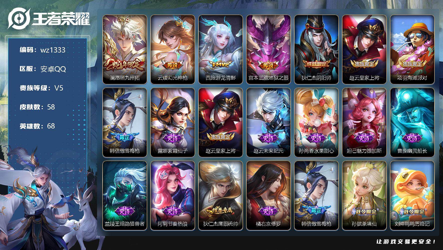 【账号佳】 【可二次实名】【wz1333】【商品标题】:安卓Q-V5-至尊星耀IV段位-68英雄-58皮肤-0典藏-0珍品无双-0无双-0珍品传说-4传说-15史诗 【传说皮肤】:澜愿照九州拓,云缨幻光神枪,西施游龙清影,宫本武藏地狱之眼 【限定皮肤】:狄仁杰阴阳师,赵云皇家上将,项羽海滩派对,韩信傲雪梅枪 【史诗皮肤】:露娜紫霞仙子,赵云皇家上将,赵云未来纪元,孙尚香水果甜心,妲己魅力维加斯,曹操幽灵船长,兰陵王暗隐猎兽者,阿轲节奏热浪,狄仁杰鹰眼统帅,橘右京修罗,韩信傲雪梅枪,孙膑茶境仙,刘禅鸭鸭历险记,狂铁龙之律动,黄忠百相守梦 【其他皮肤】:项羽海滩派对,赵云忍炎影,芈月红桃皇后,姜子牙时尚教父,典韦黄金武士,亚瑟死亡骑士,达摩拳王,花木兰兔女郎,甄姬花好人间,狄仁杰阴阳师,吕布野性能量,马可波罗潮玩牛仔,海月幻泉雾影,莱西奥西部游侠,朵莉亚金色潮汐,太乙真人谧流熔炉,马超访茗客,西施雪境奇遇,东皇太一金福满堂,达摩爆裂喵拳,少司缘灵卦秘语,戈娅玫蓝誓约,钟馗虚灵犬护,沈梦溪鸭鸭历险记,苏烈春野闲踪,张良灵野札记,阿古朵布丁狗之约,露娜命运加冕,雅典娜潮玩士官长,甄姬逆浪荇歌,庄周锦麟游梦,莱西奥踏浪烽翎,老夫子潮流仙人,张良一千零一夜,小乔万圣前夜,孙悟空西部大镖客,钟馗地府判官,孙策海之征途,李信灼热之刃 【营地ID】:1622749129