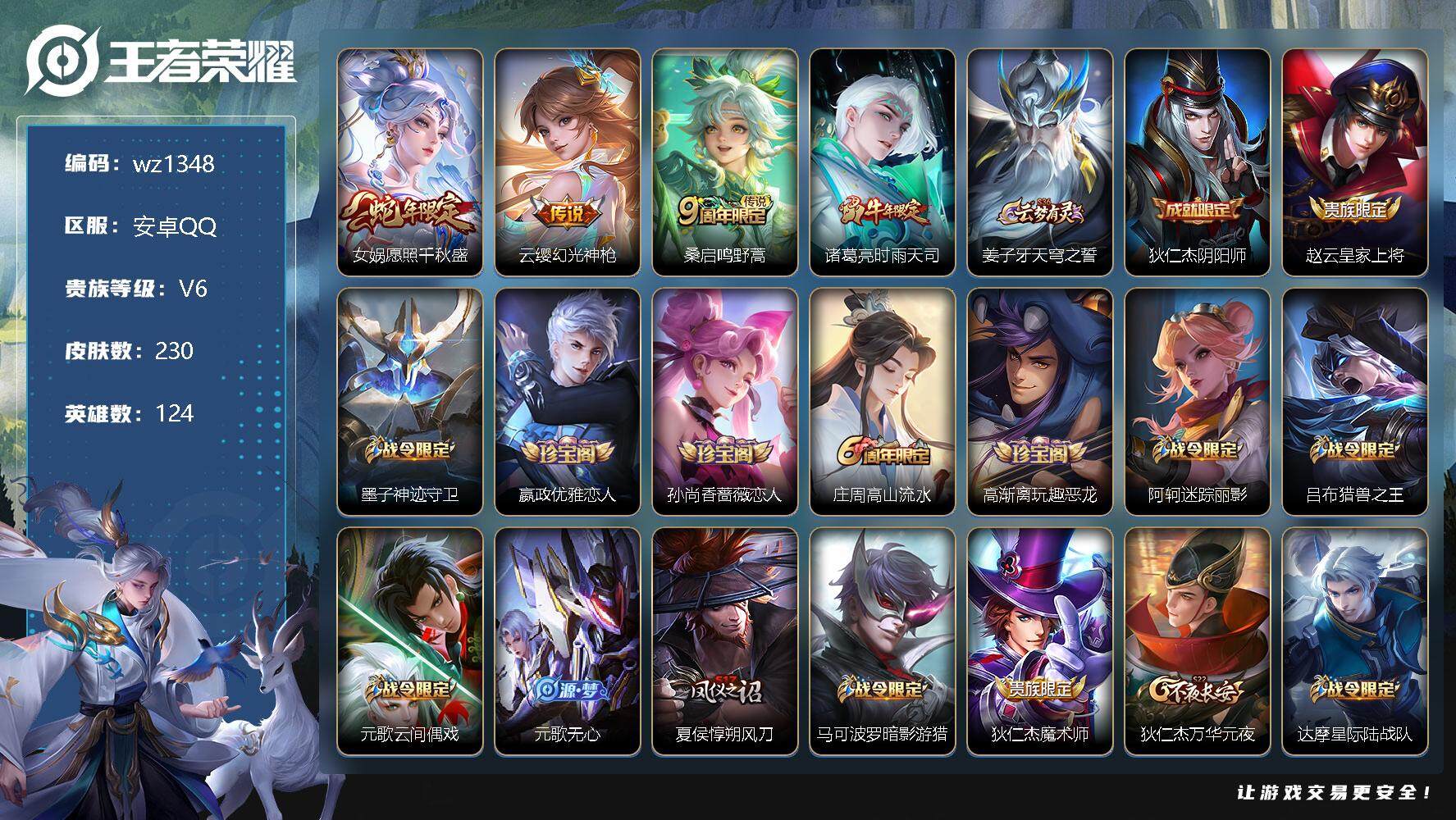 【账号佳】 【可二次实名】【wz1348】【商品标题】:安卓Q-V6-永恒钻石V段位-124英雄-230皮肤-0典藏-0珍品无双-0无双-0珍品传说-4传说-57史诗 【传说皮肤】:女娲愿照千秋盛,云缨幻光神枪,桑启鸣野蒿,诸葛亮时雨天司 【限定皮肤】:姜子牙天穹之誓,狄仁杰阴阳师,赵云皇家上将,墨子神迹守卫,嬴政优雅恋人,孙尚香蔷薇恋人,庄周高山流水,高渐离玩趣恶龙,阿轲迷踪丽影,吕布猎兽之王,元歌云间偶戏,元歌无心,夏侯惇朔风刀,马可波罗暗影游猎,狄仁杰魔术师,狄仁杰万华元夜,达摩星际陆战队,达摩沙漠行僧,项羽海滩派对,老夫子醍醐杖,老夫子航海奇遇记,程咬金演武夺筹,刘邦夺宝奇兵,韩信飞衡,兰陵王金庭之子,亚瑟潮玩骑士王,孙悟空至尊宝,后羿圣弓游侠,李元芳云中旅人,钟馗驱傩正仪,干将莫邪真爱魔法,雅典娜黎明之约,蔡文姬繁星吟游,太乙真人华丽摇滚,鬼谷子原初探秘者,鬼谷子五谷丰年,诸葛亮时雨天司,苏烈千军破阵,百里玄策原初追逐者,弈星混沌棋,梦奇顽趣,沈梦溪大漠名商,明世隐疑决卦,裴擒虎李小龙,裴擒虎擒涛扼浪,米莱狄胡桃异想国,云中君纤云弄巧,猪八戒西部大镖客,猪八戒猪悟能,鲁班大师探海日志,桑启海盐诗旅,张良古海寻踪,蒙恬荣光圣徽,高渐离燃音魔法,妲己灵卜魔法,鬼谷子天穹祈灯,沈梦溪龙舞盛年,刘邦剑破天穹,程咬金群星魔术团,周瑜熔金海岸 【年限皮肤】:诸葛亮时雨天司,韩信飞衡 【赛季限定】:夏侯惇朔风刀,狄仁杰万华元夜,达摩沙漠行僧,老夫子醍醐杖,程咬金演武夺筹,兰陵王金庭之子,张良古海寻踪,李元芳云中旅人,钟馗驱傩正仪,雅典娜黎明之约,鬼谷子原初探秘者,苏烈千军破阵,百里玄策原初追逐者,弈星混沌棋,梦奇顽趣,沈梦溪大漠名商,明世隐疑决卦,裴擒虎擒涛扼浪,鲁班大师探海日志,桑启海盐诗旅,鬼谷子天穹祈灯,蒙恬荣光圣徽,刘邦剑破天穹,姜子牙天穹之誓 【战令限定】:墨子神迹守卫,阿轲迷踪丽影,吕布猎兽之王,元歌云间偶戏,马可波罗暗影游猎,达摩星际陆战队,老夫子航海奇遇记,刘邦夺宝奇兵,亚瑟潮玩骑士王,后羿圣弓游侠,干将莫邪真爱魔法,米莱狄胡桃异想国,猪八戒西部大镖客,高渐离燃音魔法,妲己灵卜魔法 【史诗皮肤】:赵云皇家上将,赵云未来纪元,貂蝉圣诞恋歌,甄姬冰雪圆舞曲,狄仁杰魔术师,宫本武藏鬼剑武藏,孙尚香蔷薇恋人,孙尚香水果甜心,嬴政优雅恋人,嬴政摇滚巨星,妲己女仆咖啡,墨子金属风暴,吕布圣诞狂欢,刘禅绅士熊喵,曹操幽灵船长,张飞乱世虎臣,孙悟空至尊宝,花木兰水晶猎龙者,夏侯惇乘风破浪,小乔缤纷独角兽,兰陵王暗隐猎兽者,诸葛亮黄金分割率,亚瑟心灵战警,百里守约特工魅影,铠曙光守护者,蔡文姬舞动绿茵,刘禅天才门将,李元芳逐浪之夏,程咬金功夫厨神,白起星夜王子,阿轲节奏热浪,孙策猫狗日记,伽罗箭羽风息,狄仁杰鹰眼统帅,公孙离无限星赏官,蔡文姬繁星吟游,韩信飞衡,阿轲迷踪丽影,马可波罗暗影游猎,百里玄策原初追逐者,裴擒虎李小龙,云中君纤云弄巧,元歌云间偶戏,米莱狄胡桃异想国,老夫子航海奇遇记,干将莫邪真爱魔法,猪八戒猪悟能,庄周高山流水,雅典娜黎明之约,鬼谷子五谷丰年,元歌无心,梦奇顽趣,妲己灵卜魔法,高渐离燃音魔法,蒙恬荣光圣徽,姬小满战舞者,狂铁龙之律动,黄忠百相守梦 【其他皮肤】:项羽海滩派对,韩信教廷特使,韩信街头霸王,露娜哥特玫瑰,达摩大发明家,赵云忍炎影,芈月红桃皇后,白起白色死神,牛魔西部大镖客,扁鹊化身博士,宫本武藏未来纪元,安琪拉玩偶对对碰,孙膑天使之翼,姜子牙时尚教父,妲己少女阿狸,典韦黄金武士,达摩拳王,花木兰兔女郎,甄姬花好人间,刘备万事如意,宫本武藏万象初新,后羿阿尔法小队,狄仁杰阴阳师,刘备纽约教父,刘备汉昭烈帝,关羽龙腾万里,钟无艳海滩丽影,宫本武藏霸王丸,狂铁命运角斗场,老夫子功夫老勺,孙尚香沉稳之力,诸葛亮掌控之力,李白敏锐之力,鬼谷子幻乐之宴,太乙真人华丽摇滚,苏烈坚韧之力,大乔守护之力,项羽科学大爆炸,吕布猎兽之王,明世隐虹云星官,小乔丁香结,孙膑归虚梦演,高渐离玩趣恶龙,沈梦溪鲨炮海盗猫,姜子牙炽热元素使,夏侯惇朔风刀,弈星混沌棋,哪吒次元突破,鲁班七号黑桃队长,明世隐疑决卦,刘邦夺宝奇兵,盾山圆桌骑士,老夫子醍醐杖,猪八戒西部大镖客,狂铁特工战影,廉颇无尽征程,鬼谷子原初探秘者,狄仁杰万华元夜,亚瑟潮玩骑士王,刘禅秘密基地,杨戬次元傲视,达摩星际陆战队,程咬金演武夺筹,张良缤纷绘卷,盘古重装意志,钟馗驱傩正仪,墨子神迹守卫,鲁班大师乓乓大师,苏烈千军破阵,后羿圣弓游侠,妲己紫罗兰之誓,马可波罗潮玩牛仔,达摩沙漠行僧,程咬金无双福将,兰陵王金庭之子,沈梦溪大漠名商,蒙恬蔚蓝守将,李元芳云中旅人,桑启海盐诗旅,海月幻泉雾影,猪八戒潮玩探月行,裴擒虎擒涛扼浪,太乙真人劲辣红锅,莱西奥西部游侠,鲁班大师探海日志,姬小满零食