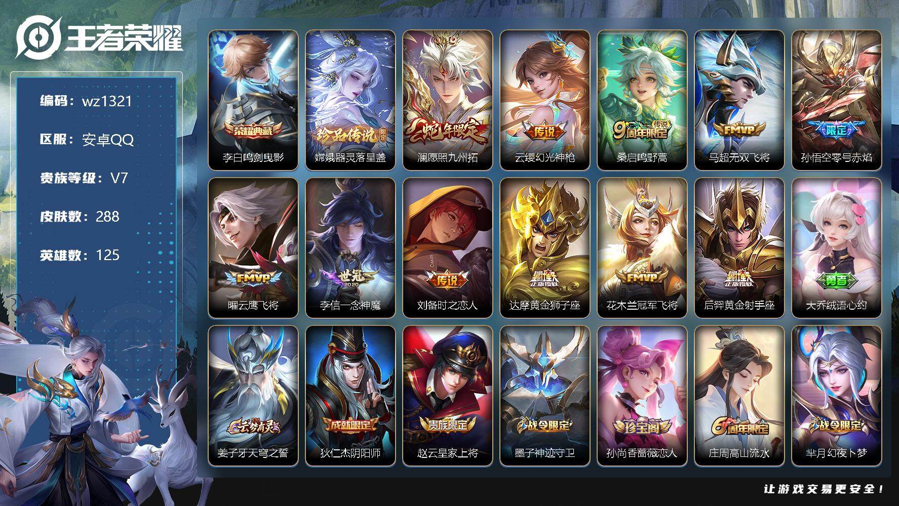 【账号佳】 【可二次实名】【wz1321】【商品标题】:安卓Q-V7-最强王者段位-125英雄-288皮肤-1典藏-0珍品无双-0无双-1珍品传说-11传说-68史诗 【荣耀典藏】:李白鸣剑曳影 【珍品传说】:嫦娥器灵落星盏 【传说皮肤】:澜愿照九州拓,云缨幻光神枪,桑启鸣野蒿,马超无双飞将,孙悟空零号赤焰,曜云鹰飞将,李信一念神魔,刘备时之恋人,达摩黄金狮子座,花木兰冠军飞将,后羿黄金射手座 【限定皮肤】:大乔绒语心约,姜子牙天穹之誓,狄仁杰阴阳师,赵云皇家上将,墨子神迹守卫,孙尚香蔷薇恋人,庄周高山流水,芈月幻夜卜梦,元歌云间偶戏,元歌无心,甄姬游园惊梦,马可波罗山海玄木吟,狄仁杰魔术师,狄仁杰万华元夜,达摩星际陆战队,达摩沙漠行僧,项羽海滩派对,老夫子航海奇遇记,程咬金演武夺筹,兰陵王金庭之子,亚瑟潮玩骑士王,孙悟空至尊宝,孙悟空零号赤焰,孙悟空孙行者,后羿圣弓游侠,李元芳云中旅人,钟馗驱傩正仪,干将莫邪胡桃夹子,干将莫邪真爱魔法,雅典娜单词大作战,雅典娜黎明之约,鬼谷子原初探秘者,鬼谷子五谷丰年,黄忠火炮绅士,苏烈千军破阵,百里玄策原初追逐者,沈梦溪大漠名商,裴擒虎李小龙,裴擒虎擒涛扼浪,米莱狄胡桃异想国,云中君纤云弄巧,上官婉儿梁祝,嫦娥拒霜思,鲁班大师探海日志,桑启海盐诗旅,艾琳女武神,阿古朵江河有灵,张良古海寻踪,蒙犽百解令,鬼谷子天穹祈灯,沈梦溪龙舞盛年,刘邦剑破天穹,程咬金群星魔术团,周瑜熔金海岸 【年限皮肤】:马可波罗山海玄木吟 【赛季限定】:狄仁杰万华元夜,达摩沙漠行僧,程咬金演武夺筹,兰陵王金庭之子,张良古海寻踪,李元芳云中旅人,钟馗驱傩正仪,雅典娜黎明之约,鬼谷子原初探秘者,苏烈千军破阵,百里玄策原初追逐者,沈梦溪大漠名商,裴擒虎擒涛扼浪,鲁班大师探海日志,桑启海盐诗旅,鬼谷子天穹祈灯,刘邦剑破天穹,姜子牙天穹之誓 【战令限定】:墨子神迹守卫,芈月幻夜卜梦,元歌云间偶戏,达摩星际陆战队,老夫子航海奇遇记,亚瑟潮玩骑士王,后羿圣弓游侠,干将莫邪真爱魔法,雅典娜单词大作战,黄忠火炮绅士,米莱狄胡桃异想国 【史诗皮肤】:鲁班七号电玩小子,露娜紫霞仙子,阿轲暗夜猫娘,赵云皇家上将,貂蝉圣诞恋歌,甄姬冰雪圆舞曲,王昭君偶像歌手,狄仁杰魔术师,宫本武藏鬼剑武藏,孙尚香蔷薇恋人,孙尚香水果甜心,嬴政摇滚巨星,墨子金属风暴,吕布圣诞狂欢,刘禅绅士熊喵,曹操幽灵船长,孙悟空至尊宝,花木兰水晶猎龙者,刘邦德古拉伯爵,夏侯惇乘风破浪,小乔缤纷独角兽,兰陵王暗隐猎兽者,诸葛亮黄金分割率,甄姬游园惊梦,亚瑟心灵战警,雅典娜冰冠公主,安琪拉心灵骇客,铠曙光守护者,蔡文姬舞动绿茵,刘禅天才门将,李元芳逐浪之夏,程咬金功夫厨神,白起星夜王子,阿轲节奏热浪,大乔猫狗日记,伽罗箭羽风息,狄仁杰鹰眼统帅,上官婉儿梁祝,娜可露露晚萤,小乔青蛇,瑶遇见神鹿,孙尚香时之恋人,百里玄策原初追逐者,裴擒虎李小龙,云中君纤云弄巧,元歌云间偶戏,米莱狄胡桃异想国,老夫子航海奇遇记,干将莫邪真爱魔法,安琪拉时之奇旅,孙悟空孙行者,庄周高山流水,嫦娥拒霜思,黄忠火炮绅士,雅典娜黎明之约,夏洛特永昼,澜赏金猎手,鬼谷子五谷丰年,元歌无心,马可波罗山海玄木吟,刘禅电玩爆裂旋风,阿古朵江河有灵,蒙犽百解令,赵怀真器灵浮梦炉,阿轲化蝶舞,刘禅鸭鸭历险记,周瑜百相守梦,黄忠百相守梦 【其他皮肤】:项羽海滩派对,韩信教廷特使,韩信街头霸王,露娜哥特玫瑰,阿轲爱心护理,达摩大发明家,赵云忍炎影,芈月红桃皇后,艾琳女武神,程咬金星际陆战队,白起白色死神,武则天东方不败,扁鹊化身博士,扁鹊救世之瞳,宫本武藏未来纪元,安琪拉玩偶对对碰,孙膑天使之翼,姜子牙时尚教父,妲己少女阿狸,典韦黄金武士,亚瑟死亡骑士,达摩拳王,花木兰兔女郎,甄姬花好人间,刘备万事如意,宫本武藏万象初新,狄仁杰阴阳师,刘备纽约教父,刘备汉昭烈帝,关羽龙腾万里,钟无艳海滩丽影,狂铁命运角斗场,老夫子功夫老勺,牛魔制霸全明星,孙尚香沉稳之力,诸葛亮掌控之力,李白敏锐之力,鬼谷子幻乐之宴,苏烈坚韧之力,大乔守护之力,明世隐虹云星官,庄周奇妙博物学,小乔丁香结,吕布野性能量,孙膑归虚梦演,沈梦溪鲨炮海盗猫,哪吒次元突破,鲁班七号黑桃队长,盾山圆桌骑士,狂铁特工战影,鬼谷子原初探秘者,雅典娜单词大作战,狄仁杰万华元夜,亚瑟潮玩骑士王,刘禅秘密基地,杨戬次元傲视,露娜瓷语鉴心,达摩星际陆战队,程咬金演武夺筹,张良缤纷绘卷,盘古重装意志,钟馗驱傩正仪,墨子神迹守卫,鲁班大师乓乓大师,苏烈千军破阵,后羿圣弓游侠,妲己紫罗兰之誓,干将莫邪胡桃夹子,马可波罗潮玩牛仔,达摩沙漠行僧,芈月幻夜卜梦,程咬金无双福将,刘邦虎啸剑宗,兰陵王金庭之子,沈梦溪大漠名商,李元芳云中旅人,桑启海盐诗旅,海月幻泉雾影,猪八戒潮玩探月行,赵怀真太极少年,裴擒虎擒涛扼浪