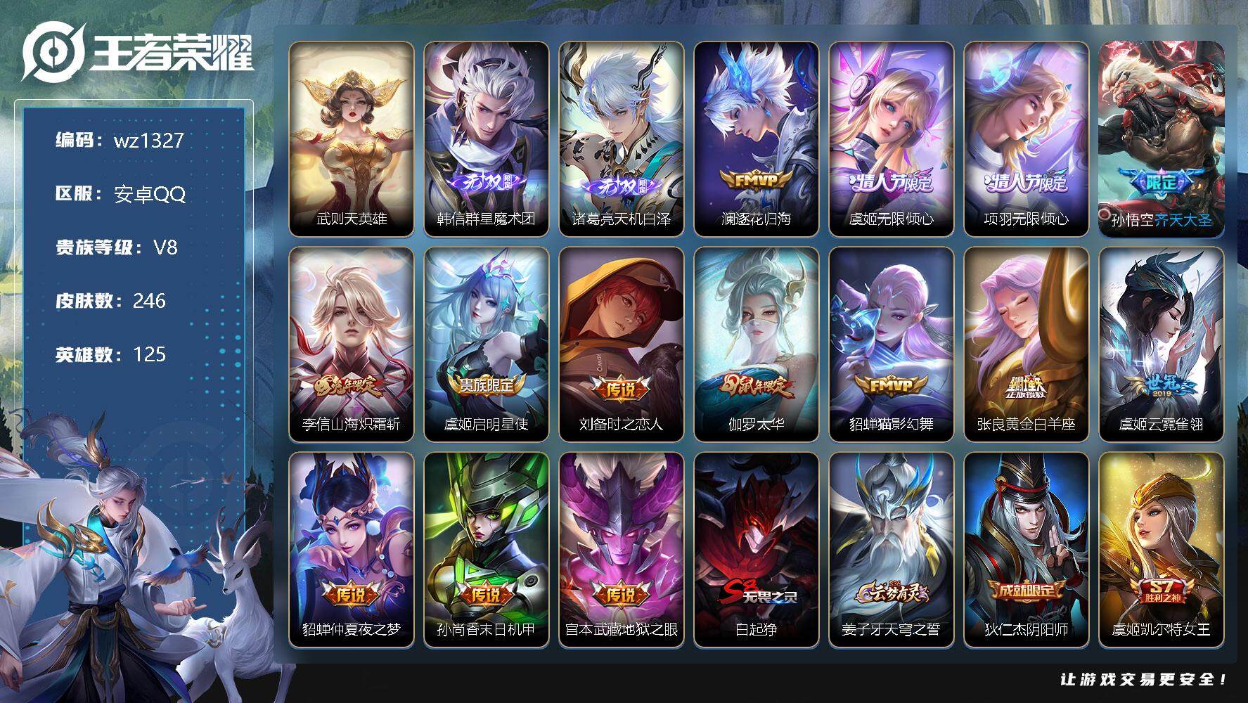 【账号佳】 【可二次实名】【wz1327】【商品标题】:安卓Q-V8-最强王者段位-125英雄-246皮肤-0典藏-0珍品无双-2无双-0珍品传说-14传说-69史诗 【荣耀典藏】:武则天英雄 【无双皮肤】:韩信群星魔术团,诸葛亮天机白泽 【传说皮肤】:澜逐花归海,虞姬无限倾心,项羽无限倾心,孙悟空齐天大圣,李信山海炽霜斩,虞姬启明星使,刘备时之恋人,伽罗太华,貂蝉猫影幻舞,张良黄金白羊座,虞姬云霓雀翎,貂蝉仲夏夜之梦,孙尚香末日机甲,宫本武藏地狱之眼 【限定皮肤】:白起狰,姜子牙天穹之誓,狄仁杰阴阳师,虞姬凯尔特女王,赵云皇家上将,赵云龙胆,孙尚香蔷薇恋人,鲁班七号狮舞东方,庄周高山流水,芈月重明,周瑜赤莲之焰,元歌云间偶戏,元歌无心,夏侯惇朔风刀,曹操烛龙,典韦穷奇,典韦蓝屏警告,马可波罗山海玄木吟,狄仁杰魔术师,达摩沙漠行僧,项羽海滩派对,项羽无限倾心,露娜一生所爱,韩信飞衡,兰陵王驯魔猎人,兰陵王金庭之子,孙悟空大圣娶亲,孙悟空齐天大圣,牛魔御旌,李元芳银河之约,李元芳云中旅人,虞姬启明星使,虞姬无限倾心,钟馗神迹守卫,钟馗驱傩正仪,女娲朔望之晖,蔡文姬繁星吟游,鬼谷子五谷丰年,黄忠烈魂,苏烈千军破阵,弈星混沌棋,沈梦溪星空之诺,明世隐疑决卦,裴擒虎天狼狩猎者,裴擒虎李小龙,裴擒虎擒涛扼浪,米莱狄御霄,瑶山海碧波行,李信山海炽霜斩,伽罗太华,盾山御銮,上官婉儿梁祝,嫦娥拒霜思,嫦娥暖冬兔眠,鲁班大师探海日志,桑启海盐诗旅,暃星界游侠,张良古海寻踪,鬼谷子天穹祈灯,韩信群星魔术团,镜青焰无极,周瑜熔金海岸 【年限皮肤】:伽罗太华,韩信飞衡,黄忠烈魂,赵云龙胆,瑶山海碧波行,马可波罗山海玄木吟,李信山海炽霜斩 【赛季限定】:白起狰,芈月重明,夏侯惇朔风刀,曹操烛龙,典韦穷奇,达摩沙漠行僧,兰陵王金庭之子,张良古海寻踪,牛魔御旌,李元芳云中旅人,虞姬凯尔特女王,钟馗驱傩正仪,苏烈千军破阵,弈星混沌棋,明世隐疑决卦,裴擒虎擒涛扼浪,米莱狄御霄,盾山御銮,鲁班大师探海日志,桑启海盐诗旅,鬼谷子天穹祈灯,姜子牙天穹之誓 【战令限定】:鲁班七号狮舞东方,周瑜赤莲之焰,元歌云间偶戏,典韦蓝屏警告,兰陵王驯魔猎人,李元芳银河之约,钟馗神迹守卫,女娲朔望之晖,沈梦溪星空之诺,嫦娥暖冬兔眠,暃星界游侠,镜青焰无极 【史诗皮肤】:露娜紫霞仙子,赵云皇家上将,貂蝉圣诞恋歌,甄姬冰雪圆舞曲,狄仁杰魔术师,廉颇地狱岩魂,孙尚香蔷薇恋人,孙尚香水果甜心,嬴政暗夜贵公子,嬴政摇滚巨星,妲己魅力维加斯,妲己女仆咖啡,墨子龙骑士,墨子金属风暴,吕布圣诞狂欢,刘禅绅士熊喵,曹操幽灵船长,李白千年之狐,吕布末日机甲,张飞乱世虎臣,花木兰水晶猎龙者,刘邦德古拉伯爵,夏侯惇乘风破浪,小乔缤纷独角兽,兰陵王暗隐猎兽者,诸葛亮黄金分割率,亚瑟心灵战警,雅典娜冰冠公主,安琪拉心灵骇客,百里守约特工魅影,铠曙光守护者,蔡文姬舞动绿茵,刘禅天才门将,李元芳逐浪之夏,程咬金功夫厨神,白起星夜王子,阿轲节奏热浪,孙策猫狗日记,露娜一生所爱,孙悟空大圣娶亲,典韦蓝屏警告,裴擒虎天狼狩猎者,鲁班七号狮舞东方,狄仁杰鹰眼统帅,公孙离无限星赏官,兰陵王驯魔猎人,上官婉儿梁祝,蔡文姬繁星吟游,李元芳银河之约,娜可露露晚萤,韩信飞衡,不知火舞魅语,橘右京修罗,赵云龙胆,黄忠烈魂,孙尚香时之恋人,裴擒虎李小龙,元歌云间偶戏,庄周高山流水,嫦娥拒霜思,鬼谷子五谷丰年,元歌无心,暃星界游侠,马可波罗山海玄木吟,瑶山海碧波行,镜青焰无极,狂铁龙之律动,周瑜百相守梦,黄忠百相守梦 【其他皮肤】:项羽海滩派对,韩信教廷特使,韩信街头霸王,露娜哥特玫瑰,阿轲爱心护理,达摩大发明家,赵云忍炎影,芈月红桃皇后,程咬金星际陆战队,程咬金爱与正义,白起白色死神,牛魔西部大镖客,扁鹊化身博士,扁鹊救世之瞳,庄周鲤鱼之梦,宫本武藏未来纪元,安琪拉玩偶对对碰,姜子牙时尚教父,妲己少女阿狸,典韦黄金武士,亚瑟死亡骑士,达摩拳王,花木兰兔女郎,张飞五福同心,甄姬花好人间,刘备万事如意,宫本武藏万象初新,后羿阿尔法小队,狄仁杰阴阳师,刘备汉昭烈帝,关羽龙腾万里,虞姬凯尔特女王,白起狰,钟无艳海滩丽影,曹操烛龙,王昭君幻想奇妙夜,芈月重明,老夫子功夫老勺,孙尚香沉稳之力,典韦穷奇,诸葛亮掌控之力,李白敏锐之力,鬼谷子幻乐之宴,苏烈坚韧之力,大乔守护之力,米莱狄御霄,明世隐虹云星官,牛魔御旌,女娲朔望之晖,小乔丁香结,吕布野性能量,钟馗神迹守卫,盾山御銮,孙膑归虚梦演,沈梦溪鲨炮海盗猫,姜子牙炽热元素使,夏侯惇朔风刀,周瑜赤莲之焰,沈梦溪星空之诺,弈星混沌棋,哪吒次元突破,明世隐疑决卦,狂铁特工战影,刘禅秘密基地,张良缤纷绘卷,钟馗驱傩正仪,苏烈千军破阵,达摩沙漠行僧,兰陵王金庭之子,蒙恬蔚蓝守将,李元芳云中旅人,桑启海盐诗旅,嫦娥暖冬兔眠,海月幻