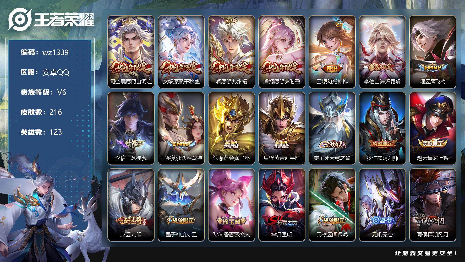 【账号佳】 【可二次实名】【wz1339】【商品标题】:安卓Q-V6-最强王者段位-123英雄-216皮肤-0典藏-0珍品无双-0无双-0珍品传说-11传说-54史诗 【传说皮肤】:司空震愿照山河定,女娲愿照千秋盛,澜愿照九州拓,虞姬愿照岁时盈,云缨幻光神枪,李信山海炽霜斩,曜云鹰飞将,李信一念神魔,干将莫邪久胜战神,达摩黄金狮子座,后羿黄金射手座 【限定皮肤】:姜子牙天穹之誓,狄仁杰阴阳师,赵云皇家上将,赵云龙胆,墨子神迹守卫,孙尚香蔷薇恋人,芈月重明,元歌云间偶戏,元歌无心,夏侯惇朔风刀,曹操烛龙,典韦穷奇,马可波罗暗影游猎,马可波罗山海玄木吟,狄仁杰魔术师,狄仁杰万华元夜,达摩沙漠行僧,项羽海滩派对,老夫子醍醐杖,老夫子航海奇遇记,程咬金演武夺筹,兰陵王金庭之子,亚瑟潮玩骑士王,牛魔御旌,李元芳云中旅人,钟馗驱傩正仪,雅典娜黎明之约,鬼谷子原初探秘者,鬼谷子五谷丰年,苏烈千军破阵,弈星混沌棋,沈梦溪大漠名商,明世隐疑决卦,裴擒虎李小龙,裴擒虎擒涛扼浪,米莱狄御霄,云中君纤云弄巧,李信山海炽霜斩,盾山御銮,嫦娥暖冬兔眠,鲁班大师探海日志,桑启海盐诗旅,暃星界游侠,张良古海寻踪,鬼谷子天穹祈灯,姬小满妄想食味,刘邦剑破天穹,周瑜熔金海岸 【年限皮肤】:赵云龙胆,马可波罗山海玄木吟,李信山海炽霜斩 【赛季限定】:芈月重明,夏侯惇朔风刀,曹操烛龙,典韦穷奇,狄仁杰万华元夜,达摩沙漠行僧,老夫子醍醐杖,程咬金演武夺筹,兰陵王金庭之子,张良古海寻踪,牛魔御旌,李元芳云中旅人,钟馗驱傩正仪,雅典娜黎明之约,鬼谷子原初探秘者,苏烈千军破阵,弈星混沌棋,沈梦溪大漠名商,明世隐疑决卦,裴擒虎擒涛扼浪,米莱狄御霄,盾山御銮,鲁班大师探海日志,桑启海盐诗旅,鬼谷子天穹祈灯,刘邦剑破天穹,姜子牙天穹之誓 【战令限定】:墨子神迹守卫,元歌云间偶戏,马可波罗暗影游猎,老夫子航海奇遇记,亚瑟潮玩骑士王,嫦娥暖冬兔眠,暃星界游侠 【史诗皮肤】:项羽苍穹之光,露娜紫霞仙子,阿轲暗夜猫娘,赵云皇家上将,赵云未来纪元,貂蝉圣诞恋歌,甄姬冰雪圆舞曲,王昭君偶像歌手,狄仁杰魔术师,廉颇地狱岩魂,宫本武藏鬼剑武藏,孙尚香蔷薇恋人,孙尚香水果甜心,嬴政摇滚巨星,妲己魅力维加斯,墨子金属风暴,曹操幽灵船长,吕布末日机甲,张飞乱世虎臣,花木兰水晶猎龙者,刘邦德古拉伯爵,夏侯惇乘风破浪,兰陵王暗隐猎兽者,诸葛亮黄金分割率,百里守约特工魅影,铠曙光守护者,白起星夜王子,孙策猫狗日记,大乔猫狗日记,狄仁杰鹰眼统帅,橘右京修罗,瑶遇见神鹿,赵云龙胆,马可波罗暗影游猎,裴擒虎李小龙,云中君纤云弄巧,元歌云间偶戏,老夫子航海奇遇记,杨戬天秀启明,司马懿暗渊魔法,雅典娜黎明之约,夏洛特永昼,鬼谷子五谷丰年,元歌无心,暃星界游侠,马可波罗山海玄木吟,姬小满妄想食味,孙膑茶境仙,弈星万物之道,狄仁杰绮世丹青,阿轲化蝶舞,刘禅鸭鸭历险记,狂铁龙之律动,黄忠百相守梦 【其他皮肤】:项羽海滩派对,韩信教廷特使,韩信街头霸王,露娜哥特玫瑰,阿轲爱心护理,达摩大发明家,赵云白执事,赵云忍炎影,芈月红桃皇后,程咬金星际陆战队,白起白色死神,扁鹊化身博士,扁鹊救世之瞳,安琪拉玩偶对对碰,孙膑天使之翼,典韦黄金武士,亚瑟死亡骑士,花木兰兔女郎,张飞五福同心,甄姬花好人间,刘备万事如意,宫本武藏万象初新,狄仁杰阴阳师,刘备纽约教父,刘备汉昭烈帝,关羽龙腾万里,钟无艳海滩丽影,宫本武藏霸王丸,曹操烛龙,王昭君幻想奇妙夜,芈月重明,狂铁命运角斗场,老夫子功夫老勺,孙尚香沉稳之力,典韦穷奇,诸葛亮掌控之力,李白敏锐之力,鬼谷子幻乐之宴,苏烈坚韧之力,项羽科学大爆炸,米莱狄御霄,明世隐虹云星官,牛魔御旌,小乔丁香结,吕布野性能量,盾山御銮,沈梦溪鲨炮海盗猫,姜子牙炽热元素使,夏侯惇朔风刀,弈星混沌棋,哪吒次元突破,明世隐疑决卦,盾山圆桌骑士,老夫子醍醐杖,廉颇无尽征程,鬼谷子原初探秘者,狄仁杰万华元夜,亚瑟潮玩骑士王,刘禅秘密基地,杨戬次元傲视,程咬金演武夺筹,张良缤纷绘卷,钟馗驱傩正仪,墨子神迹守卫,鲁班大师乓乓大师,苏烈千军破阵,达摩沙漠行僧,程咬金无双福将,兰陵王金庭之子,沈梦溪大漠名商,蒙犽胡桃狂想曲,李元芳云中旅人,戈娅危途狂花,桑启海盐诗旅,嫦娥暖冬兔眠,海月幻泉雾影,猪八戒潮玩探月行,牛魔牛运亨通,赵怀真太极少年,裴擒虎擒涛扼浪,莱西奥西部游侠,鲁班大师探海日志,李元芳妄想特派,张良古海寻踪,亚连破局者,后羿完美运算,鬼谷子天穹祈灯,朵莉亚金色潮汐,廉颇功夫炙烤,刘邦剑破天穹,大司命暗都幽影,姜子牙天穹之誓,周瑜熔金海岸,太乙真人谧流熔炉,马超访茗客,姜子牙星梦巡礼,东皇太一金福满堂,达摩爆裂喵拳,少司缘灵卦秘语,明世隐景韶洛都,戈娅玫蓝誓约,刘备浪漫序章,钟馗虚灵犬护,沈梦溪鸭鸭历险记,苏烈春野闲踪,小乔秘证寻踪,张良灵