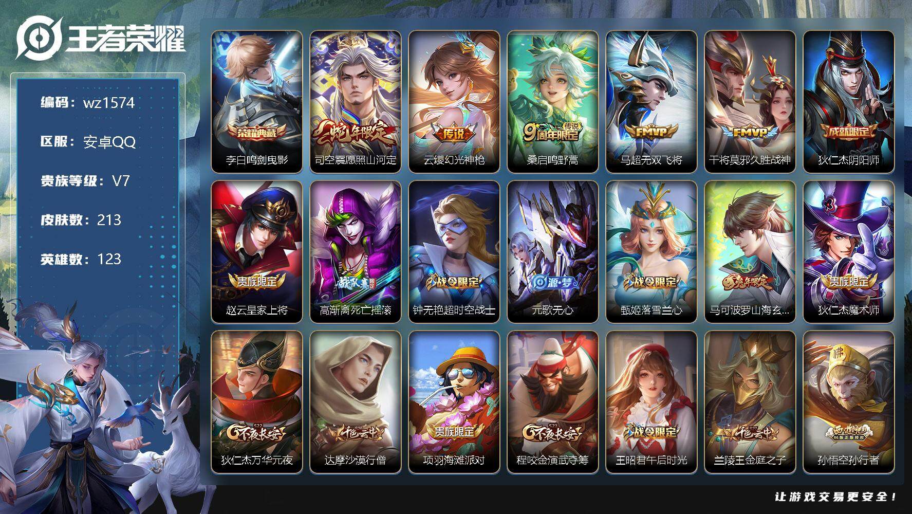 【账号佳】 【可二次实名】【wz1574】【商品标题】:安卓Q-V7-最强王者段位-123英雄-213皮肤-1典藏-0珍品无双-0无双-0珍品传说-5传说-52史诗 【英雄全皮】:蒙恬全皮,司空震全皮,赵怀真全皮 【荣耀典藏】:李白鸣剑曳影 【传说皮肤】:司空震愿照山河定,云缨幻光神枪,桑启鸣野蒿,马超无双飞将,干将莫邪久胜战神 【限定皮肤】:狄仁杰阴阳师,赵云皇家上将,高渐离死亡摇滚,钟无艳超时空战士,元歌无心,甄姬落雪兰心,马可波罗山海玄木吟,狄仁杰魔术师,狄仁杰万华元夜,达摩沙漠行僧,项羽海滩派对,程咬金演武夺筹,王昭君午后时光,兰陵王金庭之子,孙悟空孙行者,后羿如梦令,李元芳云中旅人,钟馗驱傩正仪,干将莫邪胡桃夹子,太乙真人华丽摇滚,鬼谷子原初探秘者,鬼谷子五谷丰年,铠青龙志,百里玄策原初追逐者,梦奇顽趣,沈梦溪大漠名商,裴擒虎李小龙,裴擒虎擒涛扼浪,狂铁电玩高手,云中君时之祈愿,上官婉儿梁祝,嫦娥暖冬兔眠,西施玲珑珍味,鲁班大师探海日志,桑启海盐诗旅,暃星界游侠,戈娅驭风魔法,艾琳流音漫舞,赵怀真鹤归松栖,司空震地狱燃心,阿古朵江河有灵,张良古海寻踪,蒙犽百解令,蒙恬荣光圣徽,鬼谷子天穹祈灯,姬小满妄想食味,沈梦溪龙舞盛年,周瑜熔金海岸 【年限皮肤】:铠青龙志,马可波罗山海玄木吟 【赛季限定】:狄仁杰万华元夜,达摩沙漠行僧,程咬金演武夺筹,兰陵王金庭之子,张良古海寻踪,李元芳云中旅人,钟馗驱傩正仪,鬼谷子原初探秘者,百里玄策原初追逐者,梦奇顽趣,沈梦溪大漠名商,裴擒虎擒涛扼浪,鲁班大师探海日志,桑启海盐诗旅,鬼谷子天穹祈灯,蒙恬荣光圣徽 【战令限定】:钟无艳超时空战士,甄姬落雪兰心,王昭君午后时光,艾琳流音漫舞,狂铁电玩高手,嫦娥暖冬兔眠,西施玲珑珍味,司空震地狱燃心,暃星界游侠,戈娅驭风魔法 【史诗皮肤】:赵云皇家上将,赵云未来纪元,貂蝉圣诞恋歌,甄姬冰雪圆舞曲,狄仁杰魔术师,宫本武藏鬼剑武藏,孙尚香水果甜心,妲己魅力维加斯,墨子金属风暴,刘禅绅士熊喵,李白千年之狐,吕布末日机甲,花木兰水晶猎龙者,刘邦德古拉伯爵,夏侯惇乘风破浪,小乔缤纷独角兽,兰陵王暗隐猎兽者,诸葛亮黄金分割率,亚瑟心灵战警,雅典娜冰冠公主,百里守约特工魅影,程咬金功夫厨神,白起星夜王子,铠青龙志,狄仁杰鹰眼统帅,上官婉儿梁祝,后羿如梦令,橘右京修罗,百里玄策原初追逐者,裴擒虎李小龙,孙悟空孙行者,云中君时之祈愿,夏洛特永昼,澜赏金猎手,狂铁电玩高手,钟无艳超时空战士,鬼谷子五谷丰年,元歌无心,梦奇顽趣,暃星界游侠,马可波罗山海玄木吟,刘禅电玩爆裂旋风,戈娅驭风魔法,赵怀真鹤归松栖,司空震地狱燃心,阿古朵江河有灵,蒙犽百解令,蒙恬荣光圣徽,姬小满妄想食味,赵怀真器灵浮梦炉,阿轲化蝶舞,狂铁龙之律动 【其他皮肤】:项羽海滩派对,韩信教廷特使,韩信街头霸王,露娜哥特玫瑰,阿轲爱心护理,达摩大发明家,赵云白执事,赵云忍炎影,芈月红桃皇后,白起白色死神,牛魔西部大镖客,扁鹊化身博士,宫本武藏未来纪元,姜子牙时尚教父,妲己少女阿狸,典韦黄金武士,亚瑟死亡骑士,达摩拳王,花木兰兔女郎,张飞五福同心,甄姬花好人间,后羿阿尔法小队,狄仁杰阴阳师,刘备纽约教父,高渐离死亡摇滚,刘备汉昭烈帝,关羽龙腾万里,钟无艳海滩丽影,狂铁命运角斗场,老夫子功夫老勺,孙尚香沉稳之力,鬼谷子幻乐之宴,太乙真人华丽摇滚,苏烈坚韧之力,大乔守护之力,项羽科学大爆炸,明世隐虹云星官,小乔丁香结,吕布野性能量,孙膑归虚梦演,沈梦溪鲨炮海盗猫,姜子牙炽热元素使,哪吒次元突破,盾山圆桌骑士,狂铁特工战影,鬼谷子原初探秘者,狄仁杰万华元夜,刘禅秘密基地,露娜瓷语鉴心,程咬金演武夺筹,张良缤纷绘卷,钟馗驱傩正仪,鲁班大师乓乓大师,干将莫邪胡桃夹子,达摩沙漠行僧,程咬金无双福将,兰陵王金庭之子,刘禅唤灵魔甲,米莱狄契约魔法,王昭君午后时光,沈梦溪大漠名商,蒙犽胡桃狂想曲,蒙恬蔚蓝守将,甄姬落雪兰心,李元芳云中旅人,刘备潮玩造梦师,桑启海盐诗旅,嫦娥暖冬兔眠,海月幻泉雾影,猪八戒潮玩探月行,牛魔牛运亨通,白起乐园追猎者,赵怀真太极少年,裴擒虎擒涛扼浪,太乙真人劲辣红锅,鲁班大师探海日志,西施玲珑珍味,姬小满零食大作战,李元芳妄想特派,哪吒热血海滩,艾琳流音漫舞,张良古海寻踪,钟无艳聚星闪耀,亚连破局者,曹操决胜大满贯,后羿完美运算,程咬金暖冬絮语,鬼谷子天穹祈灯,朵莉亚金色潮汐,廉颇功夫炙烤,沈梦溪龙舞盛年,大司命暗都幽影,周瑜熔金海岸,盘古敬我三分,东皇太一噬灭天穹,苍苍林狼骑,太乙真人谧流熔炉,典韦铁骨偃魂,西施雪境奇遇,姜子牙星梦巡礼,明世隐景韶洛都,戈娅玫蓝誓约,刘备浪漫序章,钟馗虚灵犬护,苏烈春野闲踪,张良灵野札记,阿古朵布丁狗之约,露娜命运加冕,白起死霸装,庄周锦麟游梦,莱西奥踏浪烽翎,鲁班七号木偶奇遇记,高渐