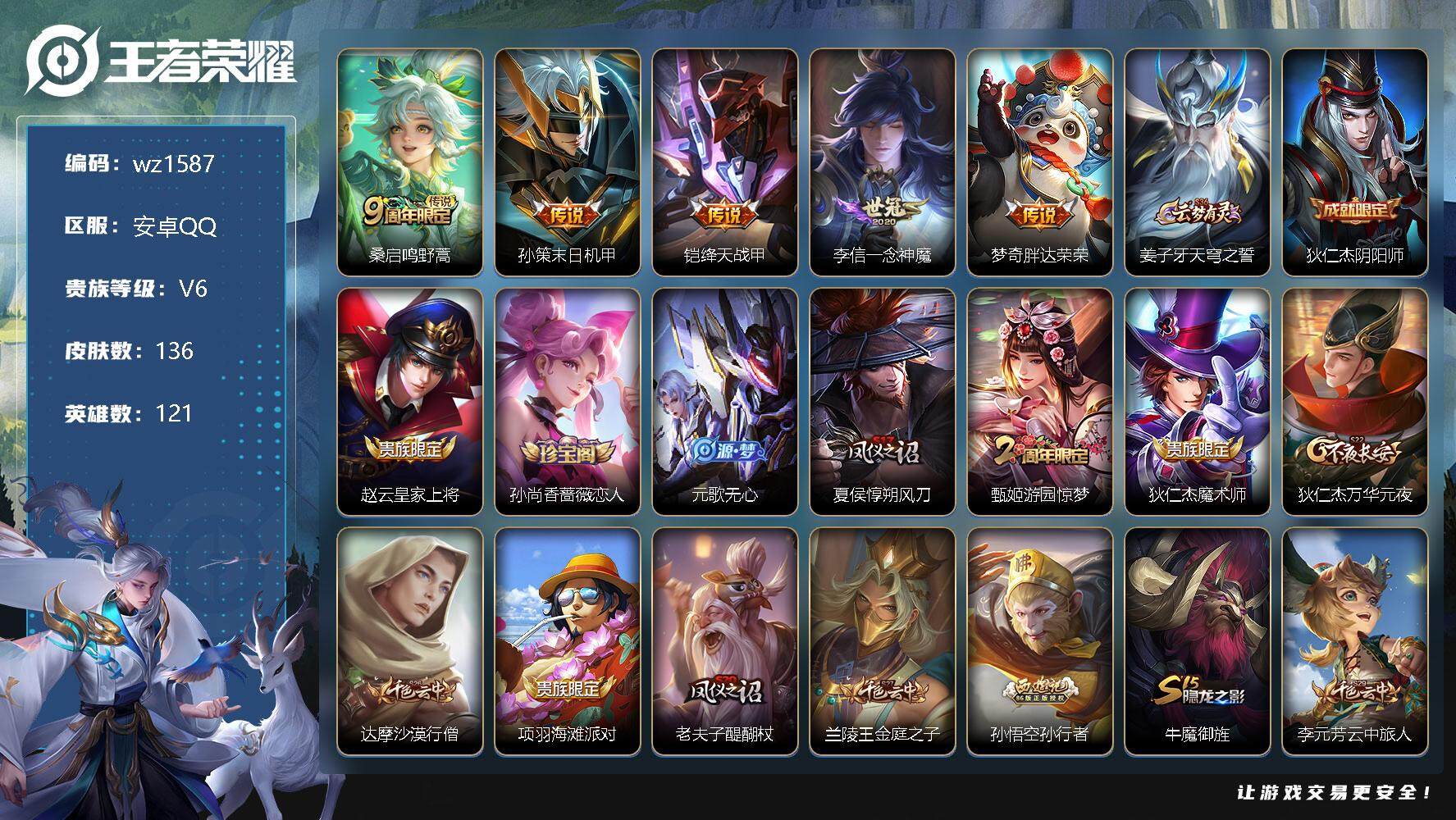 【账号佳】 【可二次实名】【wz1587】【商品标题】:安卓Q-V6-尊贵铂金II段位-121英雄-136皮肤-0典藏-0珍品无双-0无双-0珍品传说-5传说-29史诗 【英雄全皮】:盾山全皮 【传说皮肤】:桑启鸣野蒿,孙策末日机甲,铠绛天战甲,李信一念神魔,梦奇胖达荣荣 【限定皮肤】:姜子牙天穹之誓,狄仁杰阴阳师,赵云皇家上将,孙尚香蔷薇恋人,元歌无心,夏侯惇朔风刀,甄姬游园惊梦,狄仁杰魔术师,狄仁杰万华元夜,达摩沙漠行僧,项羽海滩派对,老夫子醍醐杖,兰陵王金庭之子,孙悟空孙行者,牛魔御旌,李元芳云中旅人,钟馗驱傩正仪,雅典娜单词大作战,蔡文姬繁星吟游,鬼谷子原初探秘者,鬼谷子五谷丰年,弈星混沌棋,沈梦溪大漠名商,明世隐疑决卦,裴擒虎李小龙,裴擒虎擒涛扼浪,盾山御銮,盾山梦圆繁星,上官婉儿梁祝,嫦娥拒霜思,蒙犽狂想玩偶喵,鲁班大师探海日志,桑启海盐诗旅,阿古朵江河有灵,张良古海寻踪,周瑜熔金海岸 【赛季限定】:夏侯惇朔风刀,狄仁杰万华元夜,达摩沙漠行僧,老夫子醍醐杖,兰陵王金庭之子,张良古海寻踪,牛魔御旌,李元芳云中旅人,钟馗驱傩正仪,鬼谷子原初探秘者,弈星混沌棋,沈梦溪大漠名商,明世隐疑决卦,裴擒虎擒涛扼浪,盾山御銮,鲁班大师探海日志,桑启海盐诗旅,姜子牙天穹之誓 【战令限定】:雅典娜单词大作战,蒙犽狂想玩偶喵 【史诗皮肤】:赵云皇家上将,赵云未来纪元,甄姬冰雪圆舞曲,王昭君偶像歌手,狄仁杰魔术师,宫本武藏鬼剑武藏,孙尚香蔷薇恋人,妲己魅力维加斯,墨子龙骑士,墨子金属风暴,兰陵王暗隐猎兽者,甄姬游园惊梦,百里守约特工魅影,刘禅天才门将,白起星夜王子,伽罗箭羽风息,狄仁杰鹰眼统帅,上官婉儿梁祝,蔡文姬繁星吟游,不知火舞魅语,蒙犽狂想玩偶喵,裴擒虎李小龙,安琪拉时之奇旅,孙悟空孙行者,嫦娥拒霜思,鬼谷子五谷丰年,盾山梦圆繁星,元歌无心,阿古朵江河有灵 【其他皮肤】:项羽海滩派对,韩信教廷特使,白起白色死神,牛魔西部大镖客,宫本武藏未来纪元,安琪拉玩偶对对碰,妲己少女阿狸,典韦黄金武士,亚瑟死亡骑士,达摩拳王,张飞五福同心,宫本武藏万象初新,后羿阿尔法小队,狄仁杰阴阳师,刘备汉昭烈帝,关羽龙腾万里,钟无艳海滩丽影,宫本武藏霸王丸,狂铁命运角斗场,老夫子功夫老勺,牛魔制霸全明星,孙尚香沉稳之力,李白敏锐之力,苏烈坚韧之力,牛魔御旌,小乔丁香结,吕布野性能量,盾山御銮,沈梦溪鲨炮海盗猫,姜子牙炽热元素使,夏侯惇朔风刀,弈星混沌棋,鲁班七号黑桃队长,明世隐疑决卦,盾山圆桌骑士,老夫子醍醐杖,鬼谷子原初探秘者,雅典娜单词大作战,狄仁杰万华元夜,刘禅秘密基地,露娜瓷语鉴心,钟馗驱傩正仪,鲁班大师乓乓大师,典韦铁甲之心,达摩沙漠行僧,程咬金无双福将,兰陵王金庭之子,沈梦溪大漠名商,李元芳云中旅人,桑启海盐诗旅,猪八戒潮玩探月行,裴擒虎擒涛扼浪,太乙真人劲辣红锅,鲁班大师探海日志,李元芳妄想特派,张良古海寻踪,亚连破局者,曹操决胜大满贯,后羿完美运算,姜子牙天穹之誓,周瑜熔金海岸,东皇太一噬灭天穹,干将莫邪雾都夜雨,吕布逐霄战戟,苍苍林狼骑,太乙真人谧流熔炉,典韦铁骨偃魂,西施雪境奇遇,明世隐景韶洛都,张良灵野札记,钟无艳生化警戒,貂蝉异域舞娘,曹操超能战警,小乔万圣前夜,孙悟空西部大镖客,妲己仙境爱丽丝,后羿精灵王,李元芳特种部队,蔡文姬蔷薇王座,夏侯惇战争骑士,马可波罗激情绿茵,苍维京掠夺者,杨戬埃及法老,哪吒三太子,鬼谷子阿摩司公爵,铠龙域领主,苏烈爱与和平,明世隐占星师,公孙离花间舞,弈星踏雪寻梅,米莱狄精准探案法,孙策海之征途,盾山极冰防御线,伽罗花见巫女,李信灼热之刃,上官婉儿修竹墨客,盘古创世神祝,曜归虚梦演,蒙恬秩序猎龙将,司空震启蛰,云缨赤焰之缨,桑启画中游 【内测皮肤】:孙尚香蔷薇恋人 【营地ID】:524132950