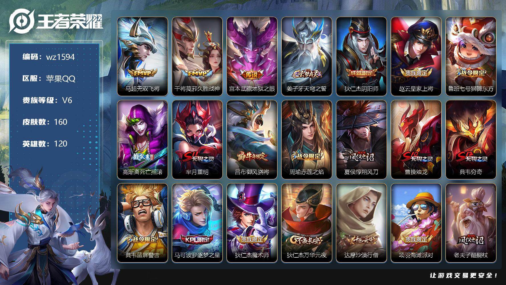 【账号佳】 【可二次实名】【wz1594】【商品标题】:苹果Q-V6-荣耀黄金I段位-120英雄-160皮肤-0典藏-0珍品无双-0无双-0珍品传说-3传说-34史诗 【传说皮肤】:马超无双飞将,干将莫邪久胜战神,宫本武藏地狱之眼 【限定皮肤】:姜子牙天穹之誓,狄仁杰阴阳师,赵云皇家上将,鲁班七号狮舞东方,高渐离死亡摇滚,芈月重明,吕布御风骁将,周瑜赤莲之焰,夏侯惇朔风刀,曹操烛龙,典韦穷奇,典韦蓝屏警告,马可波罗逐梦之星,狄仁杰魔术师,狄仁杰万华元夜,达摩沙漠行僧,项羽海滩派对,老夫子醍醐杖,程咬金演武夺筹,韩信飞衡,兰陵王驯魔猎人,兰陵王金庭之子,孙悟空大圣娶亲,牛魔御旌,李元芳银河之约,钟馗神迹守卫,钟馗驱傩正仪,杨玉环遇见飞天,女娲朔望之晖,干将莫邪胡桃夹子,雅典娜单词大作战,蔡文姬繁星吟游,太乙真人饕餮,鬼谷子原初探秘者,苏烈千军破阵,百里玄策原初追逐者,弈星混沌棋,沈梦溪星空之诺,沈梦溪大漠名商,明世隐疑决卦,裴擒虎李小龙,裴擒虎擒涛扼浪,狂铁御狮,米莱狄御霄,云中君纤云弄巧,盾山御銮,上官婉儿梁祝,蒙犽狂想玩偶喵,鲁班大师探海日志,张良古海寻踪,鬼谷子天穹祈灯,周瑜熔金海岸 【年限皮肤】:吕布御风骁将,韩信飞衡 【赛季限定】:芈月重明,夏侯惇朔风刀,曹操烛龙,典韦穷奇,狄仁杰万华元夜,达摩沙漠行僧,老夫子醍醐杖,程咬金演武夺筹,兰陵王金庭之子,张良古海寻踪,牛魔御旌,钟馗驱傩正仪,太乙真人饕餮,鬼谷子原初探秘者,苏烈千军破阵,百里玄策原初追逐者,弈星混沌棋,沈梦溪大漠名商,明世隐疑决卦,裴擒虎擒涛扼浪,狂铁御狮,米莱狄御霄,盾山御銮,鲁班大师探海日志,鬼谷子天穹祈灯,姜子牙天穹之誓 【战令限定】:鲁班七号狮舞东方,周瑜赤莲之焰,典韦蓝屏警告,兰陵王驯魔猎人,李元芳银河之约,钟馗神迹守卫,女娲朔望之晖,雅典娜单词大作战,沈梦溪星空之诺,蒙犽狂想玩偶喵 【史诗皮肤】:项羽苍穹之光,赵云皇家上将,甄姬冰雪圆舞曲,狄仁杰魔术师,廉颇地狱岩魂,孙尚香水果甜心,嬴政摇滚巨星,墨子金属风暴,刘禅绅士熊喵,张飞乱世虎臣,夏侯惇乘风破浪,小乔缤纷独角兽,马可波罗逐梦之星,雅典娜冰冠公主,刘禅天才门将,白起星夜王子,杨玉环遇见飞天,孙策猫狗日记,孙悟空大圣娶亲,典韦蓝屏警告,伽罗箭羽风息,鲁班七号狮舞东方,狄仁杰鹰眼统帅,兰陵王驯魔猎人,上官婉儿梁祝,蔡文姬繁星吟游,李元芳银河之约,韩信飞衡,蒙犽狂想玩偶喵,百里玄策原初追逐者,裴擒虎李小龙,云中君纤云弄巧,吕布御风骁将,澜赏金猎手 【其他皮肤】:项羽海滩派对,韩信教廷特使,韩信街头霸王,达摩大发明家,赵云忍炎影,芈月红桃皇后,程咬金星际陆战队,白起白色死神,扁鹊化身博士,宫本武藏未来纪元,安琪拉玩偶对对碰,姜子牙时尚教父,妲己少女阿狸,亚瑟死亡骑士,达摩拳王,花木兰兔女郎,张飞五福同心,甄姬花好人间,刘备万事如意,宫本武藏万象初新,狄仁杰阴阳师,刘备纽约教父,高渐离死亡摇滚,钟无艳海滩丽影,太乙真人饕餮,曹操烛龙,王昭君幻想奇妙夜,芈月重明,典韦穷奇,诸葛亮掌控之力,鬼谷子幻乐之宴,狂铁御狮,苏烈坚韧之力,项羽科学大爆炸,米莱狄御霄,明世隐虹云星官,张良幽兰居士,庄周奇妙博物学,牛魔御旌,女娲朔望之晖,小乔丁香结,吕布野性能量,钟馗神迹守卫,盾山御銮,孙膑归虚梦演,沈梦溪鲨炮海盗猫,夏侯惇朔风刀,周瑜赤莲之焰,沈梦溪星空之诺,弈星混沌棋,哪吒次元突破,鲁班七号黑桃队长,明世隐疑决卦,盾山圆桌骑士,老夫子醍醐杖,狂铁特工战影,廉颇无尽征程,鬼谷子原初探秘者,雅典娜单词大作战,狄仁杰万华元夜,刘禅秘密基地,杨戬次元傲视,露娜瓷语鉴心,程咬金演武夺筹,钟馗驱傩正仪,鲁班大师乓乓大师,苏烈千军破阵,干将莫邪胡桃夹子,达摩沙漠行僧,程咬金无双福将,兰陵王金庭之子,沈梦溪大漠名商,蒙恬蔚蓝守将,猪八戒潮玩探月行,裴擒虎擒涛扼浪,鲁班大师探海日志,李元芳妄想特派,张良古海寻踪,亚连破局者,后羿完美运算,鬼谷子天穹祈灯,廉颇功夫炙烤,姜子牙天穹之誓,周瑜熔金海岸,鲁班七号福禄兄弟,露娜绯红之刃,貂蝉异域舞娘,花木兰剑舞者,老夫子潮流仙人,王昭君精灵公主,曹操超能战警,孙膑未来旅行,后羿精灵王,兰陵王隐刃,李白范海辛,李元芳特种部队,虞姬加勒比小姐,夏侯惇战争骑士,马可波罗激情绿茵,苍维京掠夺者,哪吒三太子,大乔伊势巫女,东皇太一东海龙王,干将莫邪第七人偶,铠龙域领主,百里守约绝影神枪,苏烈爱与和平,公孙离花间舞,裴擒虎街头旋风,元歌午夜歌剧院,司马懿魇语军师,伽罗花见巫女,上官婉儿修竹墨客,嫦娥露花倒影,盘古创世神祝,瑶森,曜归虚梦演,马超幸存者,蒙犽归虚梦演,蒙恬秩序猎龙将,澜孤猎,司空震启蛰,云缨赤焰之缨 【内测皮肤】:狂铁特工战影,干将莫邪胡桃夹子 【营地ID】:522539535