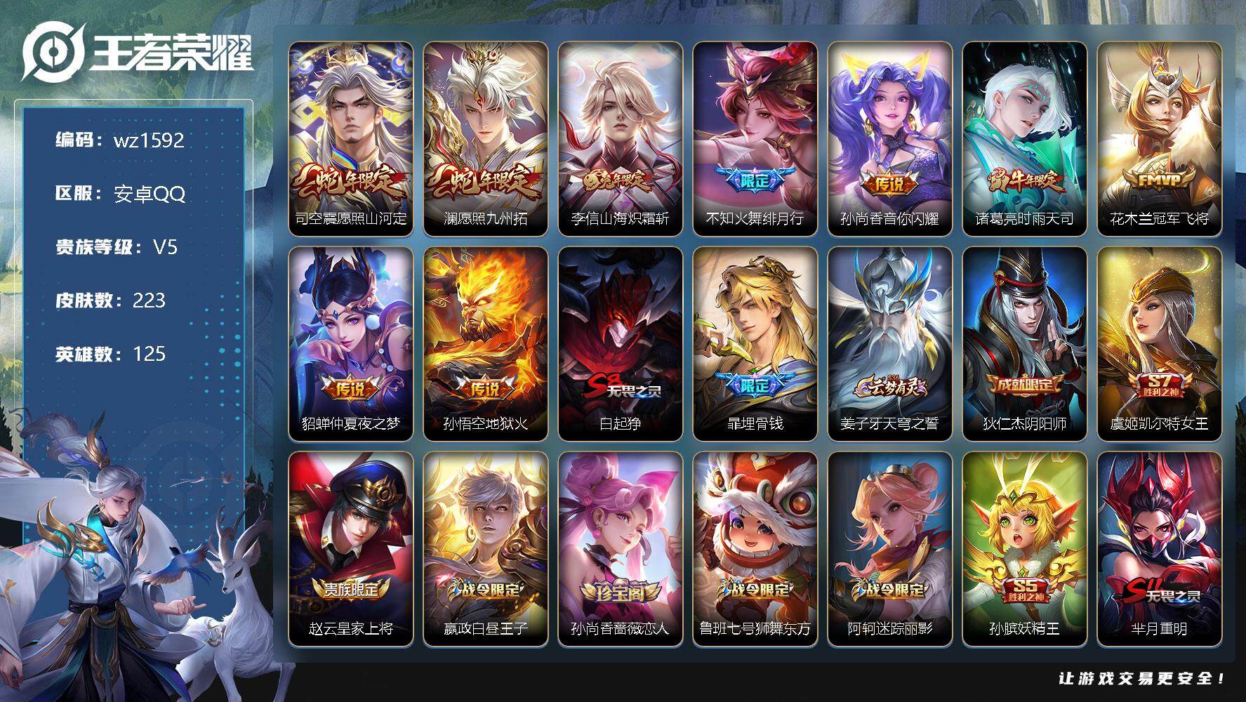 【账号佳】 【可二次实名】【wz1592】【商品标题】:安卓Q-V5-永恒钻石I段位-125英雄-223皮肤-0典藏-0珍品无双-0无双-0珍品传说-9传说-56史诗 【英雄全皮】:影全皮 【传说皮肤】:司空震愿照山河定,澜愿照九州拓,李信山海炽霜斩,不知火舞绯月行,孙尚香音你闪耀,诸葛亮时雨天司,花木兰冠军飞将,貂蝉仲夏夜之梦,孙悟空地狱火 【限定皮肤】:白起狰,暃埋骨钱,姜子牙天穹之誓,狄仁杰阴阳师,虞姬凯尔特女王,赵云皇家上将,嬴政白昼王子,孙尚香蔷薇恋人,鲁班七号狮舞东方,阿轲迷踪丽影,孙膑妖精王,芈月重明,吕布猎兽之王,元歌云间偶戏,夏侯惇朔风刀,曹操烛龙,典韦穷奇,马可波罗山海玄木吟,狄仁杰魔术师,狄仁杰万华元夜,达摩星际陆战队,项羽海滩派对,老夫子醍醐杖,程咬金演武夺筹,刘邦夺宝奇兵,韩信逐梦之影,王昭君凤凰于飞,王昭君午后时光,兰陵王金庭之子,不知火舞绯月行,亚瑟潮玩骑士王,孙悟空大圣娶亲,牛魔御旌,李元芳银河之约,李元芳云中旅人,钟馗神迹守卫,钟馗驱傩正仪,女娲朔望之晖,干将莫邪胡桃夹子,雅典娜黎明之约,蔡文姬繁星吟游,太乙真人饕餮,鬼谷子原初探秘者,鬼谷子五谷丰年,诸葛亮时雨天司,百里守约朱雀志,弈星混沌棋,梦奇顽趣,沈梦溪星空之诺,沈梦溪大漠名商,明世隐疑决卦,裴擒虎李小龙,裴擒虎擒涛扼浪,狂铁御狮,狂铁电玩高手,米莱狄御霄,米莱狄胡桃异想国,云中君纤云弄巧,李信山海炽霜斩,盾山御銮,鲁班大师探海日志,桑启海盐诗旅,张良古海寻踪,鬼谷子天穹祈灯,刘邦剑破天穹,周瑜熔金海岸 【年限皮肤】:百里守约朱雀志,王昭君凤凰于飞,诸葛亮时雨天司,马超神威,马可波罗山海玄木吟,李信山海炽霜斩 【赛季限定】:孙膑妖精王,白起狰,芈月重明,夏侯惇朔风刀,曹操烛龙,典韦穷奇,狄仁杰万华元夜,老夫子醍醐杖,程咬金演武夺筹,兰陵王金庭之子,张良古海寻踪,牛魔御旌,李元芳云中旅人,虞姬凯尔特女王,钟馗驱傩正仪,雅典娜黎明之约,太乙真人饕餮,鬼谷子原初探秘者,弈星混沌棋,梦奇顽趣,沈梦溪大漠名商,明世隐疑决卦,裴擒虎擒涛扼浪,狂铁御狮,米莱狄御霄,盾山御銮,鲁班大师探海日志,桑启海盐诗旅,鬼谷子天穹祈灯,刘邦剑破天穹,姜子牙天穹之誓 【战令限定】:嬴政白昼王子,鲁班七号狮舞东方,阿轲迷踪丽影,吕布猎兽之王,元歌云间偶戏,达摩星际陆战队,刘邦夺宝奇兵,王昭君午后时光,亚瑟潮玩骑士王,李元芳银河之约,钟馗神迹守卫,女娲朔望之晖,沈梦溪星空之诺,狂铁电玩高手,米莱狄胡桃异想国 【史诗皮肤】:露娜紫霞仙子,赵云皇家上将,貂蝉圣诞恋歌,甄姬冰雪圆舞曲,狄仁杰魔术师,廉颇地狱岩魂,宫本武藏鬼剑武藏,孙尚香蔷薇恋人,孙尚香水果甜心,嬴政摇滚巨星,妲己魅力维加斯,吕布圣诞狂欢,曹操幽灵船长,李白千年之狐,吕布末日机甲,韩信白龙吟,王昭君凤凰于飞,花木兰水晶猎龙者,刘邦德古拉伯爵,韩信逐梦之影,夏侯惇乘风破浪,小乔缤纷独角兽,兰陵王暗隐猎兽者,诸葛亮黄金分割率,亚瑟心灵战警,安琪拉心灵骇客,百里守约特工魅影,李元芳逐浪之夏,白起星夜王子,阿轲节奏热浪,嬴政白昼王子,百里守约朱雀志,孙悟空大圣娶亲,鲁班七号狮舞东方,狄仁杰鹰眼统帅,蔡文姬繁星吟游,李元芳银河之约,阿轲迷踪丽影,马超神威,裴擒虎李小龙,云中君纤云弄巧,元歌云间偶戏,米莱狄胡桃异想国,沈梦溪月团寄思,雅典娜黎明之约,貂蝉唤灵魅影,高渐离天秀音浪,狂铁电玩高手,鬼谷子五谷丰年,梦奇顽趣,马可波罗山海玄木吟,暃埋骨钱,赵怀真器灵浮梦炉,阿轲化蝶舞,狂铁龙之律动,黄忠百相守梦 【其他皮肤】:项羽海滩派对,韩信教廷特使,阿轲致命风华,阿轲爱心护理,达摩大发明家,赵云忍炎影,芈月红桃皇后,白起白色死神,扁鹊化身博士,扁鹊救世之瞳,安琪拉玩偶对对碰,孙膑天使之翼,姜子牙时尚教父,妲己少女阿狸,典韦黄金武士,亚瑟死亡骑士,达摩拳王,花木兰兔女郎,甄姬花好人间,宫本武藏万象初新,狄仁杰阴阳师,刘备纽约教父,孙膑妖精王,刘备汉昭烈帝,关羽龙腾万里,虞姬凯尔特女王,墨子进击墨子号,白起狰,钟无艳海滩丽影,太乙真人饕餮,宫本武藏霸王丸,曹操烛龙,芈月重明,老夫子功夫老勺,典韦穷奇,李白敏锐之力,鬼谷子幻乐之宴,狂铁御狮,苏烈坚韧之力,大乔守护之力,项羽科学大爆炸,米莱狄御霄,吕布猎兽之王,明世隐虹云星官,牛魔御旌,女娲朔望之晖,小乔丁香结,吕布野性能量,钟馗神迹守卫,盾山御銮,孙膑归虚梦演,沈梦溪鲨炮海盗猫,姜子牙炽热元素使,夏侯惇朔风刀,沈梦溪星空之诺,弈星混沌棋,哪吒次元突破,明世隐疑决卦,刘邦夺宝奇兵,盾山圆桌骑士,老夫子醍醐杖,狂铁特工战影,鬼谷子原初探秘者,狄仁杰万华元夜,亚瑟潮玩骑士王,刘禅秘密基地,杨戬次元傲视,达摩星际陆战队,程咬金演武夺筹,张良缤纷绘卷,钟馗驱傩正仪,鲁班大师乓乓大师,干将莫邪胡桃夹子,程咬金无双福