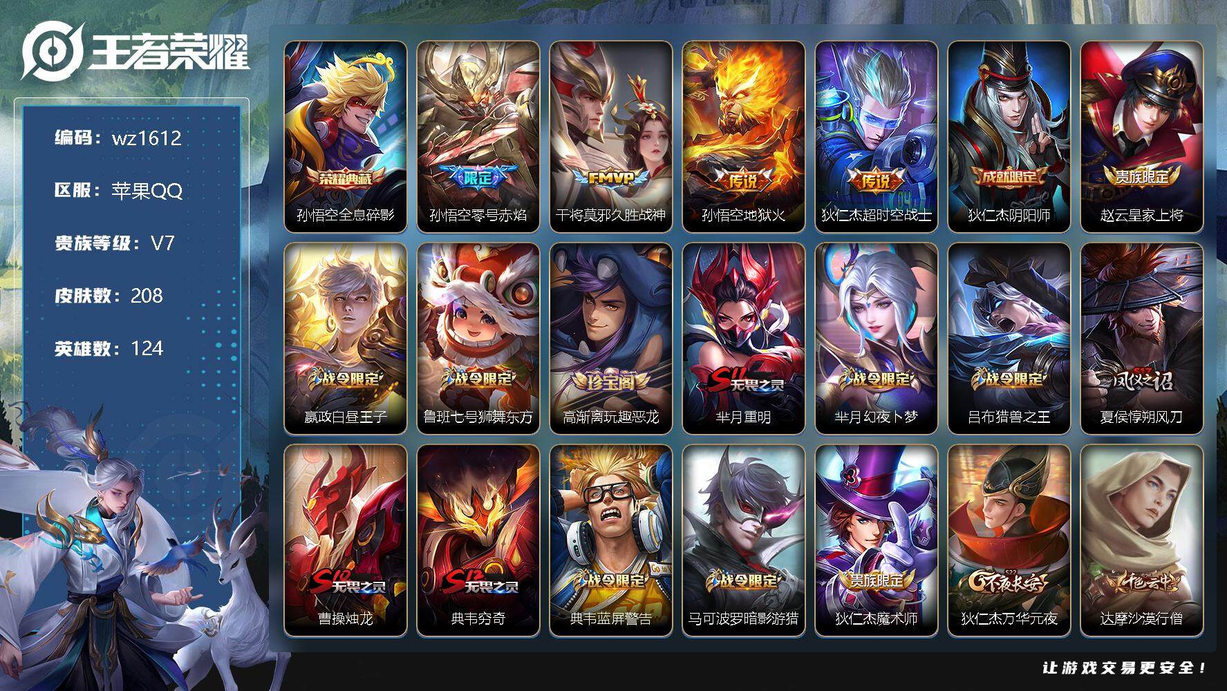 【账号佳】 【可二次实名】【wz2】【商品标题】:苹果Q-V7-最强王者段位-124英雄-208皮肤-1典藏-0珍品无双-0无双-0珍品传说-4传说-45史诗 【荣耀典藏】:孙悟空全息碎影 【传说皮肤】:孙悟空零号赤焰,干将莫邪久胜战神,孙悟空地狱火,狄仁杰超时空战士 【限定皮肤】:狄仁杰阴阳师,赵云皇家上将,嬴政白昼王子,鲁班七号狮舞东方,高渐离玩趣恶龙,芈月重明,芈月幻夜卜梦,吕布猎兽之王,夏侯惇朔风刀,曹操烛龙,典韦穷奇,典韦蓝屏警告,马可波罗暗影游猎,狄仁杰魔术师,狄仁杰万华元夜,达摩沙漠行僧,项羽海滩派对,老夫子醍醐杖,程咬金演武夺筹,兰陵王金庭之子,孙悟空大圣娶亲,孙悟空零号赤焰,牛魔御旌,李元芳银河之约,钟馗神迹守卫,钟馗驱傩正仪,女娲朔望之晖,太乙真人饕餮,鬼谷子原初探秘者,黄忠火炮绅士,苏烈千军破阵,百里玄策原初追逐者,弈星混沌棋,梦奇顽趣,沈梦溪星空之诺,沈梦溪大漠名商,明世隐疑决卦,裴擒虎李小龙,狂铁御狮,米莱狄御霄,盾山御銮,猪八戒西部大镖客,上官婉儿梁祝,鲁班大师探海日志,桑启海盐诗旅,张良古海寻踪,蒙恬荣光圣徽 【赛季限定】:芈月重明,夏侯惇朔风刀,曹操烛龙,典韦穷奇,狄仁杰万华元夜,达摩沙漠行僧,老夫子醍醐杖,程咬金演武夺筹,兰陵王金庭之子,张良古海寻踪,牛魔御旌,钟馗驱傩正仪,太乙真人饕餮,鬼谷子原初探秘者,苏烈千军破阵,百里玄策原初追逐者,弈星混沌棋,梦奇顽趣,沈梦溪大漠名商,明世隐疑决卦,狂铁御狮,米莱狄御霄,盾山御銮,鲁班大师探海日志,桑启海盐诗旅,蒙恬荣光圣徽 【战令限定】:嬴政白昼王子,鲁班七号狮舞东方,芈月幻夜卜梦,吕布猎兽之王,典韦蓝屏警告,马可波罗暗影游猎,李元芳银河之约,钟馗神迹守卫,女娲朔望之晖,黄忠火炮绅士,沈梦溪星空之诺,猪八戒西部大镖客 【史诗皮肤】:露娜紫霞仙子,赵云皇家上将,貂蝉圣诞恋歌,王昭君偶像歌手,狄仁杰魔术师,宫本武藏鬼剑武藏,孙尚香水果甜心,妲己魅力维加斯,妲己女仆咖啡,墨子金属风暴,吕布圣诞狂欢,曹操幽灵船长,张飞乱世虎臣,夏侯惇乘风破浪,小乔缤纷独角兽,兰陵王暗隐猎兽者,雅典娜冰冠公主,安琪拉心灵骇客,铠曙光守护者,刘禅天才门将,李元芳逐浪之夏,程咬金功夫厨神,白起星夜王子,阿轲节奏热浪,嬴政白昼王子,孙策猫狗日记,孙悟空大圣娶亲,典韦蓝屏警告,伽罗箭羽风息,鲁班七号狮舞东方,狄仁杰鹰眼统帅,上官婉儿梁祝,李元芳银河之约,孙尚香时之恋人,马可波罗暗影游猎,百里玄策原初追逐者,裴擒虎李小龙,黄忠火炮绅士,艾琳奇遇舞章,梦奇顽趣,蒙恬荣光圣徽,百里守约百相守梦,孙膑茶境仙,阿轲化蝶舞,狂铁龙之律动 【其他皮肤】:项羽海滩派对,韩信教廷特使,韩信街头霸王,阿轲爱心护理,达摩大发明家,赵云白执事,赵云忍炎影,程咬金爱与正义,牛魔西部大镖客,扁鹊化身博士,宫本武藏未来纪元,安琪拉玩偶对对碰,孙膑天使之翼,妲己少女阿狸,典韦黄金武士,亚瑟死亡骑士,达摩拳王,花木兰兔女郎,甄姬花好人间,刘备万事如意,宫本武藏万象初新,后羿阿尔法小队,狄仁杰阴阳师,刘备纽约教父,刘备汉昭烈帝,关羽龙腾万里,墨子进击墨子号,钟无艳海滩丽影,太乙真人饕餮,曹操烛龙,芈月重明,老夫子功夫老勺,孙尚香沉稳之力,典韦穷奇,诸葛亮掌控之力,李白敏锐之力,鬼谷子幻乐之宴,狂铁御狮,安琪拉如懿,苏烈坚韧之力,米莱狄御霄,吕布猎兽之王,明世隐虹云星官,庄周奇妙博物学,牛魔御旌,女娲朔望之晖,小乔丁香结,吕布野性能量,钟馗神迹守卫,盾山御銮,孙膑归虚梦演,高渐离玩趣恶龙,沈梦溪鲨炮海盗猫,姜子牙炽热元素使,夏侯惇朔风刀,沈梦溪星空之诺,弈星混沌棋,哪吒次元突破,明世隐疑决卦,老夫子醍醐杖,猪八戒西部大镖客,狂铁特工战影,鬼谷子原初探秘者,狄仁杰万华元夜,刘禅秘密基地,杨戬次元傲视,露娜瓷语鉴心,程咬金演武夺筹,张良缤纷绘卷,钟馗驱傩正仪,鲁班大师乓乓大师,苏烈千军破阵,达摩沙漠行僧,芈月幻夜卜梦,程咬金无双福将,兰陵王金庭之子,刘禅唤灵魔甲,米莱狄契约魔法,沈梦溪大漠名商,蒙犽胡桃狂想曲,蒙恬蔚蓝守将,戈娅危途狂花,桑启海盐诗旅,猪八戒潮玩探月行,莱西奥西部游侠,鲁班大师探海日志,张良古海寻踪,后羿完美运算,海诺时空谍影,廉颇功夫炙烤,东皇太一噬灭天穹,老夫子百相守梦,干将莫邪雾都夜雨,吕布逐霄战戟,苍苍林狼骑,太乙真人谧流熔炉,典韦铁骨偃魂,马超访茗客,西施雪境奇遇,姜子牙星梦巡礼,东皇太一金福满堂,明世隐景韶洛都,戈娅玫蓝誓约,刘备浪漫序章,钟馗虚灵犬护,苏烈春野闲踪,小乔秘证寻踪,张良灵野札记,阿古朵布丁狗之约,鲁班七号木偶奇遇记,高渐离金属狂潮,露娜绯红之刃,貂蝉异域舞娘,老夫子潮流仙人,王昭君精灵公主,狄仁杰锦衣卫,曹操死神来了,小乔万圣前夜,孙悟空西部大镖客,后羿精灵王,刘禅英喵野望,兰陵王隐刃,虞姬加勒比