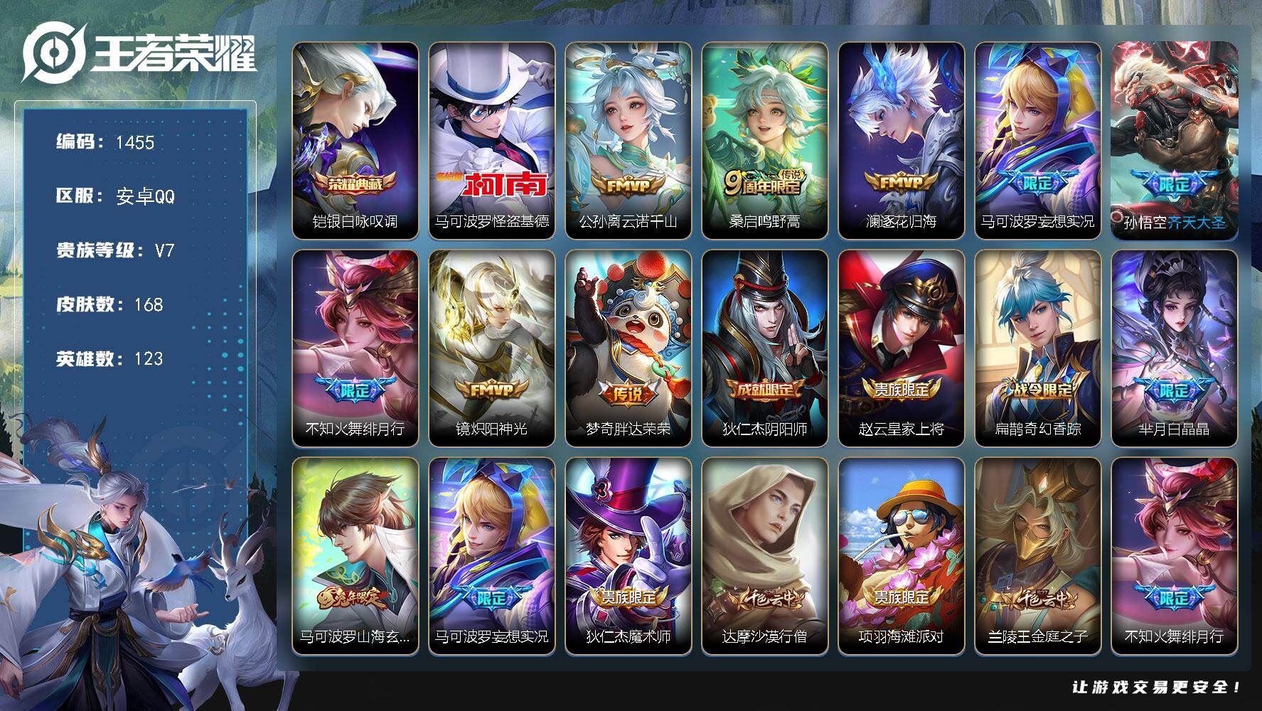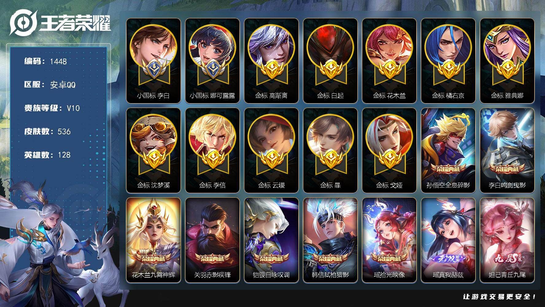 【账号佳】 【可二次实名】可二次QQ 安卓Q-V10-最强王者段位-128英雄-536皮肤-7典藏皮肤-2无双-2珍品传说-72传说-170史诗【英雄全皮】:嬴政全皮,刘禅全皮,扁鹊全皮,司马懿全皮,姜子牙全皮,孙权全皮,艾琳全皮,娜可露露全皮,橘右京全皮,苍全皮,太乙真人全皮,沈梦溪全皮,狂铁全皮,盾山全皮,大司命全皮,敖隐全皮,西施全皮,鲁班大师全皮,蒙恬全皮,阿古朵全皮,夏洛特全皮,金蝉全皮,戈娅全皮,空空儿全皮,海诺全皮【荣耀典藏】:孙悟空全息碎影,李白鸣剑曳影,花木兰九霄神辉,关羽赤影疾锋,铠银白咏叹调,韩信弑枪猎影,瑶拾光映像【无双皮肤】:瑶真我赫兹,妲己青丘九尾【珍品传说】:鲁班七号江户川柯南,马可波罗怪盗基德【传说皮肤】:狄仁杰神骥赴朔漠,后羿神树通天,大司命死亡执政官,司马懿九山相柳,西施续相思,妲己愿照众生和,澜愿照九州拓,蔡文姬愿照福禄聚,虞姬愿照岁时盈,云缨幻光神枪,嬴政玄雷天君,桑启鸣野蒿,墨子黄金天蝎座,孙尚香乘龙问璇玑,艾琳觅芳踪,露娜霜月吟,王昭君永恒水手月亮,诸葛亮鹤羽星尊,澜电玩雷克斯,亚瑟追逃游戏,公孙离记忆之芯,夏洛特浮生妄,干将莫邪画中仙,花木兰燃星之曲,虞姬无限倾心,项羽无限倾心,伽罗炽翼辉光,孙悟空齐天大圣,小乔山海琳琅生,李信山海炽霜斩,吕布怒海麟威,李白诗剑行,百里守约碎云,橘右京枫霜尽,娜可露露前尘镜,马超无双飞将,露娜启示之音,孙策末日机甲,裴擒虎寅虎赤拳,鲁班七号寅虎瑞焰,赵云淬星耀世,王昭君乞巧织情,西施游龙清影,曜李逍遥 ,周瑜音你心动,小乔音你心动,李元芳飞鸢探春,兰陵王默契交锋,铠绛天战甲,镜炽阳神光,虞姬启明星使,曜云鹰飞将,李信一念神魔,刘备时之恋人,貂蝉猫影幻舞,张良黄金白羊座,干将莫邪久胜战神,虞姬云霓雀翎,达摩黄金狮子座,百里玄策白虎志,花木兰冠军飞将,梦奇胖达荣荣,后羿黄金射手座,杨戬永曜之星,诸葛亮武陵仙君,貂蝉仲夏夜之梦,李白凤求凰,孙尚香末日机甲,宫本武藏地狱之眼,孙悟空地狱火,吕布天魔缭乱,狄仁杰超时空战士【限定皮肤】:白起狰,蔡文姬夏日便利店,大乔绒语心约,虞姬夏日便利店,姜子牙天穹之誓,李白谪仙醉月,狄仁杰阴阳师,虞姬凯尔特女王,小乔山海琳琅生,赵云皇家上将,墨子降魔,嬴政优雅恋人,嬴政白昼王子,鲁班七号狮舞东方,鲁班七号寅虎瑞焰,庄周蜃楼王,庄周云端筑梦师,庄周高山流水,高渐离死亡摇滚,高渐离玩趣恶龙,阿轲迷踪丽影,钟无艳超时空战士,孙膑妖精王,扁鹊炼金王,扁鹊奇幻香踪,白起夜都怪侠,芈月重明,吕布天魔缭乱,吕布猎兽之王,周瑜赤莲之焰,元歌云间偶戏,元歌无心,夏侯惇朔风刀,夏侯惇匿光决锋者,甄姬落雪兰心,曹操烛龙,典韦穷奇,典韦蓝屏警告,马可波罗逐梦之星,马可波罗暗影游猎,马可波罗山海玄木吟,狄仁杰魔术师,狄仁杰万华元夜,达摩星际陆战队,达摩沙漠行僧,项羽海滩派对,项羽无限倾心,老夫子圣诞老人,老夫子醍醐杖,老夫子航海奇遇记,安琪拉魔法小厨娘,程咬金演武夺筹,露娜启示之音,韩信逐梦之影,韩信飞衡,韩信傲雪梅枪,王昭君凤凰于飞,王昭君午后时光,兰陵王默契交锋,兰陵王驯魔猎人,兰陵王金庭之子,花木兰青春决赛季,花木兰燃星之曲,娜可露露前尘镜,橘右京枫霜尽,亚瑟追逃游戏,孙悟空至尊宝,孙悟空大圣娶亲,孙悟空齐天大圣,牛魔御旌,后羿辉光之辰,后羿圣弓游侠,刘备百相守梦,李元芳银河之约,李元芳云中旅人,虞姬启明星使,虞姬无限倾心,钟馗神迹守卫,钟馗驱傩正仪,杨玉环遇见飞天,杨戬永曜之星,杨戬潮玩骑兵,女娲朔望之晖,干将莫邪胡桃夹子,干将莫邪画中仙,雅典娜黎明之约,太乙真人饕餮,太乙真人华丽摇滚,鬼谷子原初探秘者,鬼谷子五谷丰年,诸葛亮武陵仙君,诸葛亮鹤羽星尊,【营地ID】:323628118【金标】:金标雅典娜,金标沈梦溪,金标戈娅,金标花木兰,金标高渐离,金标暃,金标云缨,金标李信,金标白起,金标橘右京【小国标】:小国标李白,小国标娜可露露各种道具详情看截图、低价出售找回包 赔、截图展示段位不代 表实际段位,如赛季更新等不可抗拒因素发生变化、时限道具不保证所剩时间、标题未写送点劵默认不送【卖号买号首选亿梦】