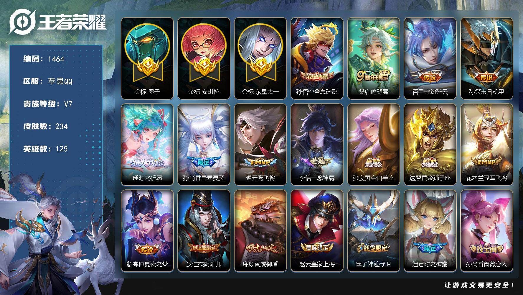 【账号佳】 【可二次实名】可二次 苹果Q-V7-永恒钻石I段位-125英雄-234皮肤-1典藏皮肤-11传说-68史诗【英雄全皮】:敖隐全皮【荣耀典藏】:孙悟空全息碎影【传说皮肤】:桑启鸣野蒿,百里守约碎云,孙策末日机甲,瑶时之祈愿,孙尚香异界灵契,曜云鹰飞将,李信一念神魔,张良黄金白羊座,达摩黄金狮子座,花木兰冠军飞将,貂蝉仲夏夜之梦【限定皮肤】:狄仁杰阴阳师,廉颇寅虎御盾,赵云皇家上将,墨子神迹守卫,妲己时之彼端,孙尚香蔷薇恋人,孙尚香异界灵契,鲁班七号乒乒小将,庄周高山流水,高渐离死亡摇滚,高渐离玩趣恶龙,白起夜都怪侠,芈月幻夜卜梦,元歌无心,马可波罗暗影游猎,马可波罗山海玄木吟,狄仁杰魔术师,达摩沙漠行僧,项羽海滩派对,老夫子醍醐杖,程咬金演武夺筹,韩信飞衡,王昭君午后时光,兰陵王金庭之子,孙悟空至尊宝,孙悟空孙行者,后羿如梦令,后羿圣弓游侠,李元芳银河之约,李元芳云中旅人,钟馗驱傩正仪,干将莫邪胡桃夹子,干将莫邪真爱魔法,雅典娜黎明之约,蔡文姬繁星吟游,太乙真人华丽摇滚,鬼谷子原初探秘者,鬼谷子五谷丰年,黄忠火炮绅士,铠青龙志,苏烈千军破阵,百里玄策原初追逐者,弈星混沌棋,梦奇顽趣,沈梦溪星空之诺,沈梦溪大漠名商,明世隐疑决卦,明世隐吟游魔法,裴擒虎李小龙,裴擒虎擒涛扼浪,狂铁电玩高手,瑶时之祈愿,猪八戒西部大镖客,上官婉儿梁祝,嫦娥拒霜思,鲁班大师探海日志,桑启海盐诗旅,张良古海寻踪,蒙恬荣光圣徽,鬼谷子天穹祈灯【年限皮肤】:铠青龙志,韩信飞衡,廉颇寅虎御盾,马可波罗山海玄木吟【赛季限定】:弈星混沌棋,明世隐疑决卦,老夫子醍醐杖,鬼谷子原初探秘者,程咬金演武夺筹,钟馗驱傩正仪,苏烈千军破阵,达摩沙漠行僧,兰陵王金庭之子,沈梦溪大漠名商,李元芳云中旅人,桑启海盐诗旅,裴擒虎擒涛扼浪,鲁班大师探海日志,张良古海寻踪,鬼谷子天穹祈灯,东皇太一噬灭天穹,太乙真人谧流熔炉,钟馗虚灵犬护,亚瑟荣光之誓,百里玄策原初追逐者,雅典娜黎明之约,梦奇顽趣,蒙恬荣光圣徽,牛魔星界战将【战令限定】:李元芳银河之约,沈梦溪星空之诺,马可波罗暗影游猎,猪八戒西部大镖客,墨子神迹守卫,干将莫邪真爱魔法,后羿圣弓游侠,黄忠火炮绅士,芈月幻夜卜梦,明世隐吟游魔法,白起夜都怪侠,狂铁电玩高手,王昭君午后时光【史诗皮肤】:少司缘巫礼祀神,百里玄策罗小黑战记,牛魔星界战将,蒙恬荣光圣徽,马可波罗山海玄木吟,梦奇顽趣,元歌无心,鬼谷子五谷丰年,狂铁电玩高手,明世隐吟游魔法,澜赏金猎手,廉颇寅虎御盾,雅典娜黎明之约,黄忠火炮绅士,嫦娥拒霜思,庄周高山流水,孙悟空孙行者,安琪拉时之奇旅,钟馗乐园奇幻夜,干将莫邪真爱魔法,鲁班七号乒乒小将,裴擒虎李小龙,百里玄策原初追逐者,马可波罗暗影游猎,孙尚香时之恋人,橘右京修罗,后羿如梦令,妲己时之彼端,韩信飞衡,李元芳银河之约,蔡文姬繁星吟游,上官婉儿梁祝,狄仁杰鹰眼统帅,铠青龙志,大乔猫狗日记,孙策猫狗日记,白起星夜王子,程咬金功夫厨神,李元芳逐浪之夏,刘禅天才门将,百里守约特工魅影,安琪拉心灵骇客,雅典娜冰冠公主,亚瑟心灵战警,诸葛亮黄金分割率,兰陵王暗隐猎兽者,小乔缤纷独角兽,夏侯惇乘风破浪,孙悟空至尊宝,张飞乱世虎臣,吕布末日机甲,曹操幽灵船长,刘禅绅士熊喵,吕布圣诞狂欢,墨子金属风暴,墨子龙骑士,妲己魅力维加斯,嬴政摇滚巨星,孙尚香水果甜心,孙尚香蔷薇恋人,宫本武藏鬼剑武藏,廉颇地狱岩魂,狄仁杰魔术师,王昭君偶像歌手,甄姬冰雪圆舞曲,貂蝉圣诞恋歌,赵云未来纪元,赵云皇家上将【金标】:金标东皇太一,金标墨子,金标安琪拉【营地ID】:1711893909,各种道具详情看截图、低价出售找回包 赔、截图展示段位不代 表实际段位,如赛季更新等不可抗拒因素发生变化、时限道具不保证所剩时间、标题未写送点劵默认不送【卖号买号首选亿梦】