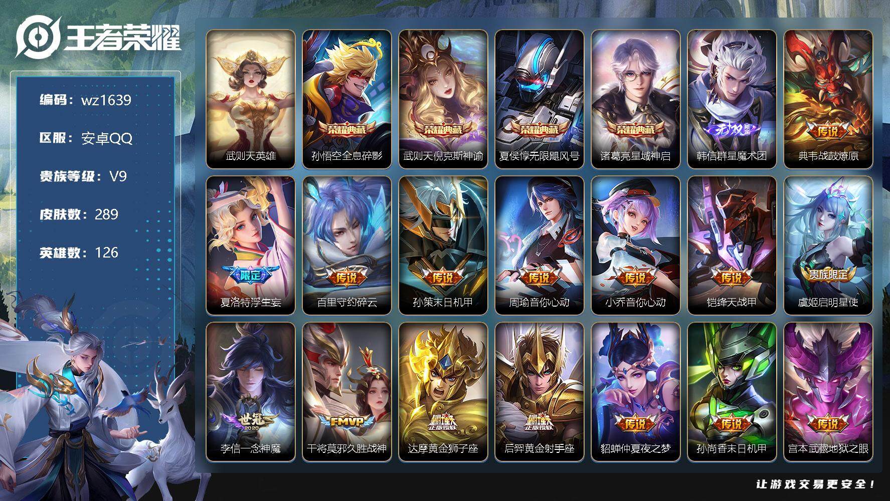 【账号佳】 【可二次实名】【wz1639】【商品标题】:安卓Q-V9-最强王者段位-126英雄-289皮肤-4典藏-0珍品无双-1无双-0珍品传说-18传说-71史诗 【英雄全皮】:鬼谷子全皮,猪八戒全皮,影全皮 【荣耀典藏】:武则天英雄,孙悟空全息碎影,武则天倪克斯神谕,夏侯惇无限飓风号,诸葛亮星域神启 【无双皮肤】:韩信群星魔术团 【传说皮肤】:典韦战鼓燎原,夏洛特浮生妄,百里守约碎云,孙策末日机甲,周瑜音你心动,小乔音你心动,铠绛天战甲,虞姬启明星使,李信一念神魔,干将莫邪久胜战神,达摩黄金狮子座,后羿黄金射手座,貂蝉仲夏夜之梦,孙尚香末日机甲,宫本武藏地狱之眼,孙悟空地狱火,武则天海洋之心,狄仁杰超时空战士 【限定皮肤】:姜子牙天穹之誓,狄仁杰阴阳师,赵云皇家上将,墨子神迹守卫,嬴政优雅恋人,阿轲迷踪丽影,钟无艳超时空战士,扁鹊奇幻香踪,夏侯惇朔风刀,甄姬落雪兰心,典韦岱宗,马可波罗暗影游猎,狄仁杰魔术师,狄仁杰万华元夜,达摩星际陆战队,达摩沙漠行僧,项羽海滩派对,老夫子醍醐杖,老夫子航海奇遇记,程咬金演武夺筹,刘邦夺宝奇兵,兰陵王金庭之子,孙悟空至尊宝,孙悟空大圣娶亲,孙悟空孙行者,后羿圣弓游侠,李元芳银河之约,李元芳云中旅人,虞姬启明星使,钟馗驱傩正仪,杨戬潮玩骑兵,女娲朔望之晖,干将莫邪真爱魔法,雅典娜单词大作战,鬼谷子原初探秘者,鬼谷子五谷丰年,苏烈千军破阵,百里玄策原初追逐者,百里守约朱雀志,弈星混沌棋,公孙离玉兔公主,沈梦溪星空之诺,沈梦溪大漠名商,明世隐疑决卦,裴擒虎李小龙,裴擒虎擒涛扼浪,米莱狄胡桃异想国,云中君纤云弄巧,猪八戒西部大镖客,猪八戒猪悟能,上官婉儿神器万象笔,嫦娥暖冬兔眠,蒙犽狂想玩偶喵,桑启海盐诗旅,夏洛特浮生妄,暃星界游侠,张良古海寻踪,高渐离燃音魔法,妲己灵卜魔法,鬼谷子天穹祈灯,鲁班七号蔬乡物语,李元芳蔬乡物语,刘邦剑破天穹,程咬金群星魔术团,韩信群星魔术团,镜青焰无极,项羽苍威无极,周瑜熔金海岸 【年限皮肤】:百里守约朱雀志,典韦岱宗 【赛季限定】:夏侯惇朔风刀,狄仁杰万华元夜,达摩沙漠行僧,老夫子醍醐杖,程咬金演武夺筹,兰陵王金庭之子,张良古海寻踪,李元芳云中旅人,钟馗驱傩正仪,鬼谷子原初探秘者,苏烈千军破阵,百里玄策原初追逐者,弈星混沌棋,沈梦溪大漠名商,明世隐疑决卦,裴擒虎擒涛扼浪,桑启海盐诗旅,鬼谷子天穹祈灯,刘邦剑破天穹,姜子牙天穹之誓 【战令限定】:墨子神迹守卫,阿轲迷踪丽影,钟无艳超时空战士,扁鹊奇幻香踪,甄姬落雪兰心,马可波罗暗影游猎,达摩星际陆战队,老夫子航海奇遇记,刘邦夺宝奇兵,后羿圣弓游侠,李元芳银河之约,杨戬潮玩骑兵,女娲朔望之晖,干将莫邪真爱魔法,雅典娜单词大作战,沈梦溪星空之诺,米莱狄胡桃异想国,猪八戒西部大镖客,嫦娥暖冬兔眠,蒙犽狂想玩偶喵,暃星界游侠,高渐离燃音魔法,妲己灵卜魔法,鲁班七号蔬乡物语,李元芳蔬乡物语,镜青焰无极,项羽苍威无极 【史诗皮肤】:鲁班七号电玩小子,阿轲暗夜猫娘,赵云皇家上将,甄姬冰雪圆舞曲,王昭君偶像歌手,狄仁杰魔术师,廉颇地狱岩魂,宫本武藏鬼剑武藏,孙尚香水果甜心,嬴政优雅恋人,嬴政暗夜贵公子,嬴政摇滚巨星,妲己魅力维加斯,妲己女仆咖啡,吕布圣诞狂欢,曹操幽灵船长,李白千年之狐,张飞乱世虎臣,韩信白龙吟,孙悟空至尊宝,夏侯惇乘风破浪,兰陵王暗隐猎兽者,亚瑟心灵战警,雅典娜冰冠公主,安琪拉心灵骇客,蔡文姬舞动绿茵,刘禅天才门将,李元芳逐浪之夏,程咬金功夫厨神,白起星夜王子,孙策猫狗日记,百里守约朱雀志,孙悟空大圣娶亲,伽罗箭羽风息,狄仁杰鹰眼统帅,李元芳银河之约,典韦岱宗,不知火舞魅语,阿轲迷踪丽影,马可波罗暗影游猎,蒙犽狂想玩偶喵,百里玄策原初追逐者,裴擒虎李小龙,云中君纤云弄巧,米莱狄胡桃异想国,西施诗语江南,老夫子航海奇遇记,干将莫邪真爱魔法,孙悟空孙行者,猪八戒猪悟能,司马懿暗渊魔法,公孙离玉兔公主,澜赏金猎手,貂蝉唤灵魅影,钟无艳超时空战士,鬼谷子五谷丰年,上官婉儿神器万象笔,暃星界游侠,扁鹊奇幻香踪,妲己灵卜魔法,高渐离燃音魔法,鲁班七号蔬乡物语,镜青焰无极,亚连破空之剑,马可波罗星界特工,牛魔星界战将,阿轲化蝶舞,刘禅鸭鸭历险记,狂铁龙之律动,黄忠百相守梦,西施织梦人,公孙离涂山容容 【其他皮肤】:项羽海滩派对,韩信教廷特使,韩信街头霸王,露娜哥特玫瑰,阿轲爱心护理,达摩大发明家,赵云白执事,赵云忍炎影,芈月红桃皇后,程咬金星际陆战队,白起白色死神,牛魔西部大镖客,扁鹊救世之瞳,宫本武藏未来纪元,安琪拉玩偶对对碰,孙膑天使之翼,姜子牙时尚教父,妲己少女阿狸,典韦黄金武士,亚瑟死亡骑士,达摩拳王,花木兰兔女郎,张飞五福同心,甄姬花好人间,刘备万事如意,宫本武藏万象初新,后羿阿尔法小队,狄仁杰阴阳师,刘备纽约教父,刘备汉昭烈帝,关羽龙腾