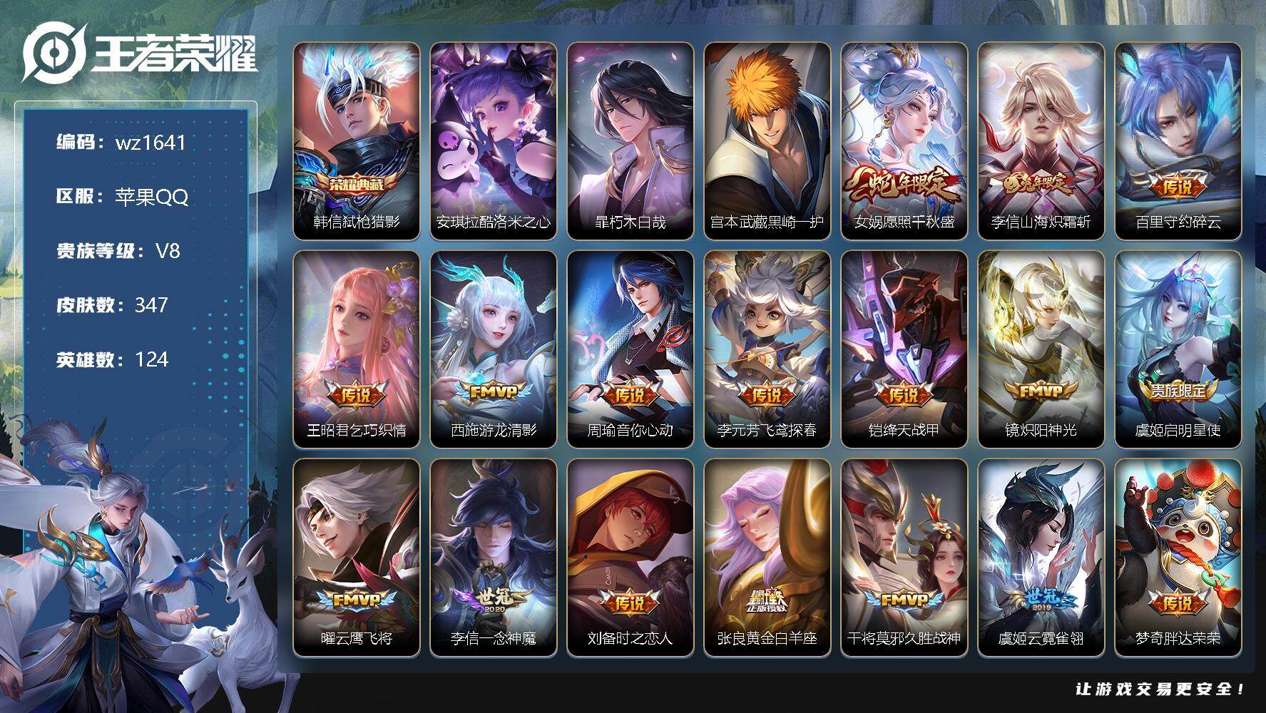 【账号佳】 【可二次实名】【wz1641】【商品标题】:苹果Q-V8-最强王者段位-124英雄-347皮肤-1典藏-0珍品无双-0无双-3珍品传说-21传说-89史诗 【英雄全皮】:刘邦全皮,李信全皮 【荣耀典藏】:韩信弑枪猎影 【珍品传说】:安琪拉酷洛米之心,暃朽木白哉,宫本武藏黑崎一护 【传说皮肤】:女娲愿照千秋盛,李信山海炽霜斩,百里守约碎云,王昭君乞巧织情,西施游龙清影,周瑜音你心动,李元芳飞鸢探春,铠绛天战甲,镜炽阳神光,虞姬启明星使,曜云鹰飞将,李信一念神魔,刘备时之恋人,张良黄金白羊座,干将莫邪久胜战神,虞姬云霓雀翎,梦奇胖达荣荣,后羿黄金射手座,貂蝉仲夏夜之梦,孙尚香末日机甲,宫本武藏地狱之眼 【限定皮肤】:白起狰,姜子牙天穹之誓,狄仁杰阴阳师,虞姬凯尔特女王,赵云皇家上将,墨子神迹守卫,嬴政优雅恋人,孙尚香蔷薇恋人,庄周蜃楼王,庄周高山流水,高渐离死亡摇滚,阿轲迷踪丽影,钟无艳王者之锤,扁鹊炼金王,芈月重明,芈月幻夜卜梦,周瑜赤莲之焰,元歌云间偶戏,元歌无心,夏侯惇朔风刀,曹操烛龙,典韦穷奇,马可波罗暗影游猎,马可波罗山海玄木吟,狄仁杰魔术师,狄仁杰万华元夜,达摩沙漠行僧,项羽海滩派对,老夫子醍醐杖,老夫子航海奇遇记,程咬金演武夺筹,刘邦夺宝奇兵,兰陵王驯魔猎人,兰陵王金庭之子,亚瑟潮玩骑士王,孙悟空至尊宝,牛魔御旌,后羿如梦令,后羿圣弓游侠,李元芳银河之约,李元芳云中旅人,虞姬启明星使,钟馗驱傩正仪,杨玉环遇见飞天,杨戬潮玩骑兵,干将莫邪真爱魔法,雅典娜单词大作战,雅典娜黎明之约,蔡文姬繁星吟游,太乙真人饕餮,太乙真人华丽摇滚,鬼谷子原初探秘者,鬼谷子五谷丰年,黄忠火炮绅士,苏烈千军破阵,百里玄策原初追逐者,弈星混沌棋,梦奇顽趣,沈梦溪星空之诺,沈梦溪大漠名商,明世隐疑决卦,裴擒虎李小龙,裴擒虎擒涛扼浪,狂铁御狮,米莱狄御霄,云中君纤云弄巧,李信山海炽霜斩,伽罗天狼溯光者,盾山御銮,猪八戒西部大镖客,上官婉儿梁祝,上官婉儿天狼绘梦者,嫦娥拒霜思,蒙犽狂想玩偶喵,镜匿光追影者,桑启海盐诗旅,艾琳流音漫舞,张良古海寻踪,蒙犽百解令,鬼谷子天穹祈灯,姬小满妄想食味,沈梦溪龙舞盛年,鲁班七号蔬乡物语,李元芳蔬乡物语,刘邦剑破天穹,项羽苍威无极,海诺心动手记,刘备异域游侠 【年限皮肤】:马超神威,马可波罗山海玄木吟,李信山海炽霜斩 【赛季限定】:庄周蜃楼王,扁鹊炼金王,白起狰,芈月重明,夏侯惇朔风刀,曹操烛龙,典韦穷奇,狄仁杰万华元夜,达摩沙漠行僧,老夫子醍醐杖,程咬金演武夺筹,兰陵王金庭之子,张良古海寻踪,牛魔御旌,李元芳云中旅人,虞姬凯尔特女王,钟馗驱傩正仪,雅典娜黎明之约,太乙真人饕餮,鬼谷子原初探秘者,苏烈千军破阵,百里玄策原初追逐者,弈星混沌棋,梦奇顽趣,沈梦溪大漠名商,明世隐疑决卦,裴擒虎擒涛扼浪,狂铁御狮,米莱狄御霄,盾山御銮,桑启海盐诗旅,鬼谷子天穹祈灯,刘邦剑破天穹,姜子牙天穹之誓 【战令限定】:墨子神迹守卫,阿轲迷踪丽影,芈月幻夜卜梦,周瑜赤莲之焰,元歌云间偶戏,马可波罗暗影游猎,老夫子航海奇遇记,刘邦夺宝奇兵,兰陵王驯魔猎人,艾琳流音漫舞,亚瑟潮玩骑士王,后羿圣弓游侠,李元芳银河之约,杨戬潮玩骑兵,干将莫邪真爱魔法,雅典娜单词大作战,黄忠火炮绅士,沈梦溪星空之诺,猪八戒西部大镖客,蒙犽狂想玩偶喵,鲁班七号蔬乡物语,李元芳蔬乡物语,项羽苍威无极 【史诗皮肤】:露娜紫霞仙子,阿轲暗夜猫娘,钟无艳王者之锤,赵云皇家上将,赵云未来纪元,貂蝉圣诞恋歌,甄姬冰雪圆舞曲,王昭君偶像歌手,狄仁杰魔术师,廉颇地狱岩魂,宫本武藏鬼剑武藏,孙尚香蔷薇恋人,孙尚香水果甜心,嬴政优雅恋人,嬴政摇滚巨星,妲己魅力维加斯,妲己女仆咖啡,墨子龙骑士,墨子金属风暴,吕布圣诞狂欢,刘禅绅士熊喵,曹操幽灵船长,吕布末日机甲,张飞乱世虎臣,孙悟空至尊宝,花木兰水晶猎龙者,刘邦德古拉伯爵,夏侯惇乘风破浪,小乔缤纷独角兽,兰陵王暗隐猎兽者,诸葛亮黄金分割率,亚瑟心灵战警,雅典娜冰冠公主,安琪拉心灵骇客,百里守约特工魅影,铠曙光守护者,刘禅天才门将,李元芳逐浪之夏,程咬金功夫厨神,白起星夜王子,阿轲节奏热浪,杨玉环遇见飞天,孙策猫狗日记,大乔猫狗日记,伽罗箭羽风息,狄仁杰鹰眼统帅,公孙离无限星赏官,兰陵王驯魔猎人,上官婉儿梁祝,蔡文姬繁星吟游,李元芳银河之约,后羿如梦令,阿轲迷踪丽影,橘右京修罗,瑶遇见神鹿,马超神威,孙尚香时之恋人,上官婉儿天狼绘梦者,马可波罗暗影游猎,蒙犽狂想玩偶喵,百里玄策原初追逐者,裴擒虎李小龙,云中君纤云弄巧,元歌云间偶戏,老夫子航海奇遇记,伽罗天狼溯光者,杨戬天秀启明,干将莫邪真爱魔法,钟馗乐园奇幻夜,庄周高山流水,嫦娥拒霜思,镜匿光追影者,黄忠火炮绅士,雅典娜黎明之约,鬼谷子五谷丰年,元歌无心,梦奇顽趣,马可波罗山海玄木吟,蒙犽百解