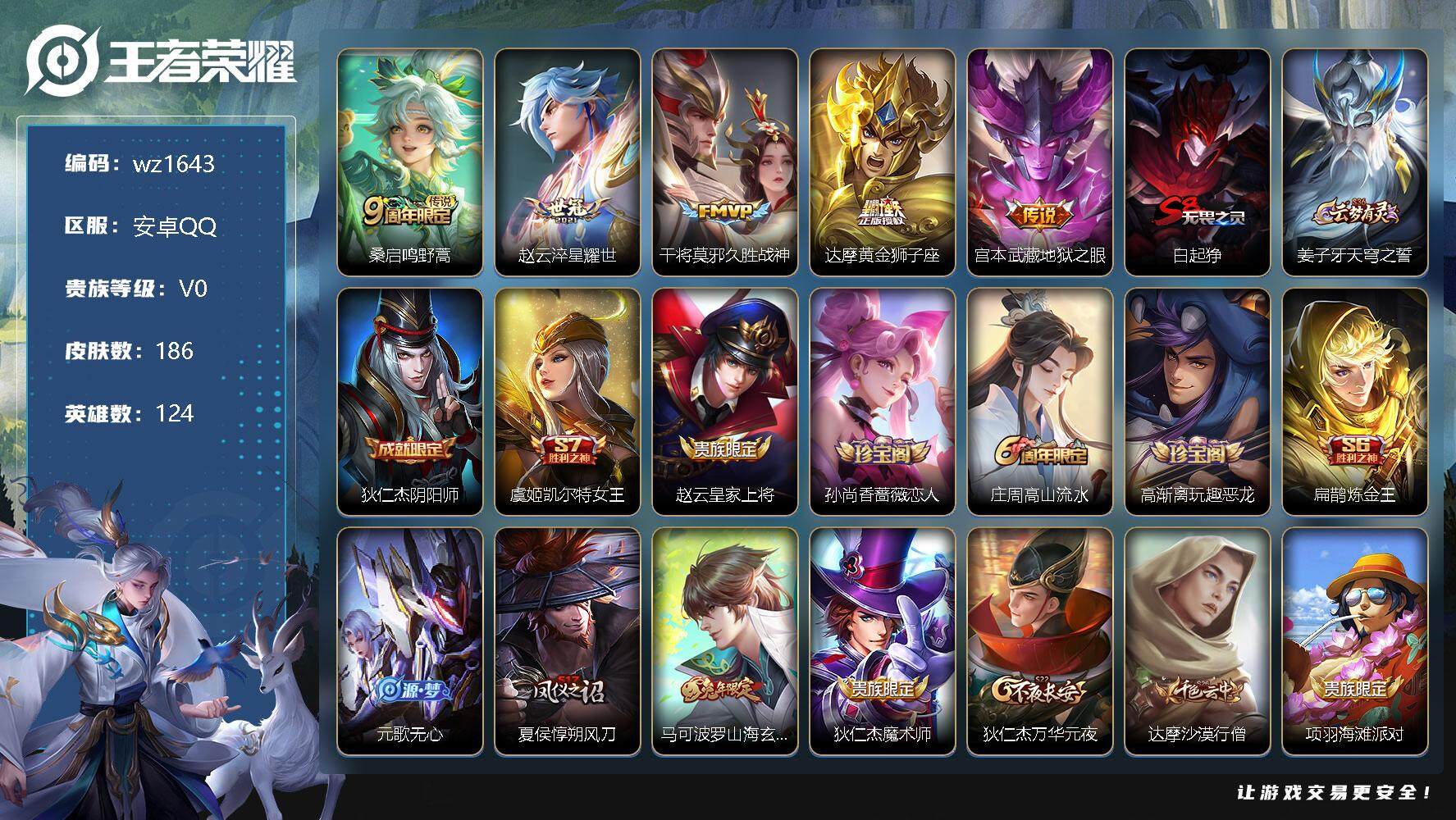 【账号佳】 【可二次实名】【wz1643】【商品标题】:安卓Q-V0-至尊星耀V段位-124英雄-186皮肤-0典藏-0珍品无双-0无双-0珍品传说-5传说-58史诗 【传说皮肤】:桑启鸣野蒿,赵云淬星耀世,干将莫邪久胜战神,达摩黄金狮子座,宫本武藏地狱之眼 【限定皮肤】:白起狰,姜子牙天穹之誓,狄仁杰阴阳师,虞姬凯尔特女王,赵云皇家上将,孙尚香蔷薇恋人,庄周高山流水,高渐离玩趣恶龙,扁鹊炼金王,元歌无心,夏侯惇朔风刀,马可波罗山海玄木吟,狄仁杰魔术师,狄仁杰万华元夜,达摩沙漠行僧,项羽海滩派对,老夫子醍醐杖,关羽冰锋战神,程咬金演武夺筹,韩信逐梦之影,韩信飞衡,花木兰青春决赛季,孙悟空至尊宝,孙悟空大圣娶亲,孙悟空孙行者,牛魔御旌,后羿辉光之辰,李元芳云中旅人,钟馗驱傩正仪,鬼谷子原初探秘者,鬼谷子五谷丰年,百里玄策原初追逐者,百里守约朱雀志,弈星混沌棋,明世隐疑决卦,裴擒虎李小龙,裴擒虎擒涛扼浪,米莱狄御霄,云中君纤云弄巧,盾山御銮,嫦娥拒霜思,桑启海盐诗旅,阿古朵江河有灵,张良古海寻踪,鬼谷子天穹祈灯,沈梦溪龙舞盛年,周瑜熔金海岸 【年限皮肤】:百里守约朱雀志,后羿辉光之辰,韩信飞衡,马可波罗山海玄木吟 【赛季限定】:扁鹊炼金王,白起狰,夏侯惇朔风刀,狄仁杰万华元夜,达摩沙漠行僧,老夫子醍醐杖,程咬金演武夺筹,张良古海寻踪,牛魔御旌,李元芳云中旅人,虞姬凯尔特女王,钟馗驱傩正仪,鬼谷子原初探秘者,百里玄策原初追逐者,弈星混沌棋,明世隐疑决卦,裴擒虎擒涛扼浪,米莱狄御霄,盾山御銮,桑启海盐诗旅,鬼谷子天穹祈灯,姜子牙天穹之誓 【史诗皮肤】:鲁班七号电玩小子,项羽苍穹之光,露娜紫霞仙子,赵云嘻哈天王,赵云皇家上将,貂蝉圣诞恋歌,甄姬冰雪圆舞曲,王昭君偶像歌手,狄仁杰魔术师,宫本武藏鬼剑武藏,孙尚香蔷薇恋人,孙尚香水果甜心,嬴政摇滚巨星,妲己女仆咖啡,刘禅绅士熊喵,曹操幽灵船长,李白千年之狐,吕布末日机甲,张飞乱世虎臣,韩信白龙吟,关羽冰锋战神,孙悟空至尊宝,花木兰水晶猎龙者,韩信逐梦之影,夏侯惇乘风破浪,小乔缤纷独角兽,兰陵王暗隐猎兽者,诸葛亮黄金分割率,亚瑟心灵战警,安琪拉心灵骇客,后羿辉光之辰,花木兰青春决赛季,百里守约特工魅影,铠曙光守护者,刘禅天才门将,李元芳逐浪之夏,程咬金功夫厨神,白起星夜王子,阿轲节奏热浪,孙策猫狗日记,百里守约朱雀志,孙悟空大圣娶亲,狄仁杰鹰眼统帅,娜可露露晚萤,韩信飞衡,小乔青蛇,百里玄策原初追逐者,裴擒虎李小龙,云中君纤云弄巧,孙悟空孙行者,庄周高山流水,嫦娥拒霜思,鬼谷子五谷丰年,元歌无心,马可波罗山海玄木吟,阿古朵江河有灵,黄忠百相守梦,公孙离涂山容容 【其他皮肤】:项羽海滩派对,韩信教廷特使,韩信街头霸王,达摩大发明家,赵云忍炎影,芈月红桃皇后,程咬金星际陆战队,白起白色死神,扁鹊化身博士,扁鹊救世之瞳,宫本武藏未来纪元,安琪拉玩偶对对碰,妲己少女阿狸,典韦黄金武士,达摩拳王,花木兰兔女郎,甄姬花好人间,刘备万事如意,宫本武藏万象初新,狄仁杰阴阳师,刘备纽约教父,刘备汉昭烈帝,扁鹊炼金王,关羽龙腾万里,虞姬凯尔特女王,墨子进击墨子号,白起狰,钟无艳海滩丽影,宫本武藏霸王丸,王昭君幻想奇妙夜,老夫子功夫老勺,李白敏锐之力,鬼谷子幻乐之宴,苏烈坚韧之力,项羽科学大爆炸,米莱狄御霄,明世隐虹云星官,牛魔御旌,小乔丁香结,吕布野性能量,盾山御銮,高渐离玩趣恶龙,沈梦溪鲨炮海盗猫,姜子牙炽热元素使,夏侯惇朔风刀,弈星混沌棋,哪吒次元突破,明世隐疑决卦,盾山圆桌骑士,老夫子醍醐杖,狂铁特工战影,鬼谷子原初探秘者,狄仁杰万华元夜,刘禅秘密基地,杨戬次元傲视,露娜瓷语鉴心,程咬金演武夺筹,张良缤纷绘卷,钟馗驱傩正仪,鲁班大师乓乓大师,达摩沙漠行僧,程咬金无双福将,李元芳云中旅人,桑启海盐诗旅,海月幻泉雾影,猪八戒潮玩探月行,裴擒虎擒涛扼浪,太乙真人劲辣红锅,李元芳妄想特派,张良古海寻踪,钟无艳聚星闪耀,后羿完美运算,鬼谷子天穹祈灯,廉颇功夫炙烤,沈梦溪龙舞盛年,钟无艳春野之旅,姜子牙天穹之誓,周瑜熔金海岸,盘古敬我三分,东皇太一噬灭天穹,太乙真人谧流熔炉,姜子牙星梦巡礼,戈娅玫蓝誓约,刘备浪漫序章,钟馗虚灵犬护,苏烈春野闲踪,张良灵野札记,阿古朵布丁狗之约,露娜命运加冕,姬小满小满鸭,白起死霸装,甄姬逆浪荇歌,莱西奥踏浪烽翎,亚瑟荣光之誓,钟无艳生化警戒,狄仁杰锦衣卫,曹操超能战警,周瑜海军大将,李白范海辛,钟馗地府判官,李元芳特种部队,虞姬加勒比小姐,夏侯惇战争骑士,雅典娜战争女神,马可波罗激情绿茵,杨戬埃及法老,大乔伊势巫女,百里玄策威尼斯狂欢,苏烈爱与和平,梦奇美梦成真,明世隐占星师,公孙离花间舞,杨玉环霓裳曲,裴擒虎街头旋风,弈星踏雪寻梅,元歌午夜歌剧院,孙策海之征途,司马懿魇语军师,盾山极冰防御线,李信灼热之刃