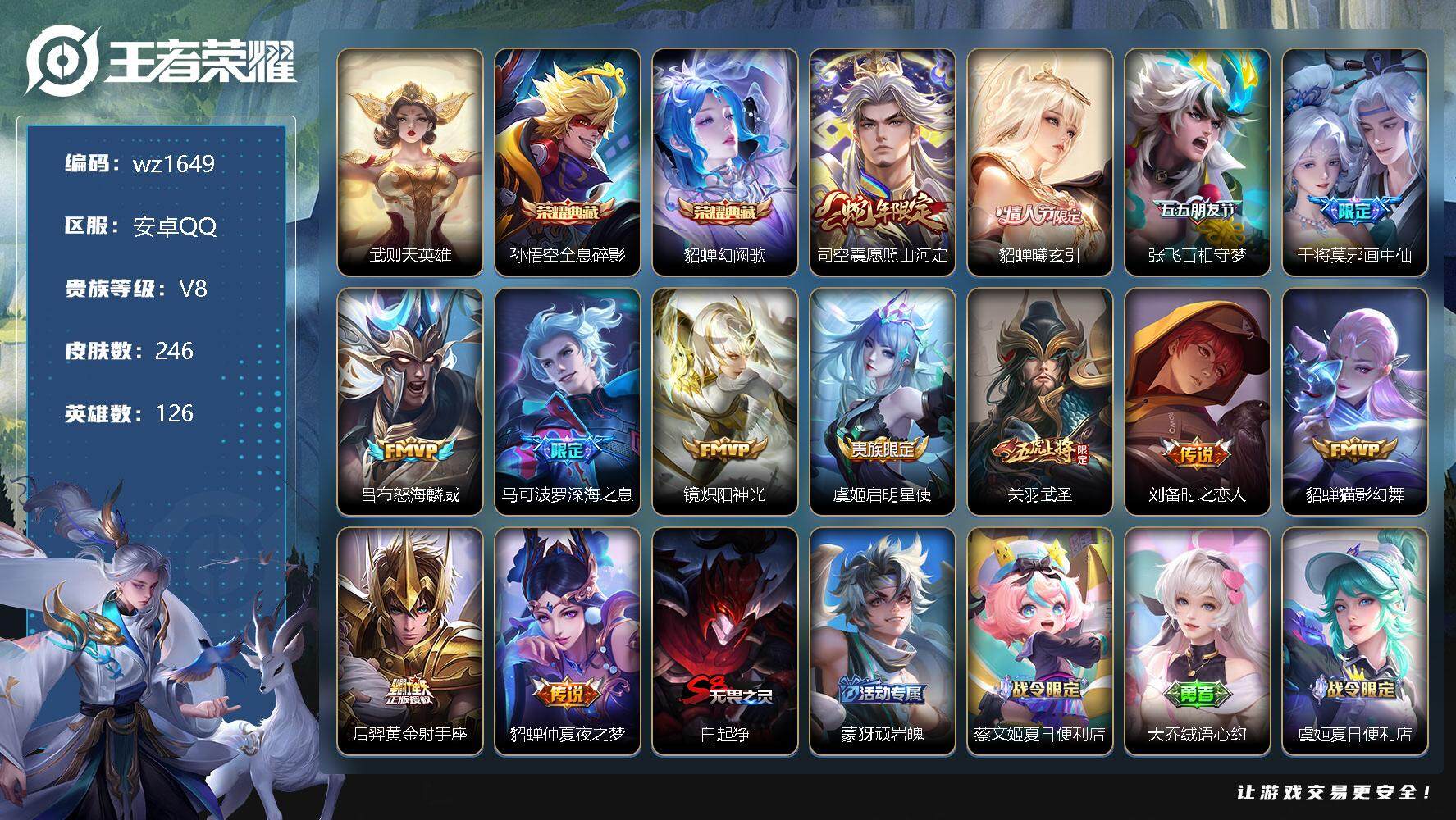 【账号佳】 【可二次实名】【wz1649】【商品标题】:安卓Q-V8-至尊星耀I段位-126英雄-246皮肤-2典藏-0珍品无双-0无双-0珍品传说-13传说-64史诗 【荣耀典藏】:武则天英雄,孙悟空全息碎影,貂蝉幻阙歌 【传说皮肤】:司空震愿照山河定,貂蝉曦玄引,张飞百相守梦,干将莫邪画中仙,吕布怒海麟威,马可波罗深海之息,镜炽阳神光,虞姬启明星使,关羽武圣,刘备时之恋人,貂蝉猫影幻舞,后羿黄金射手座,貂蝉仲夏夜之梦 【限定皮肤】:白起狰,蒙犽顽岩魄,蔡文姬夏日便利店,大乔绒语心约,虞姬夏日便利店,姜子牙天穹之誓,狄仁杰阴阳师,虞姬凯尔特女王,赵云皇家上将,赵云引擎之心,庄周蜃楼王,孙膑妖精王,扁鹊炼金王,扁鹊奇幻香踪,典韦穷奇,马可波罗深海之息,狄仁杰魔术师,狄仁杰万华元夜,达摩沙漠行僧,项羽海滩派对,老夫子醍醐杖,关羽武圣,程咬金演武夺筹,露娜一生所爱,兰陵王金庭之子,亚瑟狮心王,牛魔御旌,张飞百相守梦,李元芳云中旅人,虞姬启明星使,钟馗驱傩正仪,杨玉环遇见飞天,杨戬潮玩骑兵,女娲朔望之晖,干将莫邪画中仙,雅典娜黎明之约,鬼谷子原初探秘者,苏烈千军破阵,百里玄策原初追逐者,梦奇顽趣,沈梦溪大漠名商,明世隐疑决卦,裴擒虎李小龙,裴擒虎擒涛扼浪,狂铁御狮,米莱狄御霄,盾山御銮,上官婉儿梁祝,嫦娥暖冬兔眠,西施玲珑珍味,鲁班大师探海日志,桑启海盐诗旅,暃星界游侠,戈娅驭风魔法,艾琳女武神,阿古朵江河有灵,张良古海寻踪,蒙犽百解令,蒙恬荣光圣徽,鬼谷子天穹祈灯,姬小满妄想食味,貂蝉曦玄引,沈梦溪龙舞盛年,鲁班七号蔬乡物语,李元芳蔬乡物语,刘邦剑破天穹,周瑜熔金海岸 【年限皮肤】:关羽武圣 【赛季限定】:庄周蜃楼王,孙膑妖精王,扁鹊炼金王,白起狰,典韦穷奇,狄仁杰万华元夜,达摩沙漠行僧,老夫子醍醐杖,程咬金演武夺筹,兰陵王金庭之子,张良古海寻踪,亚瑟狮心王,牛魔御旌,李元芳云中旅人,虞姬凯尔特女王,钟馗驱傩正仪,雅典娜黎明之约,鬼谷子原初探秘者,苏烈千军破阵,百里玄策原初追逐者,梦奇顽趣,沈梦溪大漠名商,明世隐疑决卦,裴擒虎擒涛扼浪,狂铁御狮,米莱狄御霄,盾山御銮,鲁班大师探海日志,桑启海盐诗旅,鬼谷子天穹祈灯,蒙恬荣光圣徽,刘邦剑破天穹,姜子牙天穹之誓 【战令限定】:蔡文姬夏日便利店,虞姬夏日便利店,扁鹊奇幻香踪,杨戬潮玩骑兵,女娲朔望之晖,嫦娥暖冬兔眠,西施玲珑珍味,暃星界游侠,戈娅驭风魔法,鲁班七号蔬乡物语,李元芳蔬乡物语 【史诗皮肤】:鲁班七号电玩小子,赵云皇家上将,貂蝉圣诞恋歌,甄姬冰雪圆舞曲,王昭君偶像歌手,狄仁杰魔术师,廉颇地狱岩魂,宫本武藏鬼剑武藏,孙尚香水果甜心,嬴政暗夜贵公子,嬴政摇滚巨星,妲己女仆咖啡,墨子金属风暴,吕布圣诞狂欢,李白千年之狐,吕布末日机甲,张飞乱世虎臣,赵云引擎之心,花木兰水晶猎龙者,刘邦德古拉伯爵,夏侯惇乘风破浪,小乔缤纷独角兽,兰陵王暗隐猎兽者,诸葛亮黄金分割率,亚瑟心灵战警,雅典娜冰冠公主,安琪拉心灵骇客,百里守约特工魅影,铠曙光守护者,蔡文姬舞动绿茵,刘禅天才门将,李元芳逐浪之夏,程咬金功夫厨神,白起星夜王子,杨玉环遇见飞天,孙策猫狗日记,露娜一生所爱,伽罗箭羽风息,狄仁杰鹰眼统帅,上官婉儿梁祝,娜可露露晚萤,大乔白蛇,不知火舞魅语,百里玄策原初追逐者,裴擒虎李小龙,雅典娜黎明之约,夏洛特永昼,貂蝉唤灵魅影,梦奇顽趣,暃星界游侠,扁鹊奇幻香踪,刘禅电玩爆裂旋风,戈娅驭风魔法,海月浮梦罗烟,镜真我赫兹,阿古朵江河有灵,蒙犽百解令,蒙恬荣光圣徽,姬小满妄想食味,鲁班七号蔬乡物语,蔡文姬夏日便利店,蒙犽顽岩魄,牛魔星界战将,刘禅鸭鸭历险记 【其他皮肤】:项羽海滩派对,韩信教廷特使,韩信街头霸王,露娜哥特玫瑰,阿轲致命风华,达摩大发明家,赵云白执事,赵云忍炎影,艾琳女武神,白起白色死神,武则天东方不败,扁鹊化身博士,宫本武藏未来纪元,安琪拉玩偶对对碰,姜子牙时尚教父,妲己少女阿狸,典韦黄金武士,亚瑟死亡骑士,达摩拳王,花木兰兔女郎,张飞五福同心,甄姬花好人间,刘备万事如意,宫本武藏万象初新,亚瑟狮心王,狄仁杰阴阳师,庄周蜃楼王,刘备纽约教父,孙膑妖精王,刘备汉昭烈帝,李元芳黑猫爱糖果,扁鹊炼金王,关羽龙腾万里,虞姬凯尔特女王,白起狰,钟无艳海滩丽影,老夫子功夫老勺,孙尚香沉稳之力,典韦穷奇,鬼谷子幻乐之宴,狂铁御狮,苏烈坚韧之力,大乔守护之力,米莱狄御霄,明世隐虹云星官,庄周奇妙博物学,牛魔御旌,女娲朔望之晖,吕布野性能量,盾山御銮,孙膑归虚梦演,沈梦溪鲨炮海盗猫,姜子牙炽热元素使,哪吒次元突破,明世隐疑决卦,老夫子醍醐杖,狂铁特工战影,鬼谷子原初探秘者,狄仁杰万华元夜,刘禅秘密基地,程咬金演武夺筹,张良缤纷绘卷,钟馗驱傩正仪,鲁班大师乓乓大师,苏烈千军破阵,达摩沙漠行僧,程咬金无双福将,兰陵王金庭之子,刘禅唤