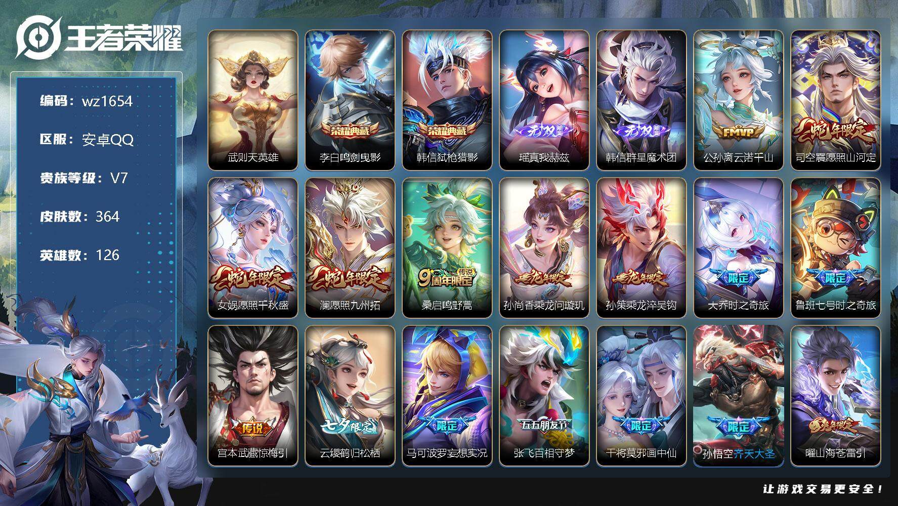 【账号佳】 【可二次实名】【wz1654】【商品标题】:安卓Q-V7-永恒钻石III段位-126英雄-364皮肤-2典藏-0珍品无双-2无双-0珍品传说-26传说-116史诗 【英雄全皮】:蒙恬全皮,司空震全皮,戈娅全皮 【荣耀典藏】:武则天英雄,李白鸣剑曳影,韩信弑枪猎影 【无双皮肤】:瑶真我赫兹,韩信群星魔术团 【传说皮肤】:公孙离云诺千山,司空震愿照山河定,女娲愿照千秋盛,澜愿照九州拓,桑启鸣野蒿,孙尚香乘龙问璇玑,孙策乘龙淬吴钩,大乔时之奇旅,鲁班七号时之奇旅,宫本武藏惊梅引,云缨鹤归松栖,马可波罗妄想实况,张飞百相守梦,干将莫邪画中仙,孙悟空齐天大圣,曜山海苍雷引,李白诗剑行,鲁班七号寅虎瑞焰,孙尚香异界灵契,诸葛亮时雨天司,虞姬启明星使,李信一念神魔,干将莫邪久胜战神,达摩黄金狮子座,梦奇胖达荣荣,诸葛亮武陵仙君 【限定皮肤】:大乔绒语心约,姜子牙天穹之誓,狄仁杰阴阳师,赵云皇家上将,赵云引擎之心,赵云百木心枪,墨子神迹守卫,嬴政优雅恋人,孙尚香异界灵契,鲁班七号寅虎瑞焰,鲁班七号时之奇旅,庄周高山流水,高渐离死亡摇滚,高渐离玩趣恶龙,钟无艳超时空战士,扁鹊奇幻香踪,白起夜都怪侠,芈月幻夜卜梦,周瑜赤莲之焰,元歌云间偶戏,元歌无心,夏侯惇朔风刀,甄姬游园惊梦,甄姬落雪兰心,典韦蓝屏警告,马可波罗暗影游猎,马可波罗山海玄木吟,马可波罗妄想实况,狄仁杰魔术师,狄仁杰万华元夜,达摩沙漠行僧,项羽海滩派对,老夫子醍醐杖,老夫子航海奇遇记,关羽百相守梦,安琪拉魔法小厨娘,程咬金演武夺筹,韩信飞衡,韩信傲雪梅枪,王昭君午后时光,兰陵王驯魔猎人,兰陵王金庭之子,花木兰青春决赛季,亚瑟潮玩骑士王,孙悟空美猴王,孙悟空大圣娶亲,孙悟空孙行者,孙悟空齐天大圣,后羿如梦令,后羿圣弓游侠,刘备百相守梦,张飞百相守梦,李元芳银河之约,李元芳匿光侦查者,李元芳云中旅人,虞姬启明星使,钟馗驱傩正仪,杨玉环寅虎心曲,杨戬潮玩骑兵,女娲朔望之晖,干将莫邪真爱魔法,干将莫邪画中仙,雅典娜单词大作战,雅典娜黎明之约,蔡文姬繁星吟游,太乙真人华丽摇滚,鬼谷子原初探秘者,鬼谷子五谷丰年,诸葛亮武陵仙君,诸葛亮时雨天司,大乔时之奇旅,黄忠火炮绅士,苏烈千军破阵,百里玄策原初追逐者,百里守约朱雀志,弈星混沌棋,梦奇顽趣,公孙离蜜橘之夏,公孙离玉兔公主,沈梦溪星空之诺,沈梦溪大漠名商,明世隐疑决卦,明世隐吟游魔法,裴擒虎李小龙,裴擒虎擒涛扼浪,狂铁电玩高手,云中君纤云弄巧,伽罗天狼溯光者,盾山御銮,猪八戒猪悟能,上官婉儿梁祝,嫦娥拒霜思,嫦娥暖冬兔眠,曜山海苍雷引,西施玲珑珍味,西施至美乘鲤谣,蒙犽狂想玩偶喵,鲁班大师探海日志,镜匿光追影者,桑启海盐诗旅,暃星界游侠,戈娅驭风魔法,艾琳女武神,艾琳流音漫舞,赵怀真鹤归松栖,云缨鹤归松栖,司空震地狱燃心,阿古朵江河有灵,张良古海寻踪,蒙犽百解令,蒙恬荣光圣徽,鬼谷子天穹祈灯,安琪拉乘龙聚宝船,孙尚香乘龙问璇玑,孙策乘龙淬吴钩,沈梦溪龙舞盛年,鲁班七号蔬乡物语,李元芳蔬乡物语,刘邦剑破天穹,程咬金群星魔术团,韩信群星魔术团,周瑜熔金海岸 【年限皮肤】:百里守约朱雀志,孙悟空美猴王,鲁班七号寅虎瑞焰,杨玉环寅虎心曲,诸葛亮时雨天司,韩信飞衡,马超神威,马可波罗山海玄木吟,曜山海苍雷引,安琪拉乘龙聚宝船,孙尚香乘龙问璇玑,孙策乘龙淬吴钩 【赛季限定】:夏侯惇朔风刀,狄仁杰万华元夜,达摩沙漠行僧,老夫子醍醐杖,程咬金演武夺筹,兰陵王金庭之子,张良古海寻踪,李元芳云中旅人,钟馗驱傩正仪,雅典娜黎明之约,鬼谷子原初探秘者,苏烈千军破阵,百里玄策原初追逐者,弈星混沌棋,梦奇顽趣,沈梦溪大漠名商,明世隐疑决卦,裴擒虎擒涛扼浪,盾山御銮,鲁班大师探海日志,桑启海盐诗旅,鬼谷子天穹祈灯,蒙恬荣光圣徽,刘邦剑破天穹,姜子牙天穹之誓 【战令限定】:墨子神迹守卫,钟无艳超时空战士,扁鹊奇幻香踪,白起夜都怪侠,芈月幻夜卜梦,周瑜赤莲之焰,元歌云间偶戏,甄姬落雪兰心,典韦蓝屏警告,马可波罗暗影游猎,老夫子航海奇遇记,王昭君午后时光,兰陵王驯魔猎人,艾琳流音漫舞,亚瑟潮玩骑士王,后羿圣弓游侠,李元芳银河之约,杨戬潮玩骑兵,女娲朔望之晖,干将莫邪真爱魔法,雅典娜单词大作战,黄忠火炮绅士,沈梦溪星空之诺,明世隐吟游魔法,狂铁电玩高手,嫦娥暖冬兔眠,西施玲珑珍味,蒙犽狂想玩偶喵,司空震地狱燃心,暃星界游侠,戈娅驭风魔法,鲁班七号蔬乡物语,李元芳蔬乡物语 【史诗皮肤】:鲁班七号电玩小子,项羽苍穹之光,露娜紫霞仙子,阿轲暗夜猫娘,赵云皇家上将,貂蝉圣诞恋歌,甄姬冰雪圆舞曲,王昭君偶像歌手,狄仁杰魔术师,廉颇地狱岩魂,宫本武藏鬼剑武藏,孙尚香水果甜心,嬴政优雅恋人,嬴政暗夜贵公子,妲己魅力维加斯,妲己女仆咖啡,墨子龙骑士,墨子金属风暴,吕布圣诞狂欢,刘禅绅士熊喵,曹操幽灵船长,李