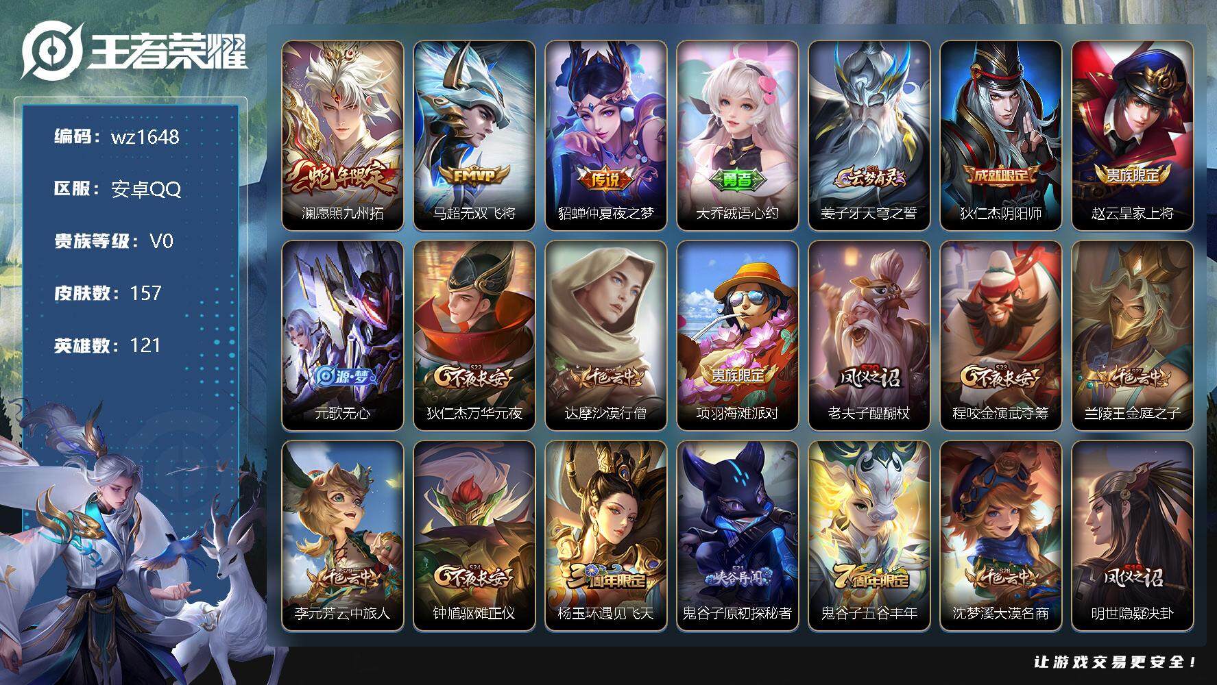 【账号佳】 【可二次实名】【wz1648】【商品标题】:安卓Q-V0-至尊星耀III段位-121英雄-157皮肤-0典藏-0珍品无双-0无双-0珍品传说-3传说-36史诗 【英雄全皮】:蒙恬全皮 【传说皮肤】:澜愿照九州拓,马超无双飞将,貂蝉仲夏夜之梦 【限定皮肤】:大乔绒语心约,姜子牙天穹之誓,狄仁杰阴阳师,赵云皇家上将,元歌无心,狄仁杰万华元夜,达摩沙漠行僧,项羽海滩派对,老夫子醍醐杖,程咬金演武夺筹,兰陵王金庭之子,李元芳云中旅人,钟馗驱傩正仪,杨玉环遇见飞天,鬼谷子原初探秘者,鬼谷子五谷丰年,沈梦溪大漠名商,明世隐疑决卦,裴擒虎李小龙,裴擒虎擒涛扼浪,嫦娥拒霜思,西施玲珑珍味,鲁班大师探海日志,桑启海盐诗旅,戈娅驭风魔法,艾琳女武神,阿古朵江河有灵,张良古海寻踪,蒙犽百解令,蒙恬荣光圣徽,鬼谷子天穹祈灯,姬小满妄想食味,刘邦剑破天穹,程咬金群星魔术团,周瑜熔金海岸 【赛季限定】:狄仁杰万华元夜,达摩沙漠行僧,老夫子醍醐杖,程咬金演武夺筹,兰陵王金庭之子,张良古海寻踪,李元芳云中旅人,钟馗驱傩正仪,鬼谷子原初探秘者,沈梦溪大漠名商,明世隐疑决卦,裴擒虎擒涛扼浪,鲁班大师探海日志,桑启海盐诗旅,鬼谷子天穹祈灯,蒙恬荣光圣徽,刘邦剑破天穹,姜子牙天穹之誓 【战令限定】:西施玲珑珍味,戈娅驭风魔法 【史诗皮肤】:赵云皇家上将,赵云未来纪元,甄姬冰雪圆舞曲,王昭君偶像歌手,宫本武藏鬼剑武藏,孙尚香水果甜心,妲己魅力维加斯,墨子金属风暴,李白千年之狐,夏侯惇乘风破浪,小乔缤纷独角兽,兰陵王暗隐猎兽者,亚瑟心灵战警,百里守约特工魅影,蔡文姬舞动绿茵,李元芳逐浪之夏,白起星夜王子,阿轲节奏热浪,杨玉环遇见飞天,大乔猫狗日记,伽罗箭羽风息,狄仁杰鹰眼统帅,不知火舞魅语,瑶遇见神鹿,孙尚香时之恋人,裴擒虎李小龙,嫦娥拒霜思,鬼谷子五谷丰年,元歌无心,刘禅电玩爆裂旋风,戈娅驭风魔法,阿古朵江河有灵,蒙犽百解令,蒙恬荣光圣徽,姬小满妄想食味,赵怀真器灵浮梦炉 【其他皮肤】:项羽海滩派对,韩信教廷特使,韩信街头霸王,露娜哥特玫瑰,艾琳女武神,扁鹊化身博士,扁鹊救世之瞳,宫本武藏未来纪元,安琪拉玩偶对对碰,姜子牙时尚教父,妲己少女阿狸,亚瑟死亡骑士,达摩拳王,花木兰兔女郎,张飞五福同心,甄姬花好人间,刘备万事如意,狄仁杰阴阳师,宫本武藏霸王丸,狂铁命运角斗场,李白敏锐之力,鬼谷子幻乐之宴,苏烈坚韧之力,明世隐虹云星官,沈梦溪鲨炮海盗猫,哪吒次元突破,明世隐疑决卦,盾山圆桌骑士,老夫子醍醐杖,鬼谷子原初探秘者,狄仁杰万华元夜,刘禅秘密基地,程咬金演武夺筹,张良缤纷绘卷,钟馗驱傩正仪,鲁班大师乓乓大师,达摩沙漠行僧,程咬金无双福将,兰陵王金庭之子,沈梦溪大漠名商,蒙恬蔚蓝守将,李元芳云中旅人,桑启海盐诗旅,海月幻泉雾影,猪八戒潮玩探月行,牛魔牛运亨通,白起乐园追猎者,赵怀真太极少年,裴擒虎擒涛扼浪,太乙真人劲辣红锅,莱西奥西部游侠,鲁班大师探海日志,西施玲珑珍味,姬小满零食大作战,李元芳妄想特派,哪吒热血海滩,张良古海寻踪,钟无艳聚星闪耀,海月王牌新星,兰陵王幻夜行动,曹操决胜大满贯,后羿完美运算,鬼谷子天穹祈灯,朵莉亚金色潮汐,廉颇功夫炙烤,亚瑟鸿运当头,刘邦剑破天穹,程咬金群星魔术团,大司命暗都幽影,姜子牙天穹之誓,周瑜熔金海岸,大乔绒语心约,东皇太一噬灭天穹,苍苍林狼骑,太乙真人谧流熔炉,典韦铁骨偃魂,少司缘灵卦秘语,戈娅玫蓝誓约,钟馗虚灵犬护,苏烈春野闲踪,张良灵野札记,阿古朵布丁狗之约,露娜命运加冕,姬小满小满鸭,白起死霸装,项羽帝国元帅,貂蝉异域舞娘,狄仁杰锦衣卫,曹操超能战警,张良一千零一夜,后羿精灵王,兰陵王隐刃,李白范海辛,马可波罗激情绿茵,苍维京掠夺者,铠龙域领主,百里守约绝影神枪,梦奇美梦成真,公孙离花间舞,杨玉环霓裳曲,裴擒虎街头旋风,弈星踏雪寻梅,元歌午夜歌剧院,孙策海之征途,沈梦溪棒球奇才,李信灼热之刃,上官婉儿修竹墨客,瑶森,云中君荷鲁斯之眼,曜归虚梦演,马超幸存者,西施归虚梦演,鲁班大师归虚梦演,蒙犽归虚梦演,镜冰刃幻境,蒙恬秩序猎龙将,阿古朵熊喵少女,云缨赤焰之缨 【内测皮肤】:艾琳女武神 【营地ID】:1779336741
