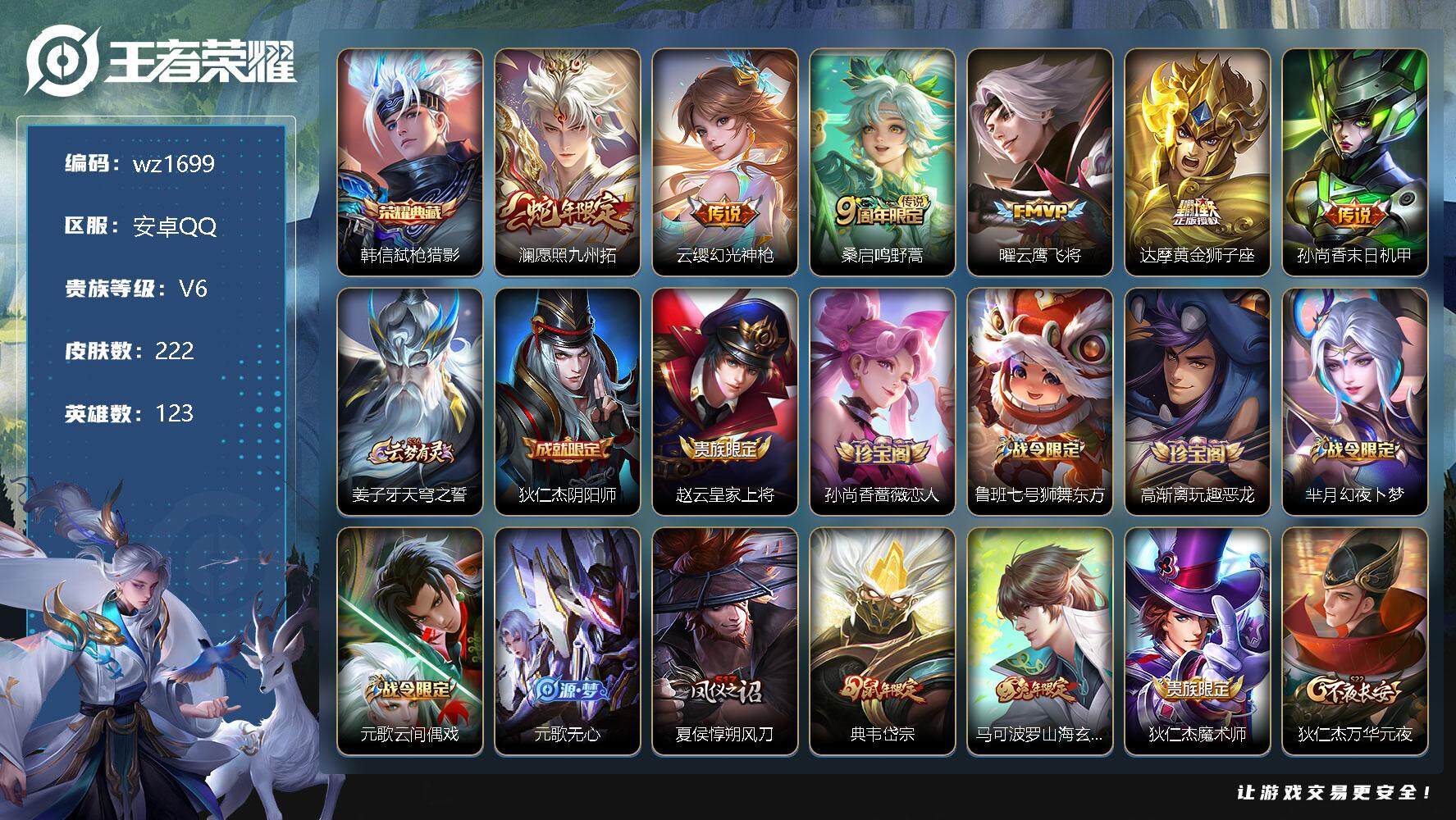 【账号佳】 【可二次实名】【wz1699】【商品标题】:安卓Q-V6-至尊星耀V段位-123英雄-222皮肤-1典藏-0珍品无双-0无双-0珍品传说-6传说-49史诗 【英雄全皮】:影全皮 【荣耀典藏】:韩信弑枪猎影 【传说皮肤】:澜愿照九州拓,云缨幻光神枪,桑启鸣野蒿,曜云鹰飞将,达摩黄金狮子座,孙尚香末日机甲 【限定皮肤】:姜子牙天穹之誓,狄仁杰阴阳师,赵云皇家上将,孙尚香蔷薇恋人,鲁班七号狮舞东方,高渐离玩趣恶龙,芈月幻夜卜梦,元歌云间偶戏,元歌无心,夏侯惇朔风刀,典韦岱宗,马可波罗山海玄木吟,狄仁杰魔术师,狄仁杰万华元夜,达摩沙漠行僧,项羽海滩派对,老夫子醍醐杖,程咬金演武夺筹,露娜一生所爱,兰陵王金庭之子,亚瑟潮玩骑士王,孙悟空孙行者,牛魔御旌,李元芳银河之约,李元芳云中旅人,钟馗驱傩正仪,雅典娜黎明之约,鬼谷子原初探秘者,鬼谷子五谷丰年,黄忠火炮绅士,苏烈千军破阵,弈星混沌棋,沈梦溪星空之诺,沈梦溪大漠名商,明世隐疑决卦,裴擒虎李小龙,裴擒虎擒涛扼浪,云中君纤云弄巧,盾山御銮,上官婉儿梁祝,嫦娥拒霜思,西施玲珑珍味,蒙犽狂想玩偶喵,鲁班大师探海日志,桑启海盐诗旅,戈娅驭风魔法,张良古海寻踪,鬼谷子天穹祈灯,沈梦溪龙舞盛年,刘邦剑破天穹,程咬金群星魔术团,周瑜熔金海岸 【年限皮肤】:典韦岱宗,马可波罗山海玄木吟 【赛季限定】:夏侯惇朔风刀,狄仁杰万华元夜,达摩沙漠行僧,老夫子醍醐杖,程咬金演武夺筹,兰陵王金庭之子,张良古海寻踪,牛魔御旌,李元芳云中旅人,钟馗驱傩正仪,雅典娜黎明之约,鬼谷子原初探秘者,苏烈千军破阵,弈星混沌棋,沈梦溪大漠名商,明世隐疑决卦,裴擒虎擒涛扼浪,盾山御銮,鲁班大师探海日志,桑启海盐诗旅,鬼谷子天穹祈灯,刘邦剑破天穹,姜子牙天穹之誓 【战令限定】:鲁班七号狮舞东方,芈月幻夜卜梦,元歌云间偶戏,亚瑟潮玩骑士王,李元芳银河之约,黄忠火炮绅士,沈梦溪星空之诺,西施玲珑珍味,蒙犽狂想玩偶喵,戈娅驭风魔法 【史诗皮肤】:露娜紫霞仙子,赵云皇家上将,甄姬冰雪圆舞曲,狄仁杰魔术师,廉颇地狱岩魂,宫本武藏鬼剑武藏,孙尚香蔷薇恋人,孙尚香水果甜心,嬴政摇滚巨星,墨子金属风暴,吕布圣诞狂欢,刘禅绅士熊喵,曹操幽灵船长,李白千年之狐,吕布末日机甲,花木兰水晶猎龙者,刘邦德古拉伯爵,夏侯惇乘风破浪,小乔缤纷独角兽,兰陵王暗隐猎兽者,诸葛亮黄金分割率,铠曙光守护者,蔡文姬舞动绿茵,刘禅天才门将,程咬金功夫厨神,孙策猫狗日记,露娜一生所爱,鲁班七号狮舞东方,狄仁杰鹰眼统帅,上官婉儿梁祝,李元芳银河之约,典韦岱宗,蒙犽狂想玩偶喵,裴擒虎李小龙,云中君纤云弄巧,元歌云间偶戏,孙悟空孙行者,嫦娥拒霜思,黄忠火炮绅士,雅典娜黎明之约,鬼谷子五谷丰年,元歌无心,马可波罗山海玄木吟,戈娅驭风魔法,百里守约百相守梦,孙膑茶境仙,刘禅鸭鸭历险记,狂铁龙之律动,黄忠百相守梦 【其他皮肤】:项羽海滩派对,韩信教廷特使,韩信街头霸王,露娜哥特玫瑰,阿轲爱心护理,达摩大发明家,赵云白执事,赵云忍炎影,芈月红桃皇后,白起白色死神,扁鹊化身博士,宫本武藏未来纪元,妲己少女阿狸,典韦黄金武士,达摩拳王,花木兰兔女郎,张飞五福同心,甄姬花好人间,刘备万事如意,宫本武藏万象初新,后羿阿尔法小队,狄仁杰阴阳师,刘备纽约教父,关羽龙腾万里,墨子进击墨子号,钟无艳海滩丽影,王昭君幻想奇妙夜,老夫子功夫老勺,牛魔制霸全明星,孙尚香沉稳之力,李白敏锐之力,鬼谷子幻乐之宴,苏烈坚韧之力,大乔守护之力,明世隐虹云星官,牛魔御旌,吕布野性能量,盾山御銮,孙膑归虚梦演,高渐离玩趣恶龙,沈梦溪鲨炮海盗猫,姜子牙炽热元素使,夏侯惇朔风刀,沈梦溪星空之诺,弈星混沌棋,哪吒次元突破,鲁班七号黑桃队长,明世隐疑决卦,老夫子醍醐杖,狂铁特工战影,鬼谷子原初探秘者,狄仁杰万华元夜,亚瑟潮玩骑士王,刘禅秘密基地,杨戬次元傲视,露娜瓷语鉴心,程咬金演武夺筹,张良缤纷绘卷,钟馗驱傩正仪,鲁班大师乓乓大师,苏烈千军破阵,达摩沙漠行僧,芈月幻夜卜梦,程咬金无双福将,兰陵王金庭之子,米莱狄契约魔法,沈梦溪大漠名商,蒙恬蔚蓝守将,李元芳云中旅人,桑启海盐诗旅,猪八戒潮玩探月行,牛魔牛运亨通,赵怀真太极少年,裴擒虎擒涛扼浪,太乙真人劲辣红锅,鲁班大师探海日志,西施玲珑珍味,姬小满零食大作战,李元芳妄想特派,张良古海寻踪,钟无艳聚星闪耀,亚连破局者,鬼谷子天穹祈灯,海诺时空谍影,廉颇功夫炙烤,沈梦溪龙舞盛年,刘邦剑破天穹,程咬金群星魔术团,貂蝉长夏之忆,姜子牙天穹之誓,周瑜熔金海岸,东皇太一噬灭天穹,老夫子百相守梦,干将莫邪雾都夜雨,吕布逐霄战戟,苍苍林狼骑,太乙真人谧流熔炉,典韦铁骨偃魂,马超访茗客,影魅影绮裳,西施雪境奇遇,姜子牙星梦巡礼,东皇太一金福满堂,达摩爆裂喵拳,少司缘灵卦秘语,明世隐景韶洛都,戈娅玫蓝誓约,刘备