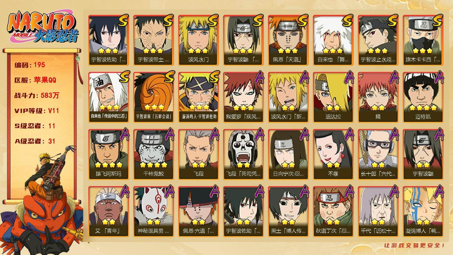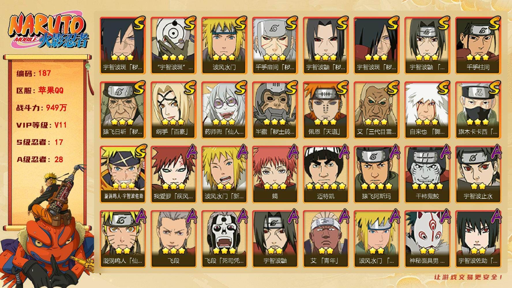 【账号佳】 【可二次实名】可二次苹果QQ282区【V11】【949万战力】17S级忍者数-28A级忍者数【送金币4697】【S级忍者】:半藏「秽土转生」(3星),猿飞日斩「秽土转生」(3星),千手扉间「秽土转生」(3星),宇智波鼬「秽土转生」(3星),宇智波斑「秽土转生」(3星),宇智波斑「秽土转生·解」(3星),宇智波鼬「须佐能乎」(3星),旗木卡卡西「须佐能乎」(3星),艾「三代目雷影」(3星),自来也「舞之豪杰」(3星),纲手「百豪」(3星),千手柱间(3星),波风水门(3星),药师兜「仙人模式」(3星),佩恩「天道」(3星),宇智波斑 「白面具」(3星宇智波斑「白面具」),漩涡鸣人·宇智波佐助(3星)【A级忍者】:艾「青年」(2星),波风水门「青年」(2星),波风水门「新春限定」(2星),迪达拉「秽土转生」(3星),大蛇丸「晓」(2星),飞段(3星),飞段「死司凭血」(3星),干柿鬼鲛(4星),漩涡博人「桃式显现」(2星),漩涡鸣人「仙人模式」(2星),漩涡鸣人「九尾查克拉」(2星),迈特凯(5星),桃地再不斩「秽土转生」(2星),我爱罗「疾风传」(3星),蝎(3星),猿飞阿斯玛(4星),宇智波止水(2星),宇智波鼬(2星),宇智波佐助「须佐能乎」(2星),宇智波佐助「万花筒写轮眼」(2星),药师兜「半蛇斗篷」(2星),照美冥「五代目水影」(2星),神秘面具男「忍者之路」(2星),李洛克「忍界大战」(2星),猿飞木叶丸「博人传」(2星),秋道丁次「忍界大战」(2星),神农「羁绊」(2星),迈特凯「青春爆炸」(2星)各种道具详情看截图、低价出售找回包 赔、截图展示段位不代 表实际段位,如赛季更新等不可抗拒因素发生变化、时限道具不保证所剩时间、标题未写送点劵默认不送【卖号买号首选亿梦】
