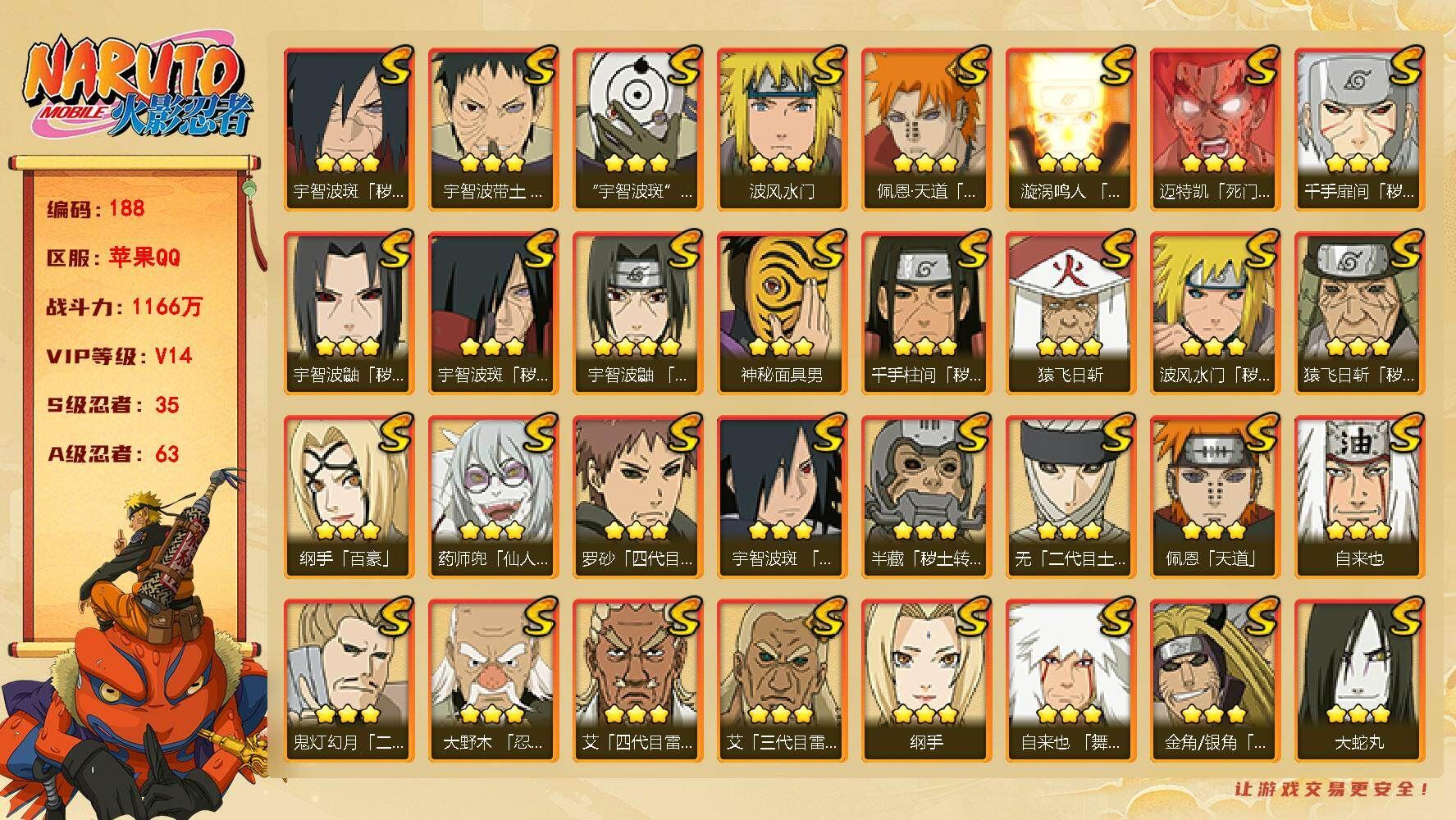 【账号佳】 【可二次实名】【kf4054】苹果q区13s32a,漩涡鸣人,万花筒佐助,舞之豪杰自来也,传说中的三忍自来也,九喇嘛波风水门,秽土转生千手柱间,须佐能乎宇智波鼬,秽土转生宇智波鼬,忍界大战宇智波带土,忍界大战艾,天道佩恩,