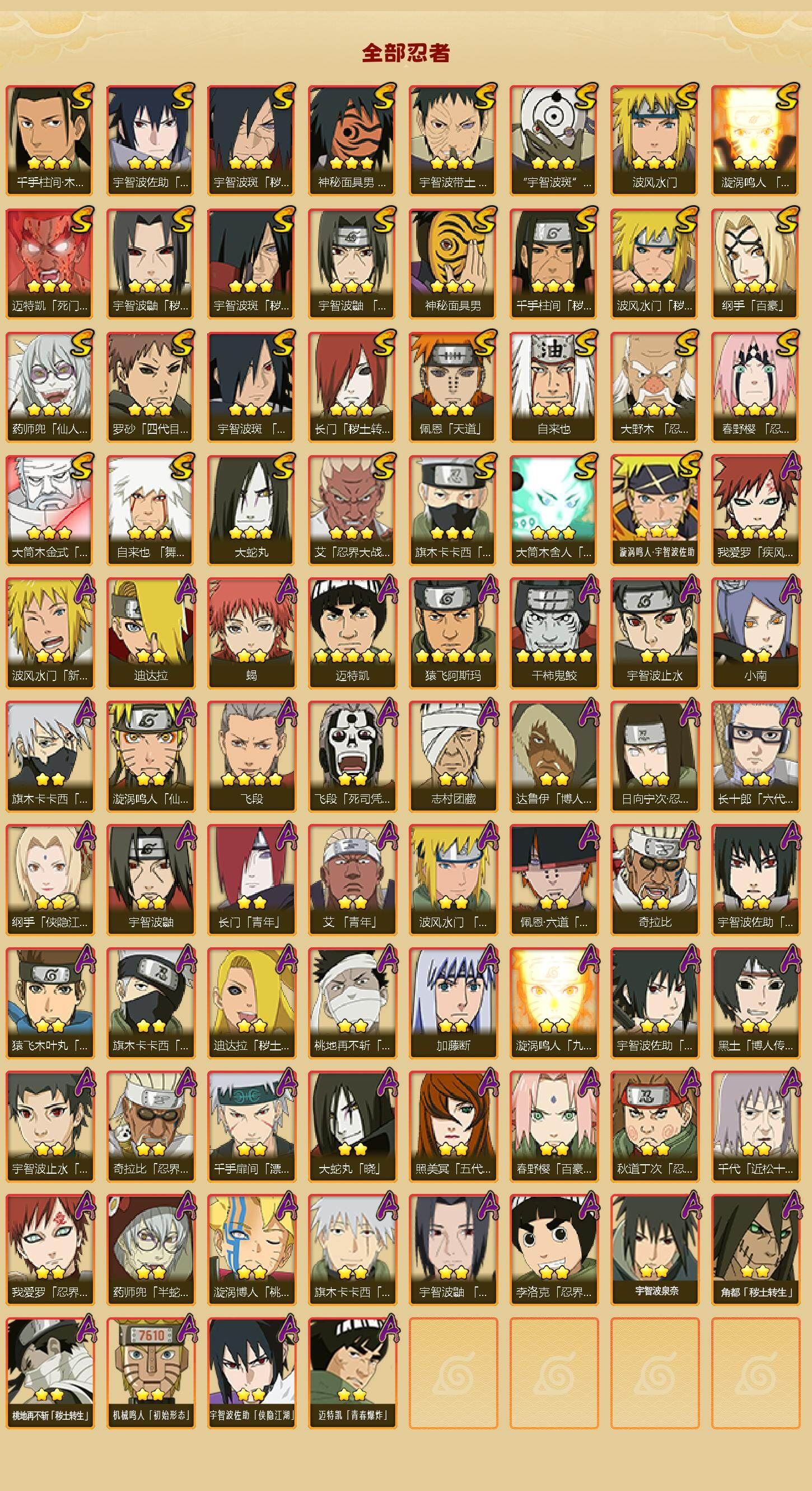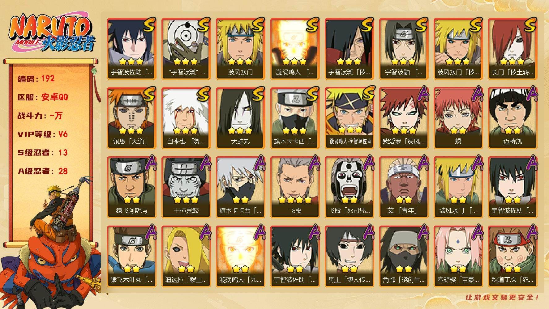 【账号佳】 【可二次实名】【kf4040】安卓q区12323709战力v12,22s忍者41A忍者,水门,漩涡鸣人暴怒第六尾,忍界大战春野樱,须佐能乎旗木卡卡西,舞之豪杰自来也,九喇嘛波风水门,秽土转生木叶创立宇智波斑,解斑,神驹佑将宇智波斑,须佐能乎宇智波鼬,宇智波止水,无影会谈宇智波斑,十尾人柱力宇智波带土,天道佩恩,超佩恩天道,最终章大筒木舍人,
