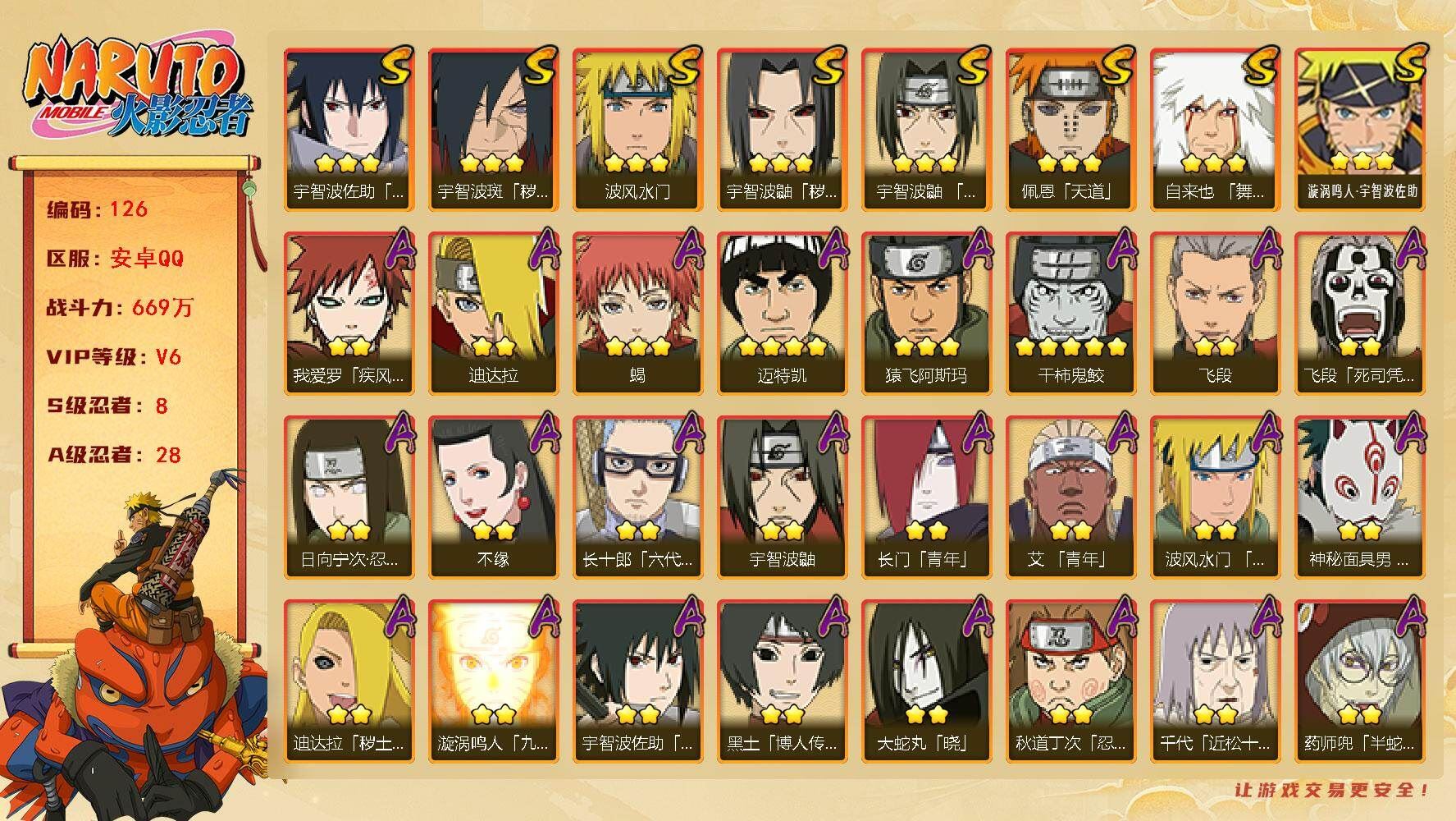 【账号佳】 【可二次实名】可二次安卓QQ2258区 【V6】【669万战力】8S级忍者数-28A级忍者数【S级忍者】:宇智波鼬「秽土转生」(3星),宇智波斑「秽土转生·解」(3星),宇智波鼬「须佐能乎」(3星),自来也「舞之豪杰」(3星),波风水门(3星),佩恩「天道」(3星),宇智波佐助「永恒万花筒」(3星),漩涡鸣人·宇智波佐助(3星)【A级忍者】:艾「青年」(2星),长门「青年」(2星),波风水门「青年」(2星),迪达拉(2星),迪达拉「秽土转生」(2星),大蛇丸「晓」(2星),飞段(2星),飞段「死司凭血」(2星),干柿鬼鲛(5星),漩涡鸣人「九尾查克拉」(2星),迈特凯(4星),旗木卡卡西「幻之真容」(2星),我爱罗「疾风传」(2星),蝎(3星),猿飞阿斯玛(3星),宇智波鼬(2星),宇智波佐助「须佐能乎」(2星),药师兜「半蛇斗篷」(2星),日向宁次「忍界大战」(2星),长十郎「六代目水影」(2星),神秘面具男「忍者之路」(2星),黑土「博人传」(2星),秋道丁次「忍界大战」(2星),千代「近松十人卫」(2星),不缘(2星),宇智波泉奈(2星),大野木「侠隐江湖」(2星),迈特凯「青春爆炸」(2星)各种道具详情看截图、低价出售找回包 赔、截图展示段位不代 表实际段位,如赛季更新等不可抗拒因素发生变化、时限道具不保证所剩时间、标题未写送点劵默认不送【卖号买号首选亿梦】