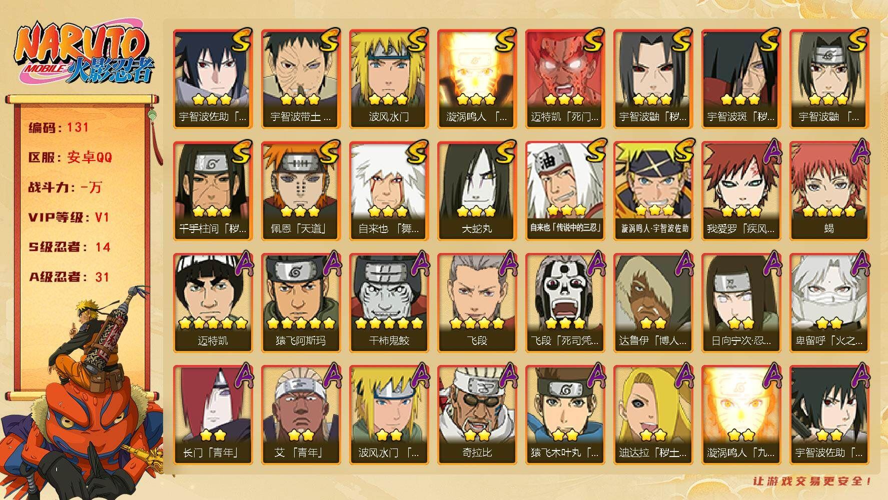 【账号佳】 【可二次实名】可二次安卓QQ4072区 【V4】【320万战力】5S级忍者数-11A级忍者数【送金币4337】【S级忍者】:宇智波鼬「须佐能乎」(3星),自来也「舞之豪杰」(3星),佩恩「天道」(3星),宇智波斑 「白面具」(3星宇智波斑「白面具」),漩涡鸣人·宇智波佐助(3星)【A级忍者】:长门「青年」(2星),机械鸣人「初始形态」(2星),迈特凯(2星),旗木卡卡西「万花筒写轮眼」(2星),蝎(2星),猿飞阿斯玛(2星),宇智波鼬「夏日限定」(2星),长十郎「六代目水影」(2星),千代「近松十人卫」(2星),宇智波泉奈(2星),迈特凯「青春爆炸」(2星)