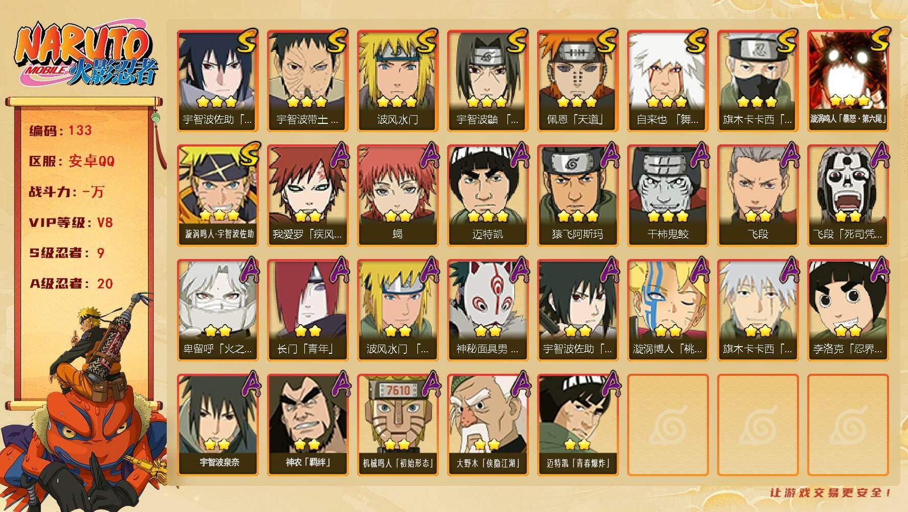 【账号佳】 【可二次实名】可二次QQ 【火影安卓】v8 【战力:4681629】9S级忍者数-20A级忍者数【S级忍者】:宇智波带土「忍界大战」(3星),宇智波鼬「须佐能乎」(3星),旗木卡卡西「须佐能乎」(3星),自来也「舞之豪杰」(3星),波风水门(3星),佩恩「天道」(3星),宇智波佐助「永恒万花筒」(3星),漩涡鸣人「暴怒·第六尾」(3星),漩涡鸣人·宇智波佐助(3星)【A级忍者】:长门「青年」(2星),波风水门「青年」(2星),飞段(2星),飞段「死司凭血」(2星),干柿鬼鲛(3星),漩涡博人「桃式显现」(2星),机械鸣人「初始形态」(2星),迈特凯(3星),旗木卡卡西「幻之真容」(2星),我爱罗「疾风传」(2星),蝎(2星),猿飞阿斯玛(3星),宇智波佐助「须佐能乎」(2星),卑留呼「火之意志继承者」(2星),神秘面具男「忍者之路」(2星),李洛克「忍界大战」(2星),神农「羁绊」(2星),宇智波泉奈(2星),大野木「侠隐江湖」(2星),迈特凯「青春爆炸」(2星),各种道具详情看截图、低价出售找回包 赔、截图展示段位不代 表实际段位,如赛季更新等不可抗拒因素发生变化、时限道具不保证所剩时间、标题未写送点劵默认不送【卖号买号首选亿梦】