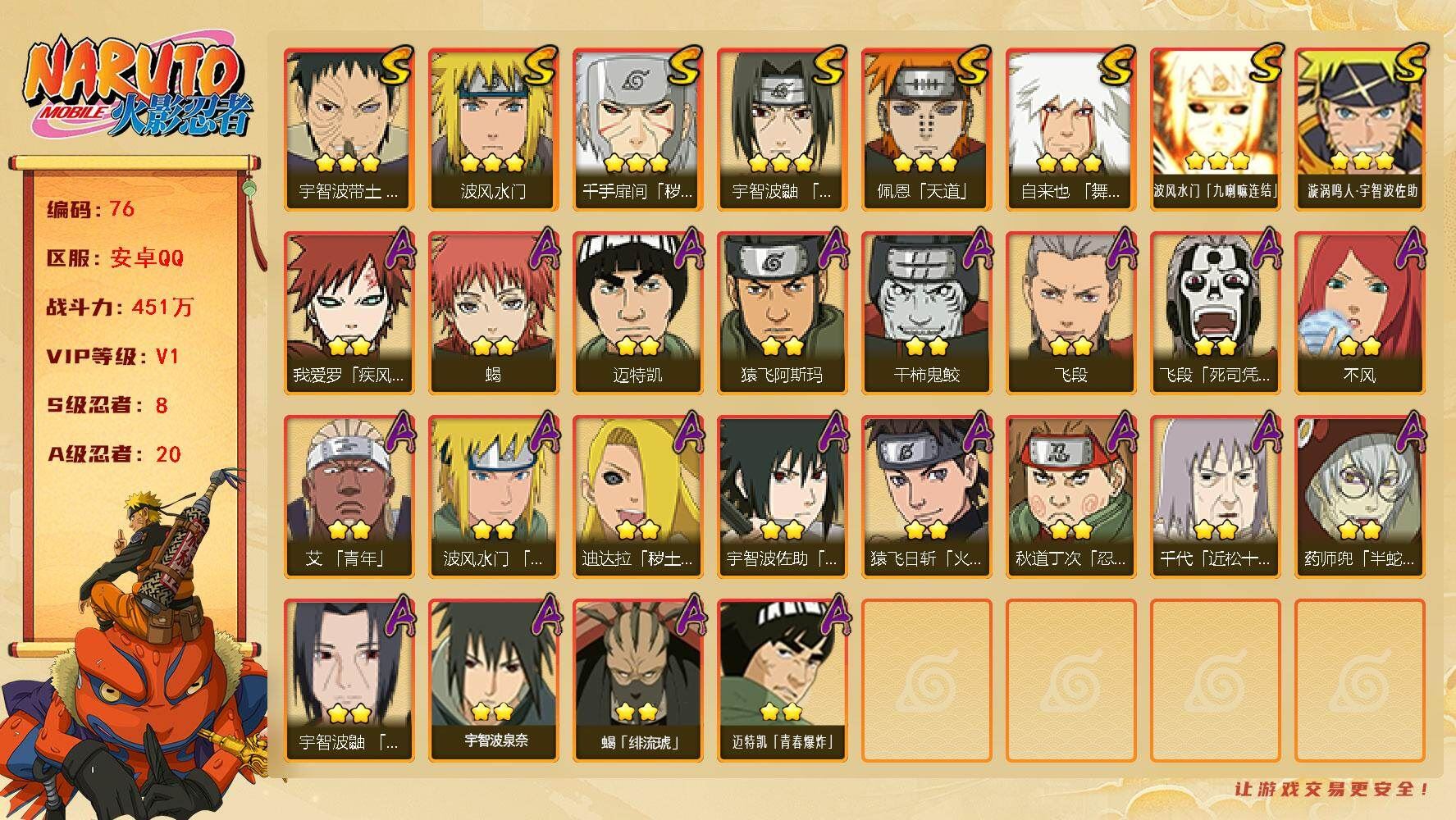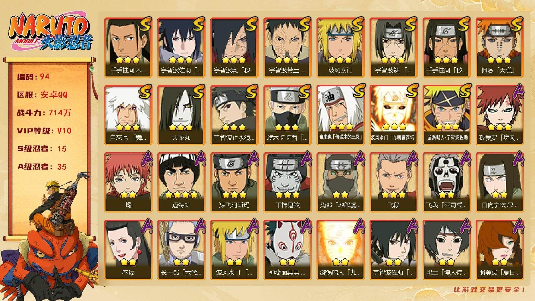 【账号佳】 【可二次实名】r41452-安卓qq-可二次-1632区-12v【35s/47a】【大蛇丸+纲手+猿飞日斩+九喇嘛连结漩涡鸣人+永恒万花筒佐助+忍界大战春野樱+须佐能乎卡卡西+自来也+舞之豪杰自来也+百豪纲手+死门迈特凯+波风水门+秽土转生猿飞日斩+秽土转生千手扉间+千手柱间+木叶创立千手柱间+秽土转生千手柱间+秽土转生宇智波斑+秽土转生解宇智波斑+须佐能乎宇智波鼬+秽土转生宇智波鼬+须佐能乎宇智波止水+神秘面具男+白面具宇智波斑+忍界大战宇智波带土+红夜之刃神秘面具男+四代目风影罗砂+忍界大战艾+三代目雷影艾+二代目土影无+天道佩恩+超佩恩天道+仙人模式药师兜+大筒木桃式+大筒木金式】【迈特凯+猿飞阿斯玛+蝎+干柿鬼鲛+疾风传我爱罗+飞段+忍界大战奇拉比+死司凭血飞段+仙人模式漩涡鸣人+九尾查克拉漩涡鸣人】【送29771金币/高招券73】各种道具详情看截图、低价出售找回包赔、截图展示段位不代表实际段位,如赛季更新等不可抗拒因素发生变化、时限道具不保证所剩时间、标题未写送点卷默认不送【卖号买号首选亿梦】