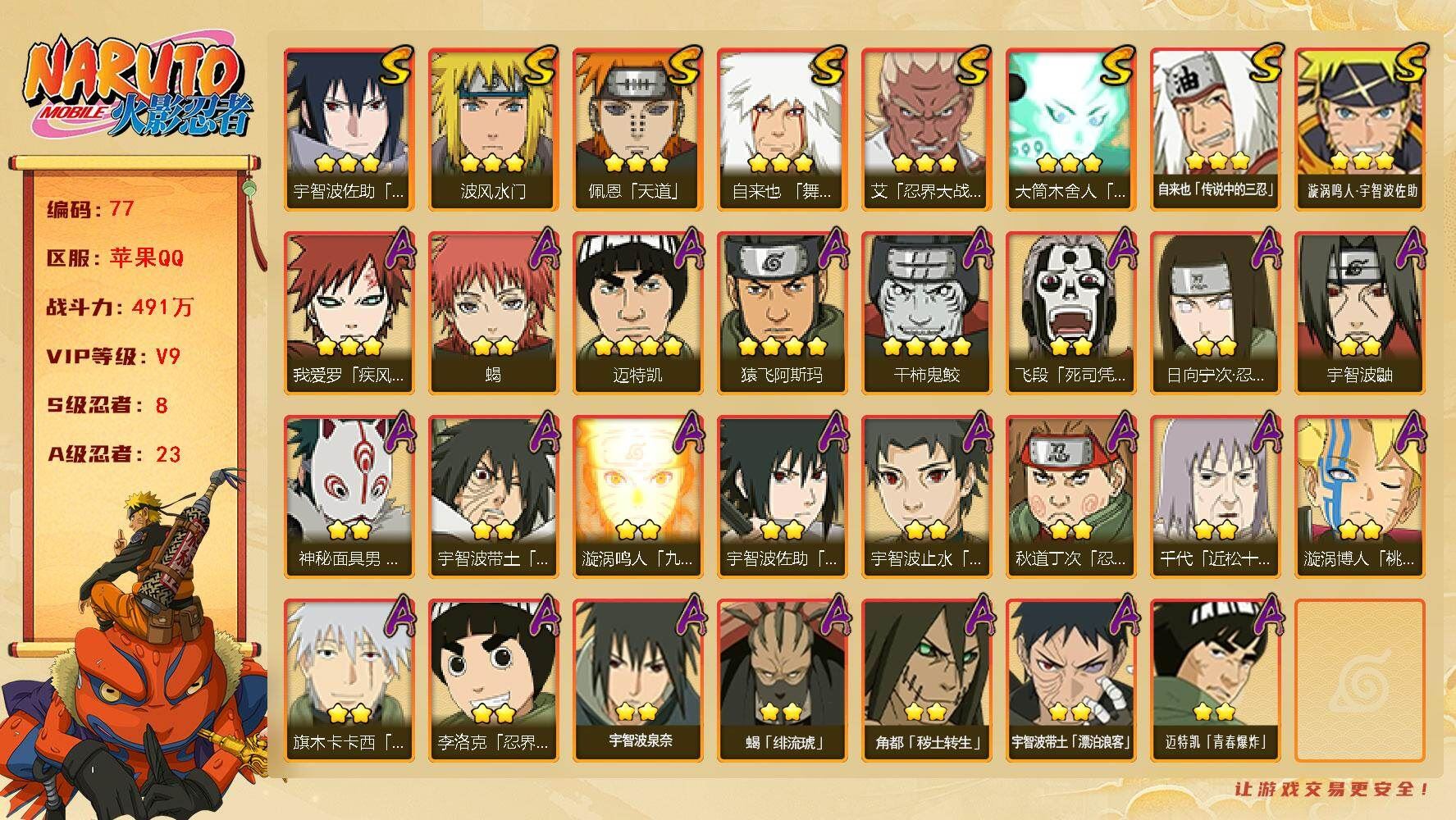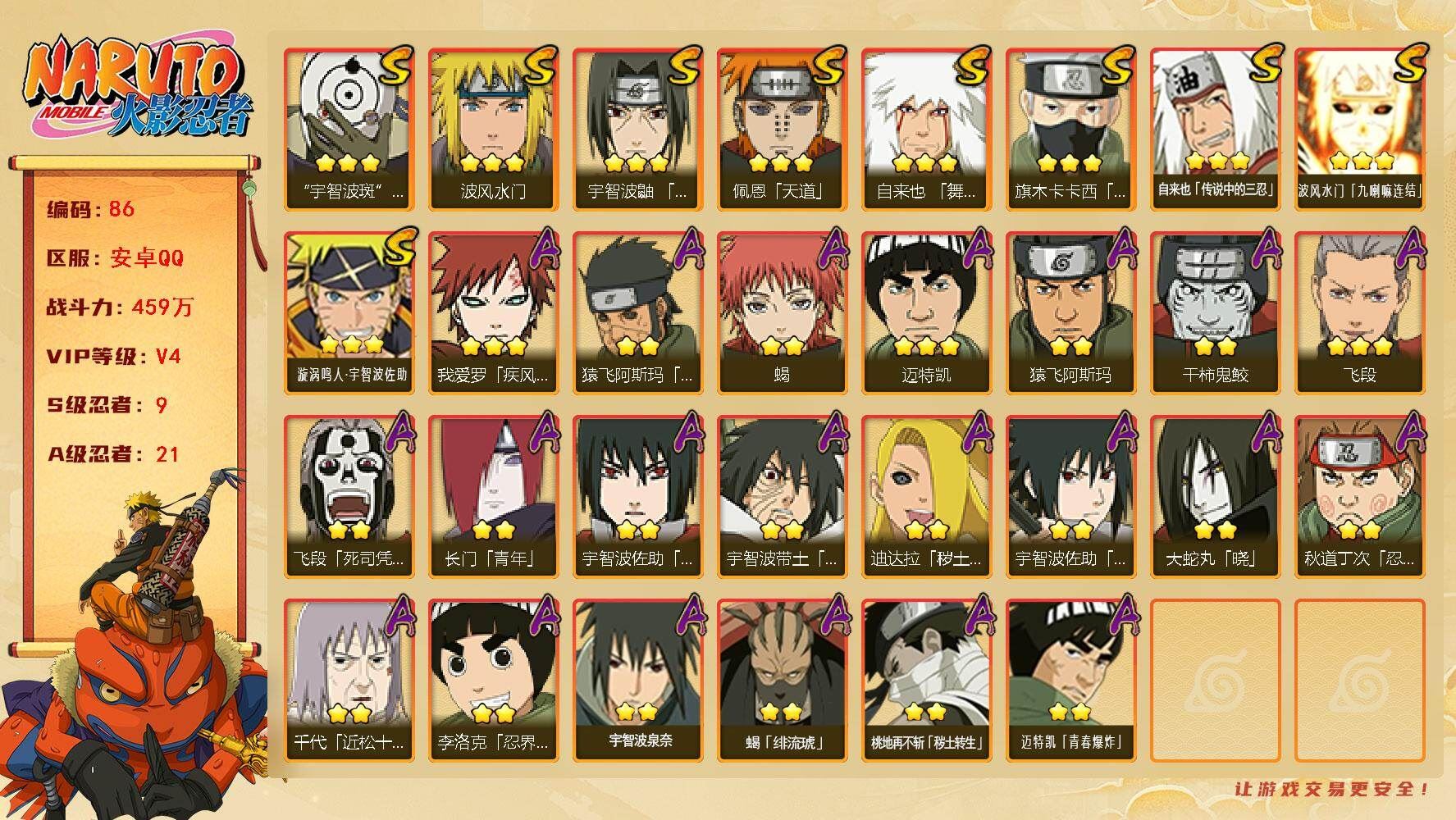 【账号佳】 【可二次实名】R51187 可二次安卓QQ3365区【v4】【459万战力】9S级忍者数-21A级忍者数【S级忍者】:宇智波鼬「须佐能乎」(3星),旗木卡卡西「须佐能乎」(3星),自来也「舞之豪杰」(3星),自来也「传说中的三忍」(3星),波风水门(3星),佩恩「天道」(3星),宇智波斑 「白面具」(3星宇智波斑「白面具」),波风水门「九喇嘛连结」(3星),漩涡鸣人·宇智波佐助(3星)【A级忍者】:长门「青年」(2星),迪达拉「秽土转生」(2星),大蛇丸「晓」(2星),飞段(3星),飞段「死司凭血」(2星),干柿鬼鲛(2星),迈特凯(3星),桃地再不斩「秽土转生」(2星),我爱罗「疾风传」(3星),蝎(2星),蝎「绯流琥」(2星),猿飞阿斯玛(2星),猿飞阿斯玛「秽土转生」(2星),宇智波佐助「须佐能乎」(2星),宇智波佐助「万花筒写轮眼」(2星),宇智波带土「暴怒」(2星),李洛克「忍界大战」(2星),秋道丁次「忍界大战」(2星),千代「近松十人卫」(2星),宇智波泉奈(2星),迈特凯「青春爆炸」(2星)各种道具详情看截图、低价出售找回包 赔、截图展示段位不代 表实际段位,如赛季更新等不可抗拒因素发生变化、时限道具不保证所剩时间、标题未写送点劵默认不送【卖号买号首选亿梦】