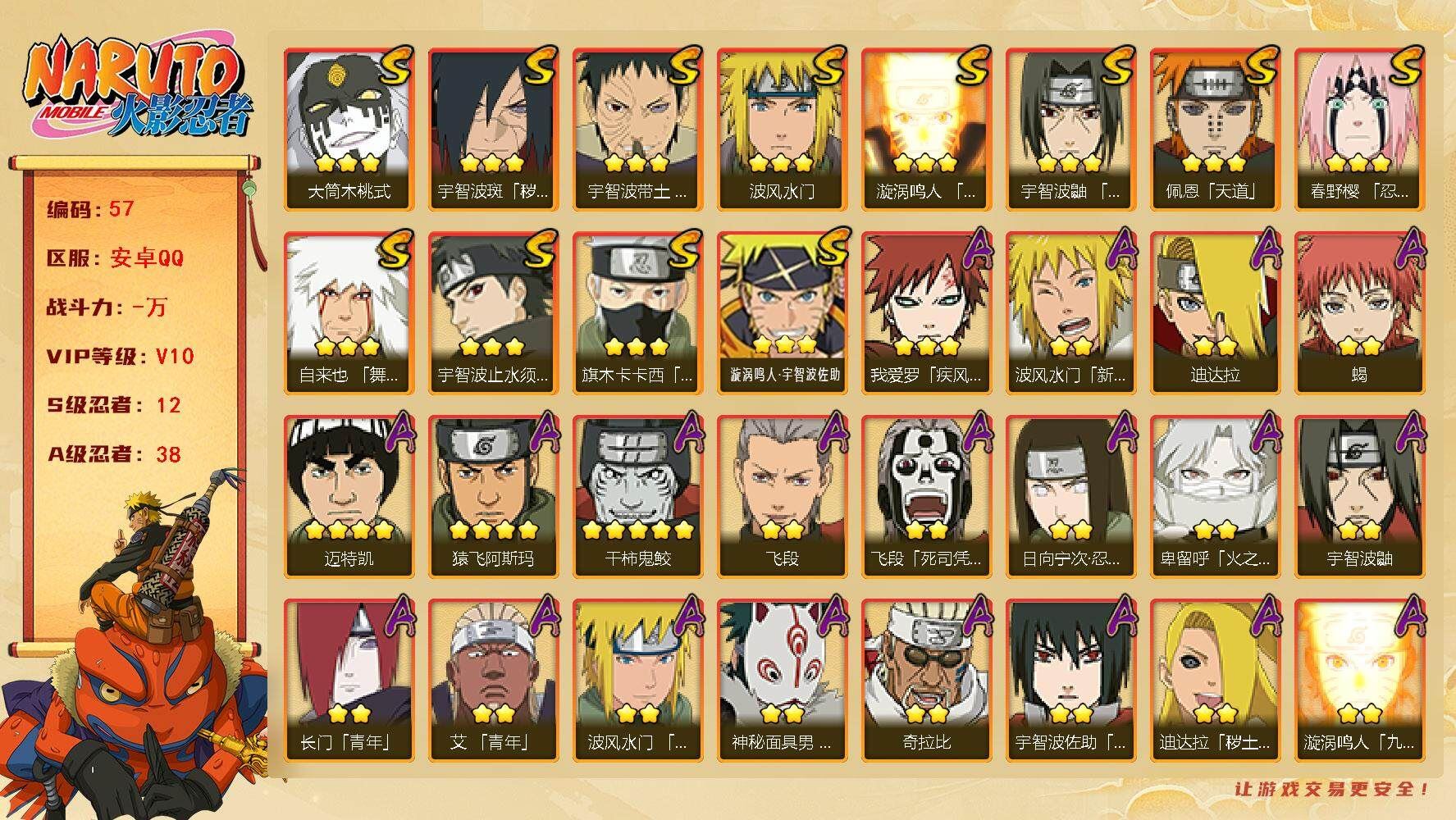 【账号佳】 【可二次实名】r34764 可二次安卓qq640区【v11】【1200万战力】【20s】【32a】【大蛇丸+纲手+九喇嘛鸣人+舞之豪杰自来也+百豪纲手+水门+秽土扉间+柱间+秽土斑+秽土解斑+秽土鼬+白面具斑+忍界大战艾+三代目雷影艾+三代目土影大野木+秽土半藏+二代目土影无+天道佩恩+仙人模式药师兜+大筒木桃式】【迈特凯+猿飞阿斯玛+干柿鬼鲛+疾风传我爱罗+飞段+蝎+九尾鸣人+最终章日向雏田+万花筒卡卡西+小南】详情请看图片【卖号买号首选亿梦】