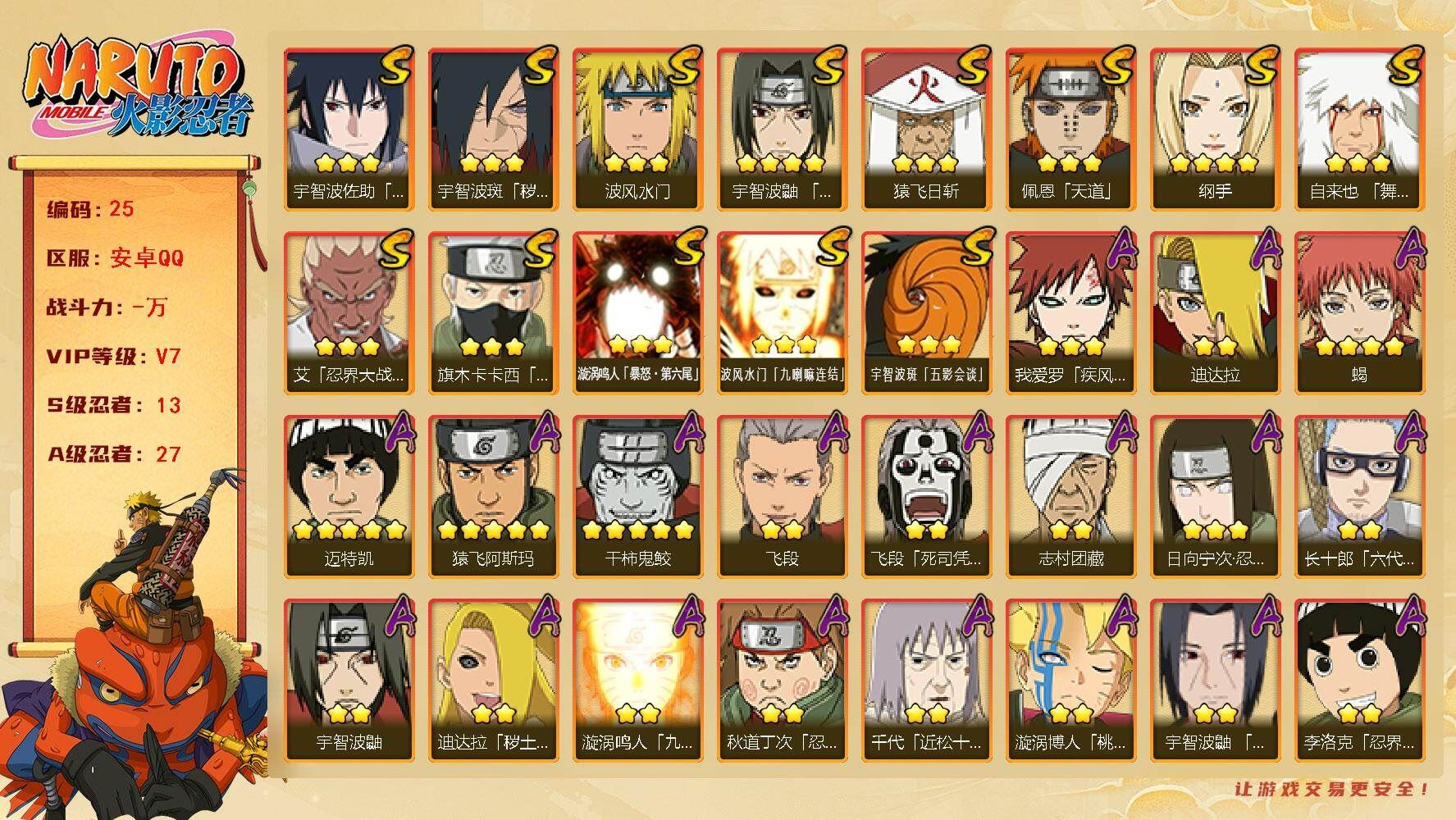 【账号佳】 【可二次实名】r34339 可二次安卓qq513区【v11】【1628万战力】【32s】【47a】【大蛇丸+水门+天道佩恩+九喇嘛鸣人+永恒万花筒佐助+忍界大战春野樱+自来也+舞之豪杰自来也+纲手+百豪纲手+死门迈特凯+秽土水门+猿飞日斩+秽土猿飞日斩+秽土扉间+扉间+柱间+木叶创立柱间+秽土柱间+斑+须佐鼬+秽土鼬+神秘面具男+白面具斑+忍界大战带土+红夜之刃神秘面具男+四代目风影罗砂+四代目雷影艾+忍界大战艾+忍界大战大野木+仙人模式药师兜+大筒木金式】【迈特凯+猿飞阿斯玛+蝎+干柿鬼鲛+疾风传我爱罗+飞段+须佐佐助+鼬+九尾鸣人+忍界大战李洛克+最终章日向雏田+五代木水影照美冥+青年长门+秽土迪达拉】详情请看图片【卖号买号首选亿梦】