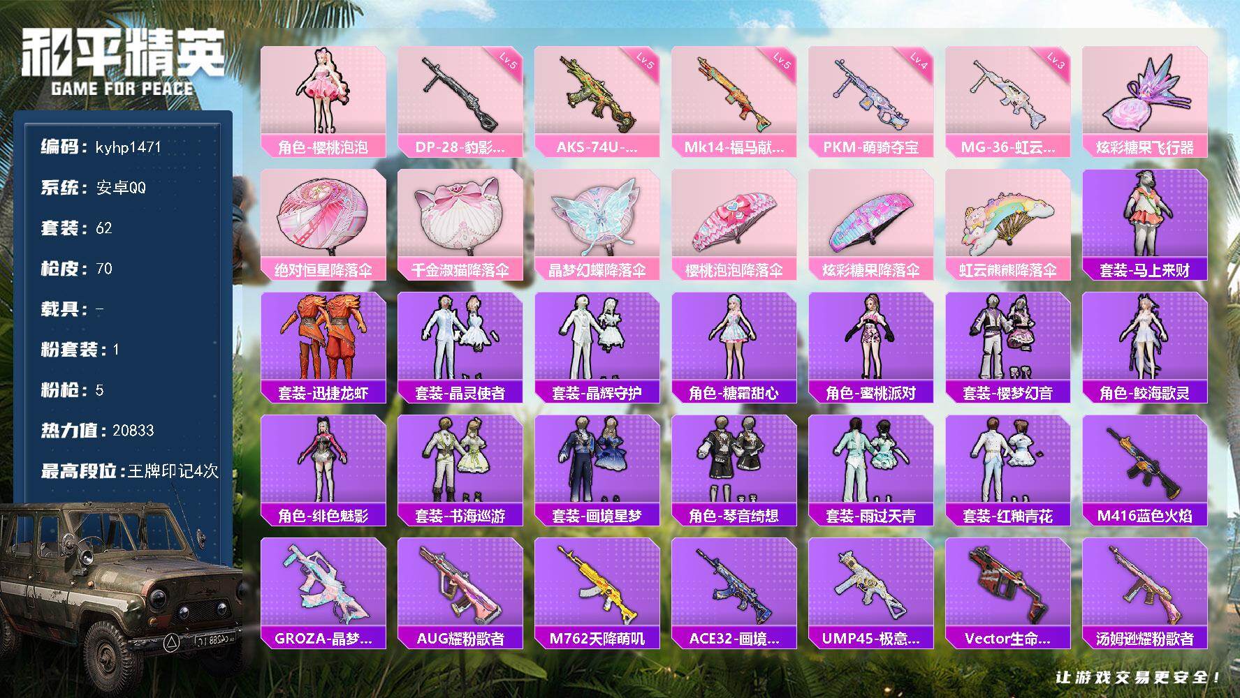 【账号佳】 【可二次实名】安卓 手Q1粉装-5特效枪-0载具-1粉色飞行器-20833热力值-4王牌印记-62套装-70枪皮 【粉色套装】:角色-樱桃泡泡 【粉色枪皮等级】:AKS-74U-森灵之息(五级),Mk14-福马献瑞(五级),DP-28-豹影疾电(五级),PKM-萌骑夺宝(四级),MG-36-虹云熊熊(三级) 【粉色枪皮】:AKS-74U-森灵之息,Mk14-福马献瑞,DP-28-豹影疾电,PKM-萌骑夺宝,MG-36-虹云熊熊 【粉色飞行器】:炫彩糖果飞行器 【粉色降落伞】:绝对恒星降落伞,千金淑猫降落伞,晶梦幻蝶降落伞,樱桃泡泡降落伞,炫彩糖果降落伞,虹云熊熊降落伞 【稀有套装】:套装-雪国风尚,套装-炫彩糖果,套装-马上来财,套装-迅捷龙虾,套装-晶灵使者,套装-晶辉守护,角色-糖霜甜心,角色-蜜桃派对,套装-樱梦幻音,角色-鲛海歌灵,角色-绯色魅影,套装-书海巡游,套装-画境星梦,套装-琴音绮想,套装-雨过天青,套装-红釉青花 【稀有枪皮】:AUG-冰晶雪宝,M416-蓝色火焰,GROZA-晶梦幻蝶,AUG-耀粉歌者,M762-天降萌叽,ACE32-画境星梦,UMP45-极意拳锋,Vector-生命誓言,汤姆逊-耀粉歌者,汤姆逊-樱桃泡泡,MP5K-画境星梦,M24-樱桃泡泡,SKS-糯团青竹,Win94-晶梦幻蝶,AMR-喜羊羊与灰太狼,MK20-H-樱桃泡泡,M1加兰德-画境星梦,S686-生命誓言,S686-千金淑猫,S12K-极意拳锋,AA12-G-画境星梦,M249-彩虹符号,蝎式手枪-千金淑猫,爆炸猎弓-喜羊羊与灰太狼,突击盾牌-绝对恒星,平底锅-画境星梦 【其他套装】:套装-夏日倾情,套装-完美偶像,套装-旭日情侣,套装-柠萌假日,套装-橘黑制服,套装-潮流炫酷,套装-特训学院,套装-王牌教练,套装-甜心信使,套装-白色伏地魔,套装-破蛋小黄鸡,套装-竞技名士,套装-红色运动,套装-绮丽涂鸦,套装-蓝彩潮人,套装-街头潮人,套装-酷潮明星,套装-魅力单车,套装-黄色运动,套装-香榭午后,套装-神气柴柴,套装-热情海星,角色-粉雾星云 【营地ID】:1013503411