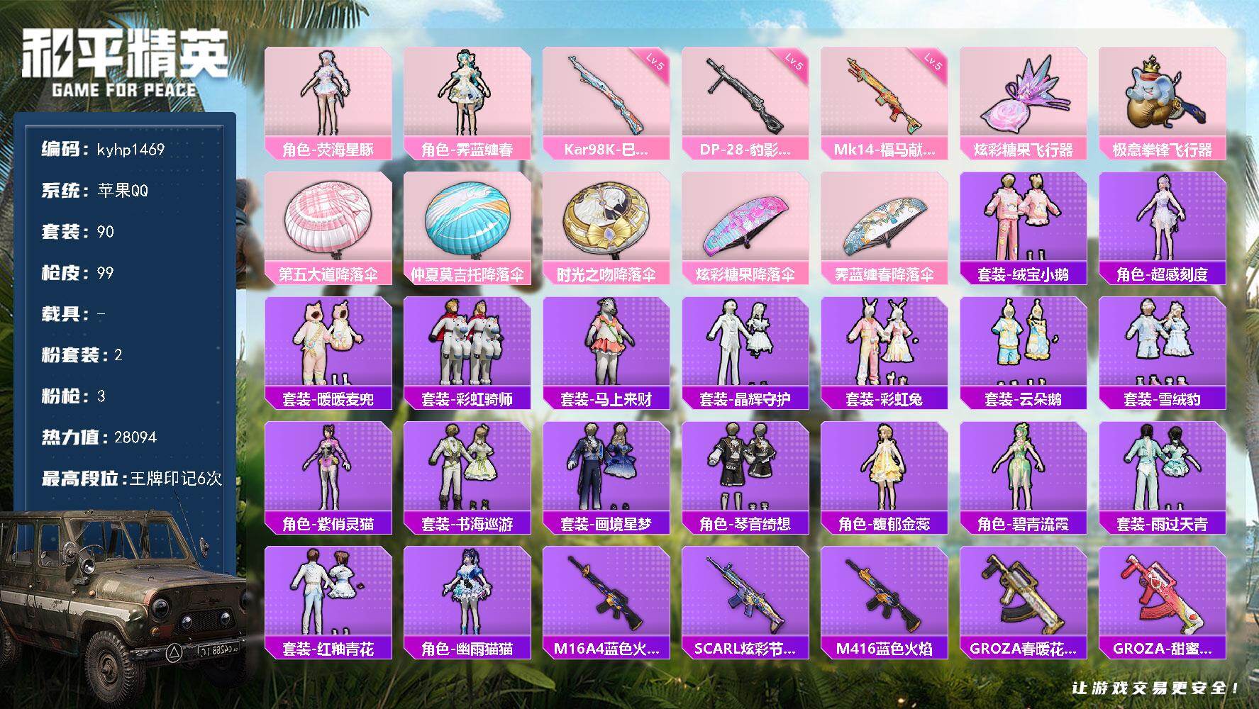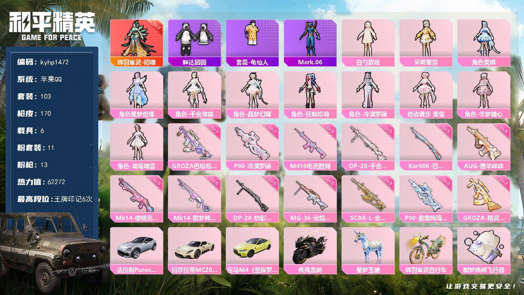 【账号佳】 苹果 手Q 6粉装 9特效枪 3载具 1粉色飞行器 39747热力值 3王牌印记 70套装 118枪皮【粉色套装】:彗云及圣,新星烈龙,心之恋语,极致幻想,星空之魅,圣堂之誓【粉色枪皮等级】:AKM-绿萝繁花(五级),SCAR-L-锦绣绵绵(五级),M416-心之恋语(四级),M416-电玩时刻(五级),ACE32-萌骑漫游(四级),UMP45-量子极限(五级),Kar98K-巳巳如意(五级),Mk14-精灵梦叶罗丽(五级),Mk14-福马献瑞(一级)【粉色载具】:阿斯顿马丁DBS(红),阿斯顿马丁DBX(橙),合金龙骨(蓝)【粉色飞行器】:心之恋语飞行翼【粉色降落伞】:圣堂之誓降落伞,心之恋语降落伞,守护天翼降落伞【稀有套装】:巳巳如意,雪国风尚,萝兰蝴蝶,火种守卫者,燕燕于飞,鱼渊荷华,蓝冰羽【稀有枪皮】:AKM-破晓战魂,AKM-龙的传人,AUG-耀粉歌者,AUG-闲梦青缨,AC-VAL-快闪甜心,AWM-焰鹰斗篷,AWM-圣堂之誓,爆炸猎弓-惊鸿侠骨,DBS-焰鹰斗篷,DBS-圣堂之誓,DP-28-焰鹰斗篷,DP-28-彩虹符号,GROZA-治愈之星,Kar98K-洛神天依,Kar98K-红色方程式,M16A4-幻世战舞者,M416-红色方程式,M416-蓝色火焰,M762-镭射皇者,Mini14-涂山之恋,Mini14-穿刺龙虾,Mini14-耀粉歌者,M417-惊鸿侠骨,MK20-H-快闪甜心,M200-惊鸿侠骨,M249-彩虹符号,M249-破晓战魂,M249-糯团青竹,MG3-幻世战舞者,MG3-惊鸿侠骨【稀有头盔】:心之恋语头盔(3级),心之恋语头盔(2级),心之恋语头盔(1级),花间之火头盔(3级),花间之火头盔(2级)【稀有背包】:深海小丑鱼背包(3级),心之恋语背包(3级),心之恋语背包(2级),心之恋语背包(1级),花间之火背包(3级),花间之火背包(2级),花间之火背包(1级)【截图或标题展示段位不代表实际段位,赛季更新等不可抗拒因素发生变化、时限道具不保证所剩时间、标题未写送点卷默认不送】