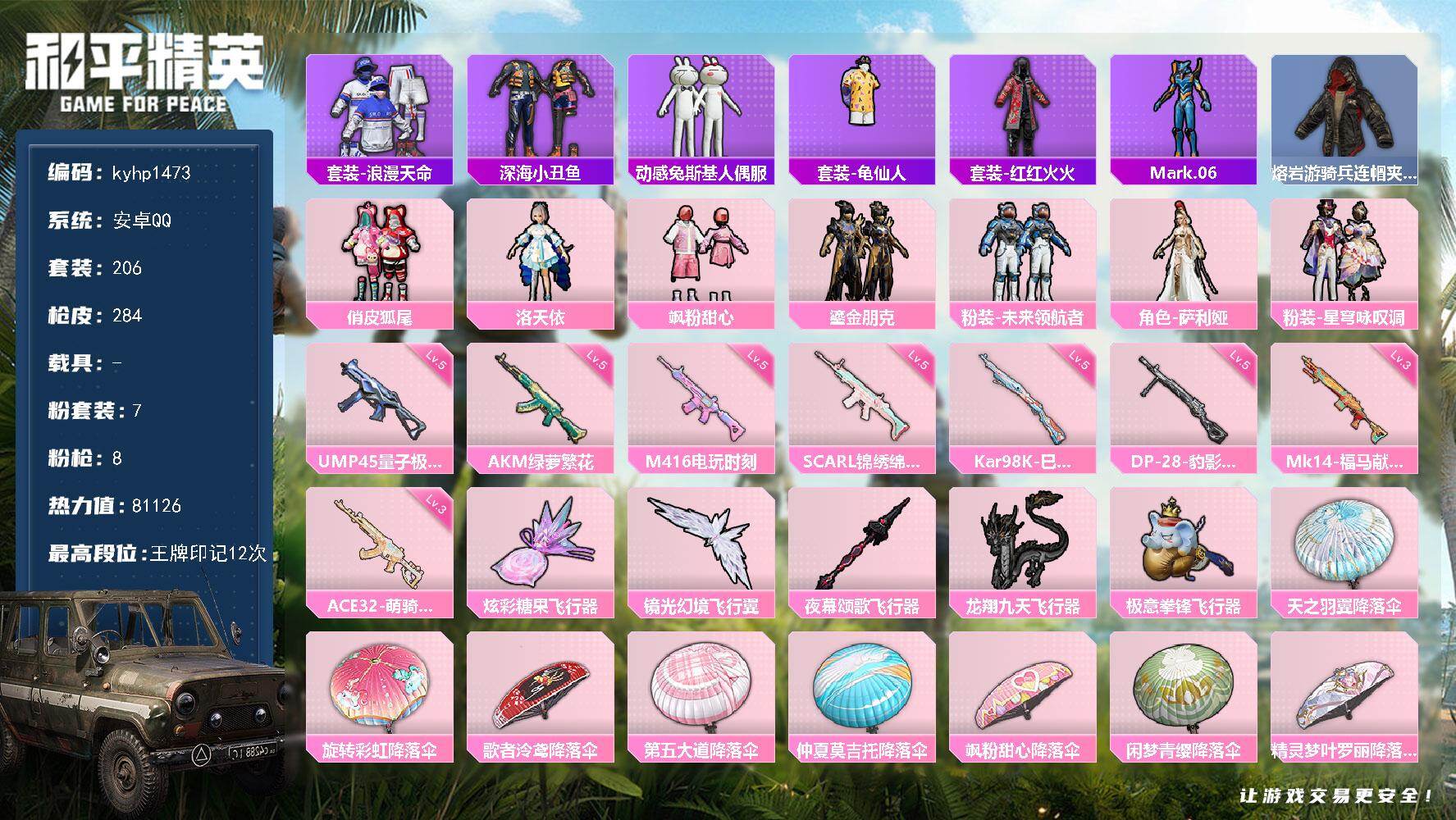 【账号佳】 【可二次实名】安卓 手Q16粉装-13特效枪-4载具-5粉色飞行器-78999热力值-8王牌印记-157套装-210枪皮 【热门品类】:粉装-童趣迷兔,套装-小丑鱼,套装-胖达圆圆,套装-星河浪客,套装-动感兔斯基人偶服,套装-粉红小猪 【粉色套装】:粉装-宝贝奶油派,粉装-天使彩虹糖,粉装-天禅智恒,粉装-冰霜白皇,粉装-童趣迷兔,粉装-绿野柔风,粉装-彩虹鹿灵,粉装-山涧鹿灵,角色-洛天依,粉装-俏雪含霜,粉装-吟月归客,粉装-海渊国主,粉装-天之羽翼,粉装-碧影闪光,粉装-海盐物语,女娲后裔-赵灵儿 【粉色枪皮等级】:AKM-炫紫旋律(一级),AKM-梦之光华(五级),SCAR-L-梦幻火箭(五级),M416-五爪金龙(六级),M416-风花雪月(一级),M762-激战未来(五级),Kar98K-巳巳如意(五级),SKS-碧影闪光(三级),Mk14-甜梦熊击(五级),Mk14-福马献瑞(一级),S12K-海渊国主(五级),M249-蓝莓炮弹(四级),DP-28-豹影疾电(五级) 【粉色载具】:兰博基尼Estoque(银翼灰),合金龙骨(蓝),海龙奔腾,鬼马风驰,空客H135-蔚蓝之翼 【粉色枪皮】:AKM-炫紫旋律,AKM-梦之光华,SCAR-L-梦幻火箭,M416-五爪金龙,M416-风花雪月,M762-激战未来,Kar98K-巳巳如意,SKS-碧影闪光,Mk14-甜梦熊击,Mk14-福马献瑞,S12K-海渊国主,M249-蓝莓炮弹,DP-28-豹影疾电 【粉色飞行器】:梦幻火箭飞行器,梦之光华飞行器,天之羽翼飞行器,闪光银龙飞行器,千面幻镜飞行器 【粉色降落伞】:甜心宝贝降落伞,荧光虫舞降落伞,阿狸红降落伞,童趣迷兔降落伞,香水柠檬降落伞,王牌四分卫降落伞,怪笑疯兔降落伞,齐天大圣降落伞,洛神天依降落伞,海渊国主降落伞,蓝莓炮弹降落伞,天之羽翼降落伞,筑梦精灵降落伞,彩虹甜喵降落伞,千面幻镜降落伞,暗夜鎏金降落伞,星穹咏叹调降落伞 【稀有套装】:套装-雏菊兔兔,套装-萝兰蝴蝶,套装-小熊娃娃,套装-紫幽梦,套装-蓝冰羽,套装-星影赞美诗,角色-碧青流霞 【稀有枪皮】:AKM-夜灯,AKM-星之信仰,AKM-海渊国主,AKM-破晓战魂,AKM-缤纷海域,AKM-萌趣颜团子,AKM-虎虎生威,AKM-阿狸红,M16A4-幻世战舞者,M16A4-甜心亚梦,M16A4-红色方程式,SCAR-L-夜灯,SCAR-L-炫彩节奏,SCAR-L-玉兔迎春,SCAR-L-甜蜜誓约,SCAR-L-龙宫之主,M416-糯团青竹,GROZA-异彩先驱,GROZA-彩虹符号,GROZA-影袭,GROZA-林间仙鹿,GROZA-治愈之星,GROZA-田园牧歌,GROZA-蓝莓炮弹,AUG-耀粉歌者,AUG-青春冒险家,QBZ-彩虹符号,QBZ-洛神天依,QBZ-飞驰魅影,M762-天降萌叽,M762-瑞龙福将,M762-镭射皇者,Mk47-天之羽翼,Mk47-洛神天依,Mk47-青春冒险家,G36C-时空追击者,G36C-绮梦青鸾,G36C-青丘仙客,G36C-星穹咏叹调,AC-VAL-天降萌叽,AC-VAL-甜心亚梦,蜜獾-天降萌叽,蜜獾-娇憨猪猪,蜜獾-绯穹魔姬,UZI-娇憨猪猪,UZI-炫彩节奏,UMP45-夜灯,UMP45-怪兽之王,UMP45-时空追击者,UMP45-海渊国主,Vector-彩虹符号,Vector-暗夜玫瑰,Vector-治愈之星,Vector-生命誓言,Vector-田园牧歌,Vector-香水柠檬,汤姆逊-异彩先驱,汤姆逊-像素花束,野牛-夜灯,野牛-王牌四分卫,野牛-青春冒险家,MP5K-异彩先驱,MP5K-甜蜜誓约,MP5K-蓝莓炮弹,P90-飞驰魅影,Kar98K-彩虹符号,Kar98K-梦幻火箭,Kar98K-洛神天依,Kar98K-炫彩节奏,Kar98K-蓝莓炮弹,Kar98K-飞驰魅影,M24-影袭,M24-治愈之星,M24-炫彩节奏,AWM-激战未来,AWM-王牌四分卫,SKS-天之羽翼,SKS-时空追击者,SKS-炫彩节奏,SKS-迅猛狂鲨,SKS-金玉无双,VSS-田园牧歌,VSS-碧影闪光,VSS-镭射皇者,Mini14-千面幻镜,Mini14-异彩先驱,Mini14-林间仙鹿,Mini14-梦幻火箭,Mini14-海渊国主,Mini14-穿刺龙虾,Mini14-龙宫之主,Mk14-治愈之星,Win94-怪笑疯兔,Win94-瑞龙福将,SLR-娇憨猪猪,SLR-彩虹符号,QBU-青春冒险家,M200-仲夏莫吉托,S686-彩虹符号,S686-橘柚倾心,S686-生命誓言,S1897-炫彩节奏,S1897-镭射皇者,S1897-飞驰魅影,S12K-玩趣呆呆,S12K-瑞龙福将,S12K-童趣迷兔,S12K-龙宫之主,S12K-夜灯,S12K-娇憨猪猪,S12K-幻世战舞者,DBS-时空追击者,DBS-甜心亚梦,SPAS-12-田园牧歌,M249-星之彼岸,M249-镭射皇者,DP-28-彩虹符号,DP-28-橘柚倾心,DP-28-甜心亚梦,DP-28-甜心宝贝,MG3-幻世战舞者,MG3-瑞龙福将,MG3-青春物语,沙漠之鹰-王牌投手,破片手榴弹-巳巳如意 【其他套装】:套装-NV战队服,套装-SS12特训,套装-SS13特训,套装-SS14特训,套装-SS15特训,套装-SS16特训,套装-SS17特训,套装-SS18特训,套装-SS19特训,套装-SS20特训,套装-SS21特训,套装-SS22特训,套装-SS23特训,套装-SS24特训,套装-SS29特训,套装-光之冒险,套装-冷焰舞者,套装-吉莉礼服,套装-夏日音浪,套装-幻世战舞者,套装-探宝勇士,套装-柠萌假日,套装-格斗先锋,套装-滨海假日,套装-滨海厨神,套装-潮流炫酷,套装-灰色格斗者,套装-炫蓝之夏,套装-热血青春,套装-牛气冲天,套装-牛气满满,套装-特战装甲,套装-特种颜团子,套装-玉兔迎春,套装-王牌教练,套装-甜蜜告白,套装-疯狂小兔子,套装-白熊同盟,套装-白色伏地魔,套装-破晓战魂,套装-破蛋小黄鸡,套装-神秘领域,套装-福星高照,套装-空投萌叽,套装-竞技名士,套装-粉红小猪,套装-缤纷果语,套装-萌趣颜团子,套装-萌黄之夏,套装-蓝色守护者,套装-蓝色运动,套装-虎虎生威吉莉,套装-超能勇士,套装-都市魅力,套装-长空猛禽,套装-阳光火鸡,套装-青玉碎影,套装-麻辣教官,套装-黄色运动,套装-黑色伏地魔,套装-鹰眼刺客,套装-漫步者,套装-呆萌铁蟹,套装-神秘黑猫,套装-激萌罗小黑,套装-暗夜契约,套装-纯白誓言,套装-镭射皇者,套装-银白舞王,套装-浪漫樱花,套装-治愈之星,套装-科技之