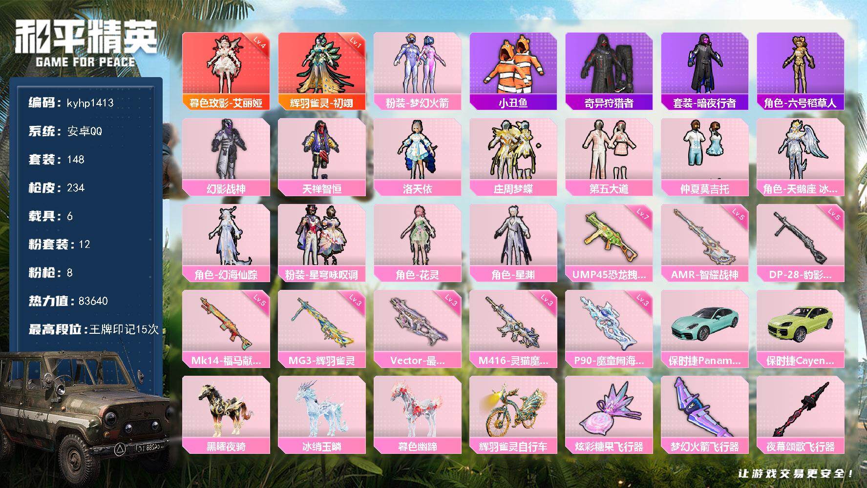 【账号佳】 【可二次实名】安卓 手Q5粉装-5特效枪-1载具-1粉色飞行器-41768热力值-7王牌印记-110套装-152枪皮 【热门品类】:粉装-梦幻火箭,套装-忍者信条 【粉色套装】:粉装-梦幻火箭,粉装-星穹咏叹调,粉装-幻彩电音,角色-异瞳寒姬,角色-虹云熊熊 【粉色枪皮等级】:GROZA-镜光银凌(五级),UMP45-萌骑冒险(三级),Kar98K-巳巳如意(五级),Mk14-福马献瑞(五级),DP-28-豹影疾电(五级) 【粉色载具】:双人摩托-梦幻火箭 【粉色枪皮】:GROZA-镜光银凌,UMP45-萌骑冒险,Kar98K-巳巳如意,Mk14-福马献瑞,DP-28-豹影疾电 【粉色飞行器】:炫彩糖果飞行器 【粉色降落伞】:梦幻火箭降落伞,鬼刀降落伞,樱桃泡泡降落伞,喜羊羊与灰太狼降落伞,异瞳寒姬降落伞,极意拳锋降落伞,炫彩糖果降落伞 【稀有套装】:套装-雪国风尚,套装-炫彩糖果,角色-罗莉,套装-马上来财,套装-燕燕于飞,套装-鱼渊荷华,角色-糖霜甜心,角色-蜜桃派对,套装-粉恋花,套装-紫幽梦,套装-蓝冰羽,角色-瑰梦爱神,套装-极速光影,套装-彩虹兔,套装-云朵鹅,套装-雪绒豹,角色-绛羽幽主,角色-夜瞳黯灵,套装-朱霞炽焰,套装-凌霄紫焰,套装-擎苍青焰,玩偶服-懒羊羊,角色-绯色魅影,角色-紫俏灵猫,套装-书海巡游,套装-画境星梦,套装-琴音绮想,套装-雨过天青,套装-红釉青花,角色-皓月伶影 【稀有枪皮】:AUG-冰晶雪宝,AKM-影袭,AKM-龙的传人,SCAR-L-夜灯,SCAR-L-玉兔迎春,M416-红色方程式,GROZA-影袭,AUG-天降萌叽,AUG-甜蜜菠萝,AUG-绝对恒星,QBZ-彩虹符号,M762-彩虹符号,M762-云朵鹅,M762-登顶巅峰,AC-VAL-天降萌叽,蜜獾-虎痴许褚,Famas-桃粉嫣然,ACE32-画境星梦,ARX-凌霄紫焰,UZI-啾咪啾咪,UZI-影袭,UZI-月影灵韵,UMP45-夜灯,UMP45-生命誓言,UMP45-蓝色火焰,Vector-生命誓言,汤姆逊-耀粉歌者,汤姆逊-像素花束,MP5K-画境星梦,AKS-74U-鬼刀,JS9-凌霄紫焰,P90-巳巳如意,Kar98K-梦幻火箭,M24-影袭,M24-樱桃泡泡,Mini14-春暖花开,Mini14-绯穹魔姬,Mk14-治愈之星,AMR-喜羊羊与灰太狼,MK20-H-樱桃泡泡,SVD-云朵鹅,M1加兰德-画境星梦,S686-巳巳如意,S1897-春暖花开,S12K-夜灯,S12K-幻影战神,DBS-幻彩电音,AA12-G-画境星梦,SPAS-12-云朵鹅,DP-28-彩虹符号,MG3-幻世战舞者,MG3-第五大道,MG-36-凌霄紫焰,P92-凌霄紫焰,R1895-棋盘冕主,R45-幻彩电音,短管霰弹-星穹咏叹调,沙漠之鹰-云朵鹅,爆炸猎弓-喜羊羊与灰太狼,突击盾牌-绝对恒星,大砍刀-云朵鹅,撬棍-冷漠罗丽,平底锅-凌霄紫焰,平底锅-画境星梦 【其他套装】:套装-SS19特训,套装-人气偶像,套装-冷焰舞者,套装-完美偶像,套装-幻世战舞者,套装-旭日情侣,套装-春日漫步,套装-暗金炫舞,套装-橘黑制服,套装-浪漫假日,套装-海岛探路者,套装-深蓝色名流,套装-湖蓝色名流,套装-炫蓝之夏,套装-猎鹰,套装-猛禽,套装-王牌教练,套装-白熊同盟,套装-白色伏地魔,套装-破蛋小黄鸡,套装-竞技名士,套装-竞技达人朋克,套装-红色运动,套装-绮丽涂鸦,套装-绯格组合,套装-缤纷果语,套装-耀眼新星,套装-蓝色运动,套装-街头潮人,套装-都市魅力,套装-长空猛禽,套装-阳光火鸡,套装-青年教官,套装-青涩时光,套装-魅力单车,套装-黄色伏地魔,套装-黄色名流,套装-黄色运动,套装-黑色伏地魔,套装-龙的传人,套装-鹰眼刺客,套装-冰冻风暴,套装-漫步者,套装-迅捷狂鲨,套装-冰川特警,套装-电音精灵 【稀有头盔】:梦幻火箭头盔(3级),梦幻火箭头盔(2级),幻影战神头盔(3级),金羽特工头盔(1级) 【稀有背包】:梦幻火箭背包(3级),梦幻火箭背包(1级),幻影战神背包(1级) 【营地ID】:985769094