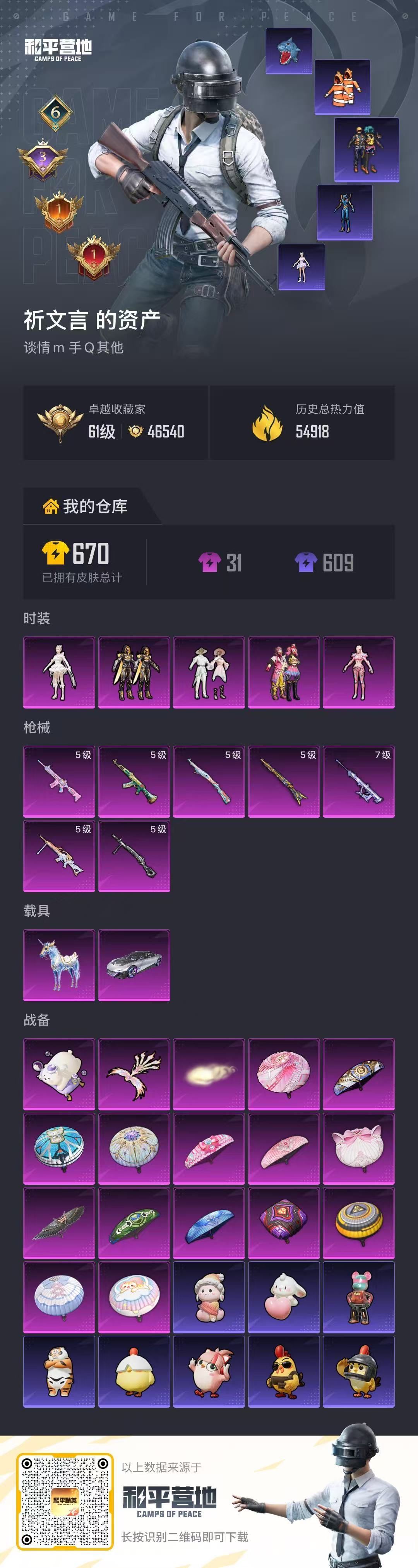 【账号佳】 【可二次实名】蓝螳螂+小丑鱼+5粉+7枪+2车 【区服】安卓QQ 【封号情况】无封号 【沉迷情况】有防沉迷 【段位】不朽星钻Ⅳ 【热力值】54918 【收藏家】卓越收藏家:61级 【历史最高段位】卓越王牌13星 【王牌印记】6 【卓越印记】3 【传奇印记】1 【绝世印记】1 【游戏等级】61 【当前赛季KD值】第三人称-四排 0,第三人称-双排 0,第三人称-单排 0,第一人称-四排 0,第一人称-双排 0,第一人称-单排 0, 【稀有资产数量】17 【套装数量】120 【枪械数量】177 【粉枪械数量】7 【粉套装数量】5 【载具数量】2 【飞行器数量】3 【稀有资产】角色-千金淑猫/套装-缤纷油彩/M416-电玩时刻[5级]/角色-Mark.06/套装-深海小丑鱼/套装-小丑鱼/套装-浪漫天命/套装-龟仙人/套装-迅捷狂鲨/套装-绒宝小鹅/套装-秘语星愿/套装-夏日倾情/角色-粉雾星云/角色-都市丽猫/角色-摩登魅猫/角色-银尘/角色-冰公主 【粉色套装】角色-守护天翼/套装-创世·救赎/套装-牡丹亭·游园 【粉色枪皮】AMR-鸢尾晶梦[7级]/AKM-绿萝繁花[5级]/Kar98K-巳巳如意[5级]/Kar98K-创世·救赎[5级]/DP-28-豹影疾电[5级]/MG-36-沧焰双生[5级] 【载具】星梦玉骢/星河领航(磐石银) 【飞行器】齐天大圣飞行器/凤舞九天飞行器/酣梦熊熊飞行器 【珍稀背包】炫彩节奏背包(3级)/绝对恒星背包(2级)/炫彩节奏背包(2级)/沙丘之主背包(1级)/绝对恒星背包(1级) 【珍稀头盔】绝对恒星头盔(3级)/墨龙九天头盔(2级)/绝对恒星头盔(2级)/绝对恒星头盔(1级) 【动作】肯定/拒绝三连/缤纷气象/要抱抱/鼓掌/甜美闪耀/迎接太阳/元气律动/比心五连拍/我错了/欢欣鼓舞/轻俏诗歌/鞠躬/无限欢脱/爱心小熊/舞动英歌/一起扭扭/摸摸脸/气场全开/包行的/魅力四射舞/拜托了/摸摸头/光剑格斗/青春节拍/甜蜜时刻/俄舞/生气跺脚/你好/派对之星/酷帅节拍/击掌/走/活力扭扭/不行/吃鸡式搜房/爱心发射/听我口令/热潮律动/锤你哦/午后漫步/优美支点/不听不听