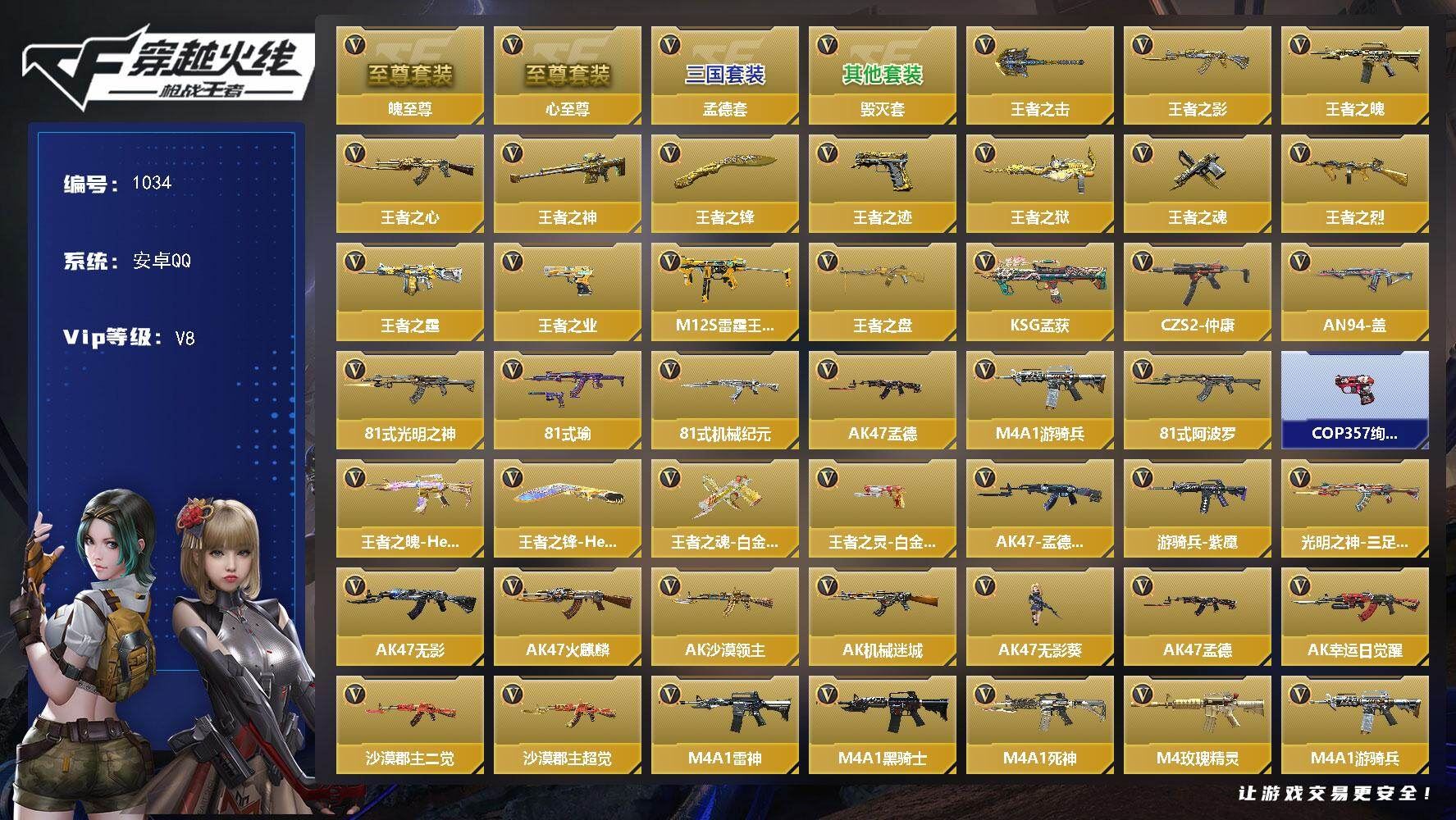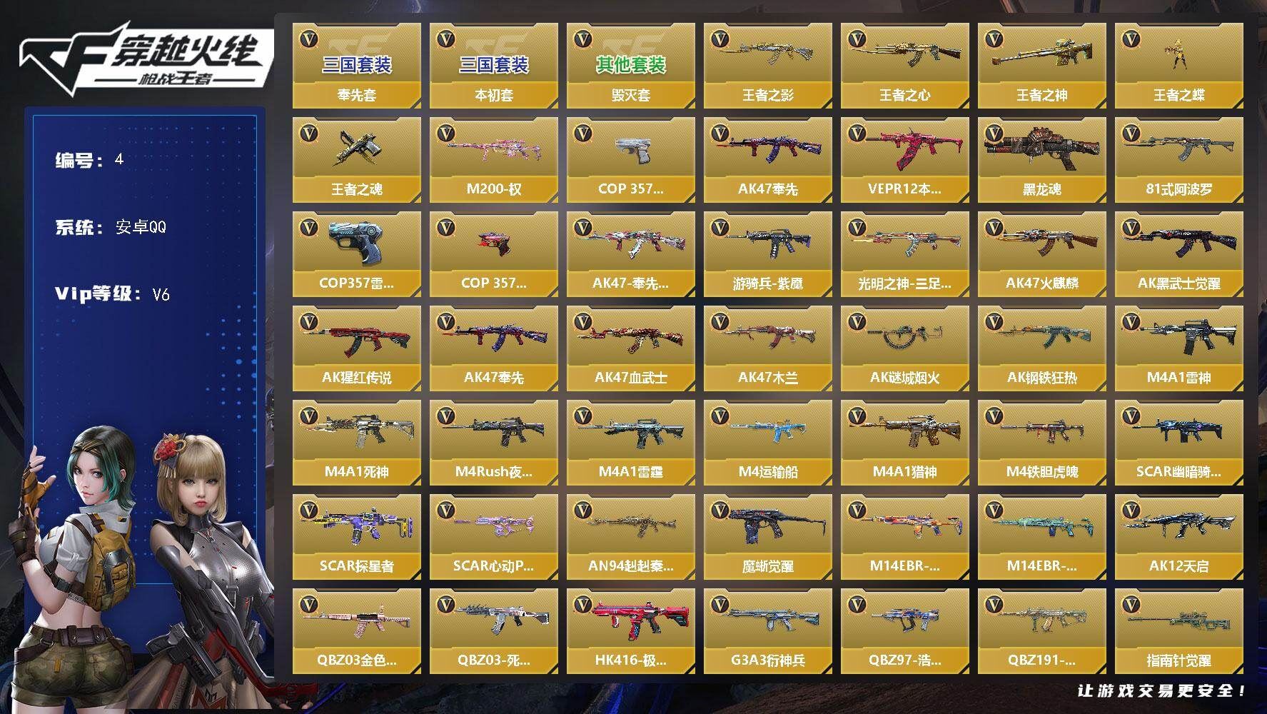 【账号佳】 可二次安卓QQ 枪皇-3英雄角色数-169英雄武器数【8王者】【王者系列】:王者之影,王者之心,王者之神,王者之蝶,王者之魂【三国/其他套装】:本初套,奉先套,毁灭套【万化皮肤】:AK47-奉先-无双,81式-光明之神-三足金乌,M4A1-游骑兵-紫魇【热门武器】:M200-权,COP 357-安琪拉,AK47-奉先,VEPR12-本初,黑龙魂,81式-阿波罗,COP 357-雷霆*2,COP 357-堕天神*2【角色】:幽灵刀锋-觉醒,零-新生,虹儿【英雄武器】:AK47-火麒麟,AK47-黑武士觉醒,AK47-猩红传说,AK47-奉先,AK47-血武士,AK47-木兰,AK47-谜城烟火,AK47-钢铁狂热,M4A1-雷神,M4A1-死神,M4A1-Rush-夜袭,M4A1-雷霆,M4A1-运输船,M4A1-猎神,M4A1-铁胆虎魄,SCAR-幽暗骑士,SCAR-探星者,SCAR-心动PICK,AN94-赳赳秦师,9A91-魔蜥觉醒,M14EBR-拂影,M14EBR-葫芦山庄,AK12-天启,QBZ03-金色蔷薇*2,QBZ03-死神,HK416-极光,G3A3-衍神兵,QBZ97-浩瀚征途,QBZ191-封神榜,AWM-指南针觉醒,AWM-指南针,巴雷特-毁灭*3,巴雷特-极光,巴雷特-金色蔷薇,M200-权,98K-黑骑士*2,加特林-蟒蛇,QBB95-再战涿鹿,MK5-极光,CBJ-MS-毒蜂,DDM4-PDW-星际宇航觉醒,VEPR12-本初,打击者-天神,地狱火*2,黑龙魂,各种道具详情看截图、低价出售找回包 赔、截图展示段位不代 表实际段位,如赛季更新等不可抗拒因素发生变化、时限道具不保证所剩时间、标题未写送点劵默认不送【卖号买号首选亿梦】