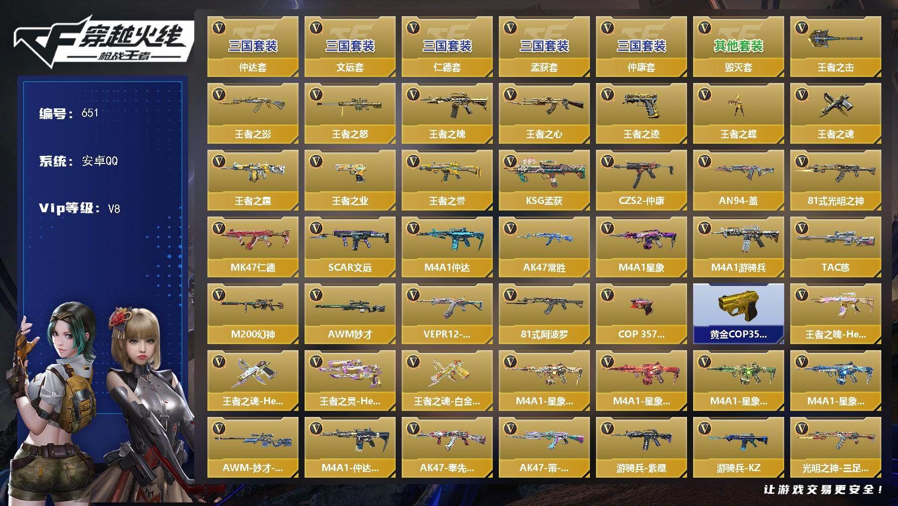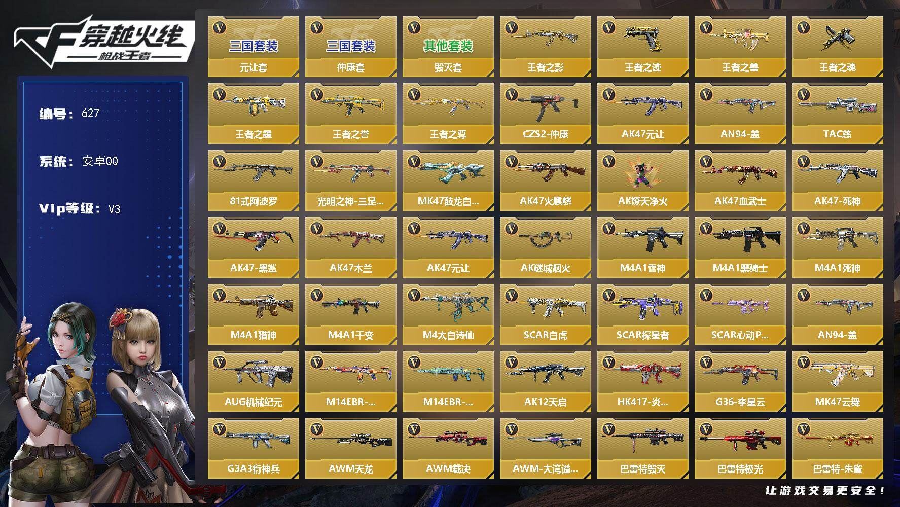 【账号佳】 r51096 可二次 安卓qq【枪圣-10英雄角色数-420英雄武器数】【怒至尊/心至尊/魄至尊】【王者系列】:王者之影,王者之怒*2,王者之魄,王者之心,王者之神,王者之锋,王者之迹,王者之圣,王者之兽,王者之狱,王者之魂,王者幻神,王者之隐,王者之霆,王者之业,QBZ03-王者蔷薇,巴雷特-雷霆王者,M12S-雷霆王者,COP 357-雷霆王者,王者之尊【热门武器】:KSG-孟获,CZS2-仲康,AN94-盖,81式-光明之神,MK47-仁德,SCAR-文远,M4A1-仲达,AK47-奉先,AK47-游骑兵,M4A1-游骑兵*2,TAC-慈,M200-幻神,AWM-游骑兵,81式-阿波罗,COP 357-雷霆,黄金COP 357*2【角色】:审判者,关小雨,乔月,职场灵狐-赛事经理,零-水下丽影,蔡文昭,凌霄,炽天使-X,零-新生,步练师【英雄武器】:AK47-无影,AK47-火麒麟*3,AK47-麒麟,AK47-黑武士,AK47-角斗士*3,AK47-游骑兵,AK47-猩红传说,AK47-沙漠郡主-一觉,AK47-幸运日,AK47-燎天净火,AK47-雷麒麟,AK47-奉先,AK47-血武士*2,AK47-波塞冬,AK47-华夏传说,AK47-黑鲨,AK47-春雅觉醒,AK47-木兰,AK47-轮回,AK47-雷霆,AK47-雅韵青花,AK47-塔罗牌觉醒,AK47-谜城烟火,M4A1-雷神*2,M4A1-黑骑士*2,M4A1-黑龙,M4A1-死神*2,M4A1-游骑兵*2,M4A1-变色龙,M4A1-龙血*2,M4A1-仲达,M4A1-竞界荣光,M4A1-雷霆,M4A1-海骑士*2,M4A1-冰锋觉醒,M4A1-黑龙钰-子涵,M4A1-破空冰刃,M4A1-运输船,M4A1-猎神*2,M4A1-夏清,M4A1-千变,M4A1-太白诗仙,M4A1-铁胆虎魄,QBZ95-天使,SCAR-幽暗骑士*2,SCAR-幽暗骑士觉醒,SCAR-文远,SCAR Light-白虎,SCAR-探星者*2,SCAR-印刷术觉醒,SCAR-心动PICK,剑齿虎-炫彩*2,AN94-四凶觉醒,AN94-赳赳秦师*2,AN94-盖,AUG-机械纪元,FAMAS-湮灭,9A91-天神,9A91-魔蜥觉醒,M14EBR-天神,M14EBR-拂影,M14EBR-玄武,M16-恶魔,AK12-天启*2,QBZ03-金色蔷薇*5,QBZ03-死神*2,QBZ03-玉面羞花,HK416-混世行者,HK416-极光,HK417-炎龙铠甲,81式-光明之神,MK47-机械纪元,MK47-云舞,MK47-仁德,SKS-美杜莎,G3A3-五色琉璃觉醒,G3A3-衍神兵,QBZ97-岚舞,QBZ97-浩瀚征途,QBZ191-金甲虎啸觉醒,QBZ191-封神榜,SBR-湮灭,AWM-天龙,AWM-游骑兵,AWM-裁决,AWM-天使,AWM-指南针觉醒,AWM-大湾溢彩,巴雷特-毁灭*7,巴雷特-极光*6,巴雷特-安琪拉,巴雷特-冬灭觉醒,巴雷特-雷霆王者,巴雷特-朱雀,M200-幻神,M200-心动次元觉醒,09式狙-天神*3,98K-黑骑士,98K-血月*2,98K-星神,98K-蜻蜓,MR1-龙吟惊沧海,TAC-慈,GM6-战争风云觉醒*2,VSK-94-九黎兵主觉醒,VSK-94-金蚀,RPK-美杜莎,加特林-堡垒,加特林-蟒蛇,QBB95-极光*2,QBB95-再战涿鹿,QBB95-螳螂,MK5-极光*2,汤姆逊-烈龙*7,双持斯泰尔-天使*3,斯泰尔-恶魔,QCW05-变形金刚·大黄蜂*2,CZS2-仲康,毁灭征服者-超越Max,KSG-孟获,KSG-钟馗觉醒,贝雷塔-力拔山河,M1887-幽冥玄喵觉醒,M1216-血月,猎弩-虫族女王,左轮-黑武士,左轮-竞界荣光,蟒蛇-火力竞放觉醒,蟒蛇-奉先,左轮-卧龙觉醒,双持GLOCK18-本初,GLOCK18-猎神,改装GLOCK-魔杀族,COP 357-雷霆,COP 357-雷霆王者,QSZ92-天使,双管猎枪-文远,柯尔特-仲达,柯尔特-伏刹山海觉醒,双持柯尔特-极光,CZ75-穷奇,CZ75-策,MK23-机械纪元,MK23-幻神,墨刃-幻神,雌雄双股剑,虎贲钩镰刀,蝴蝶刀-天神*2,女皇利刃-铁胆虎魄*2,炽芒蝶刃*2】各种道具详情看截图、低价出售找回包 赔、截图展示段位不代 表实际段位,如赛季更新等不可抗拒因素发生变化、时限道具不保证所剩时间、标题未写送点劵默认不送【卖号买号首选亿梦】