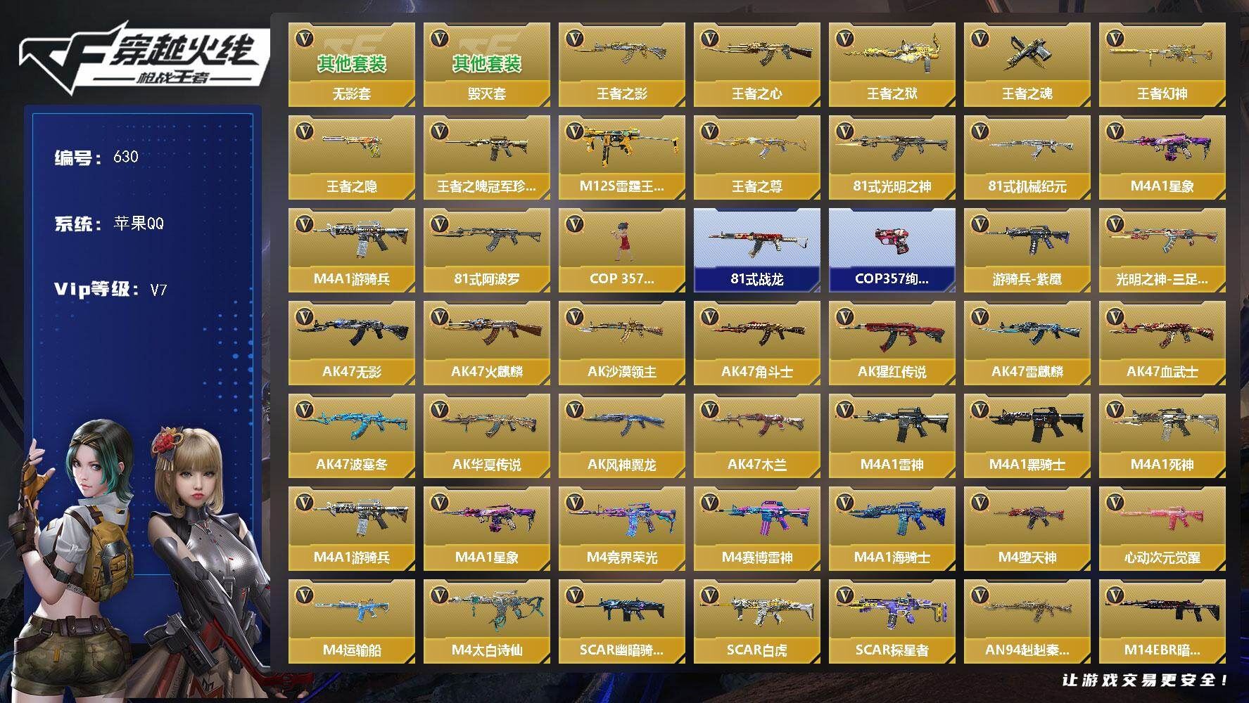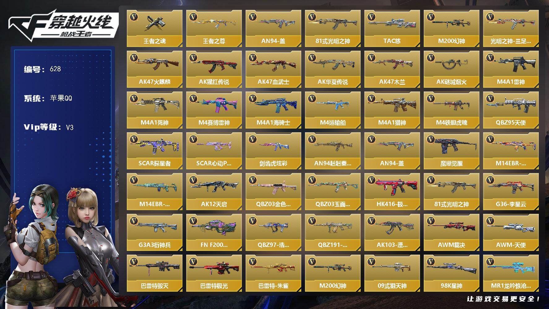 【账号佳】 R50785 可二次苹果QQ 枪皇-169英雄武器数【2王者】【王者系列】:王者之魂,王者之尊【万化皮肤】:81式-光明之神-三足金乌【热门武器】:AN94-盖,81式-光明之神,TAC-慈,M200-幻神【英雄武器】:AK47-火麒麟,AK47-猩红传说,AK47-血武士,AK47-华夏传说,AK47-木兰,AK47-谜城烟火,M4A1-雷神,M4A1-死神*3,M4A1-赛博雷神,M4A1-海骑士,M4A1-运输船*2,M4A1-猎神,M4A1-铁胆虎魄*2,QBZ95-天使,SCAR-探星者,SCAR-心动PICK,剑齿虎-炫彩,AN94-赳赳秦师,AN94-盖,9A91-魔蜥觉醒,M14EBR-拂影,M14EBR-葫芦山庄*2,AK12-天启,QBZ03-金色蔷薇,QBZ03-玉面羞花,HK416-极光,81式-光明之神,G36-李星云,G3A3-衍神兵*2,FN F2000-十绝阵觉醒*2,QBZ97-浩瀚征途,QBZ191-封神榜,AK103-湮灭,AWM-裁决,AWM-天使,巴雷特-毁灭,巴雷特-极光*2,巴雷特-朱雀,M200-幻神,09式狙-天神*2,98K-星神,MR1-龙吟惊沧海,TAC-慈,SR25-燃烧泰坦,加特林-堡垒*2,加特林-蟒蛇,双持斯泰尔-天使,各种道具详情看截图、低价出售找回包 赔、截图展示段位不代 表实际段位,如赛季更新等不可抗拒因素发生变化、时限道具不保证所剩时间、标题未写送点劵默认不送【卖号买号首选亿梦】