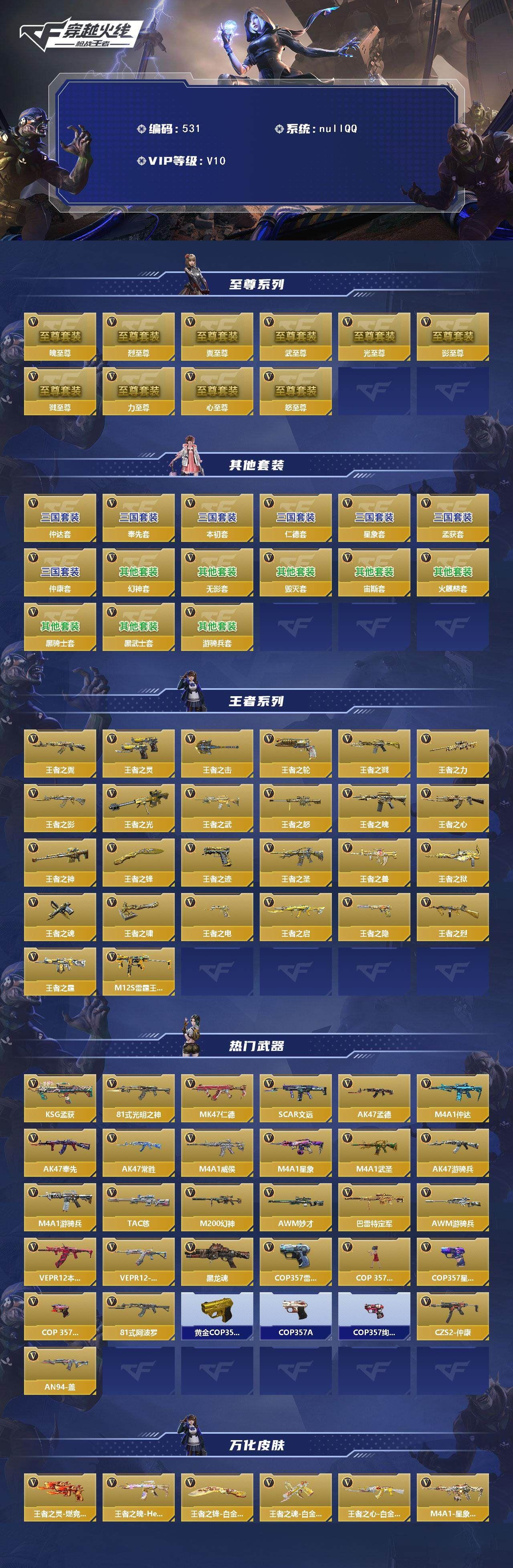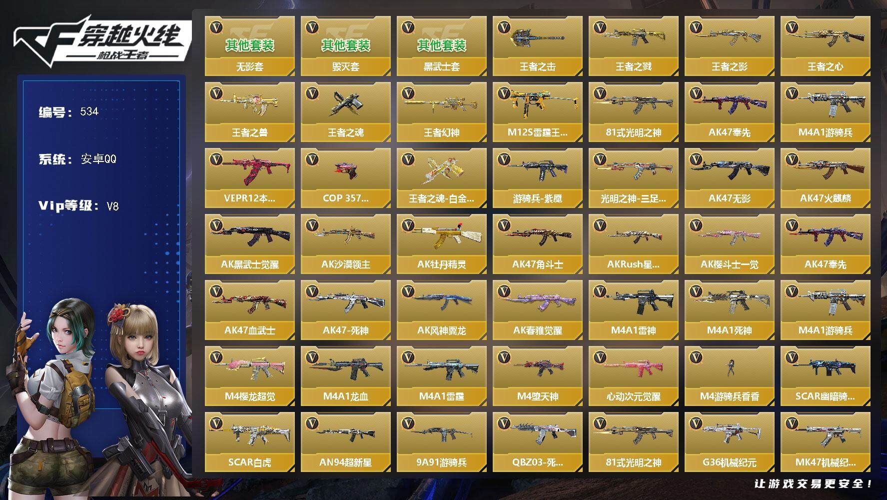 【账号佳】 R48895 可二次安卓QQ 5英雄角色数-434英雄武器数【至尊系列】:力至尊,戮至尊,翼至尊,影至尊,光至尊,心至尊,武至尊,魄至尊,烈至尊,怒至尊【三国/其他套装】:火麒麟套,黑骑士套,黑武士套,游骑兵套,毁灭套,无影套,星象套,幻神套,仲达套,宙斯套,奉先套,仁德套,本初套,孟获套,仲康套【万化皮肤】:M4A1-星象-璀璨星辰·白虎,M4A1-仲达-白露,AWM-妙才-过载,王者之锋-白金血钻,王者之魂-白金血钻,王者之灵-燃竞之巅,王者之魄-HeartShot,王者之心-白金血钻,M4A1-游骑兵-枪娘,M4A1-游骑兵-寒霜,M4A1-游骑兵-KZ,M4A1-星象-璀璨星辰·朱雀,M4A1-星象-璀璨星辰·玄武,M4A1-星象-璀璨星辰·青龙,M4A1-仲达-过载【王者系列】:王者之翼,王者之灵,王者之击,王者之轮,王者之戮,王者之力,王者之影*2,王者之光,王者之武,王者之怒,王者之魄,王者之心,王者之神,王者之锋*2,王者之迹,王者之圣,王者之兽,王者之狱,王者之魂*2,王者之啸,王者之电,王者之启,王者之隐,王者之烈,王者之霆,M12S-雷霆王者【热门武器】:KSG-孟获,81式-光明之神,MK47-仁德,SCAR-文远,AK47-孟德,M4A1-仲达,AK47-奉先,AK47-常胜,M4A1-威侯,M4A1-星象,M4A1-武圣,AK47-游骑兵,M4A1-游骑兵*2,TAC-慈,M200-幻神,AWM-妙才*2,巴雷特-定军,AWM-游骑兵,VEPR12-本初,VEPR12-宙斯,黑龙魂,COP 357-雷霆,COP 357-旗袍,COP 357-星象,COP 357-堕天神,81式-阿波罗,黄金COP 357,COP 357-A,COP 357-绚樱,CZS2-仲康,AN94-盖【角色】:幽灵刀锋-觉醒,子涵,关小雨,雅典娜,祝融夫人【英雄武器】:AK47-无影,AK47-火麒麟,AK47-黑武士觉醒,AK47-沙漠领主*2,AK47-牡丹精灵,AK47-角斗士,AK47-耀金伯爵,AK47-游骑兵,AK47-冰魂觉醒,AK47-火麒麟-灵狐,AK47-Rush-星速,AK47-常胜,AK47-英朗,AK47-樱斗士-超觉,AK47-竞技战魂,AK47-机械迷城,AK47-变色龙,AK47-天使,AK47-孟德,AK47-幸运日觉醒,AK47-猩红传说,AK47-沙漠郡主-二觉,AK47-燎天净火,AK47-雷麒麟*2,AK47-心动次元觉醒,AK47-奉先,AK47-血武士,AK47-华夏传说,AK47-死神,AK47-黑鲨,AK47-春雅觉醒,AK47-木兰,AK47-塔罗牌觉醒,AK47-谜城烟火*2,M4A1-雷神*4,M4A1-黑骑士*2,M4A1-黑龙,M4A1-死神*2,M4A1-玫瑰精灵,M4A1-游骑兵*2,M4A1-枪娘,M4A1-君威GS,M4A1-武圣,M4A1-竞技战魂,M4A1-星象,M4A1-樱龙·超觉,M4A1-Rush-夜袭,M4A1-变色龙,M4A1-威侯,M4A1-龙血,M4A1-仲达,M4A1-雷霆,M4A1-海骑士,M4A1-破空冰刃,M4A1-堕天神,M4A1-心动次元觉醒,M4A1-运输船*3,M4A1-猎神,M4A1-千变,QBZ95-天使,SCAR-幽暗骑士,SCAR-幽暗骑士觉醒,SCAR-文远,SCAR Light-白虎,QBZ03-死神,HK416-极光,81式-光明之神,QBZ19-天使,MK47-仁德,G3A3-衍神兵,QBZ97-浩瀚征途,AWM-天龙,AWM-游骑兵,AWM-妙才*2,AWM-裁决,巴雷特-毁灭*2,巴雷特-极光*2,巴雷特-雷神,巴雷特-枪娘,巴雷特-定军,巴雷特-变色龙,巴雷特-冬灭觉醒,巴雷特-朱雀,M200-幻神,09式狙-天神*4,98K-黑骑士,98K-星神,MR1-龙吟惊沧海,TAC-慈,TAC-晴舞,TAC-雷暴,VSK-94-金蚀,RPK-盘龙,RPK-赤炎盘龙,MG3-雏凤,加特林-堡垒*2,加特林-炼狱,加特林-堡垒觉醒,刘易斯-血月,刘易斯-星际方舟觉醒,MG36-黑骑士,MK5-机械纪元,MK5-极光,汤姆逊-烈龙*3,寒霜烈龙,王者之烈,双持斯泰尔-天使*3,各种道具详情看截图、低价出售找回包 赔、截图展示段位不代 表实际段位,如赛季更新等不可抗拒因素发生变化、时限道具不保证所剩时间、标题未写送点劵默认不送【卖号买号首选亿梦】