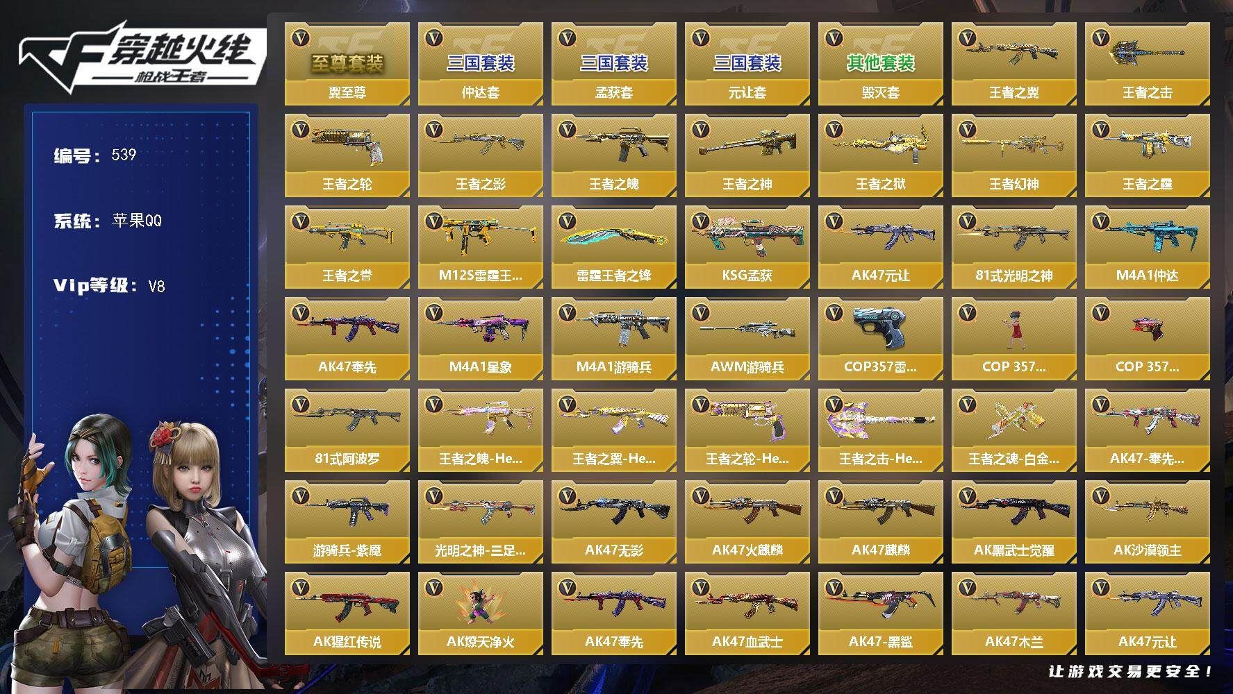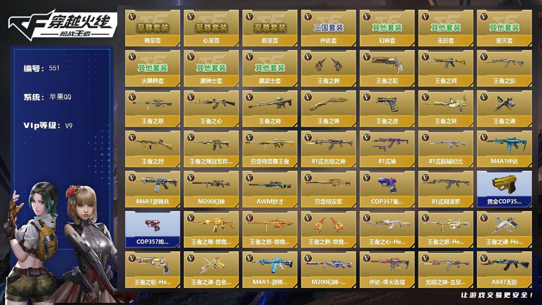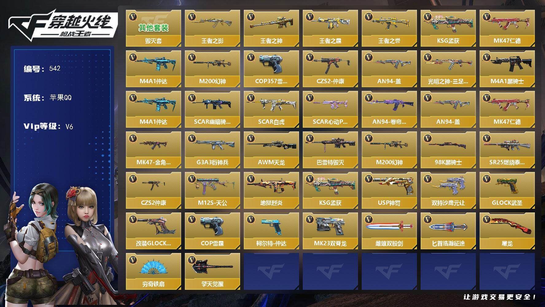 【账号佳】 R48844 可二次苹果QQ 11英雄角色数-331英雄武器数【19王者】【至尊系列】:翼至尊【王者系列】:王者之翼,王者之击,王者之轮,王者之影,王者之魄,王者之神,王者之狱,王者幻神,王者之霆,王者之誉,M12S-雷霆王者,雷霆王者之锋【三国/其他套装【万化皮肤】:AK47-奉先-无双,王者之击-HeartShot,王者之轮-HeartShot,王者之魄-HeartShot,王者之翼-HeartShot,王者之魂-白金血钻,81式-光明之神-三足金乌,M4A1-游骑兵-紫魇【热门武器】:KSG-孟获,AK47-元让,81式-光明之神,M4A1-仲达,AK47-奉先,M4A1-星象,M4A1-游骑兵,AWM-游骑兵,COP 357-雷霆*2,COP 357-旗袍,COP 357-堕天神,81式-阿波罗【角色】:零,关小雨*3,晴雅,岚兮儿,职场灵狐-赛事经理,甄梦,武媚-X,炽天使-X,零-新生【英雄武器】:AK47-无影,AK47-火麒麟*3,AK47-麒麟,AK47-黑武士觉醒,AK47-沙漠领主,AK47-猩红传说,AK47-燎天净火,AK47-奉先,AK47-血武士,AK47-黑鲨,AK47-木兰,AK47-元让,AK47-雅韵青花,AK47-塔罗牌觉醒,AK47-谜城烟火*2,M4A1-雷神,M4A1-黑骑士*2,M4A1-黑龙,M4A1-死神*2,M4A1-玫瑰精灵,M4A1-游骑兵,M4A1-星象,M4A1-龙血,M4A1-仲达,M4A1-机械迷城,M4A1-赛博雷神*2,M4A1-破空冰刃,M4A1-堕天神,M4A1-运输船*3,M4A1-猎神,M4A1-雷暴,M4A1-千变,M4A1-太白诗仙*2,M4A1-铁胆虎魄,M4A1-青龙,SCAR-幽暗骑士,SCAR Light-白虎,SCAR-守护者觉醒,SCAR-印刷术,SCAR-印刷术觉醒,SCAR-心动PICK,AN94-四凶觉醒,AN94-赳赳秦师,AUG-机械纪元,FAMAS-湮灭,M14EBR-拂影*4,M14EBR-葫芦山庄,M16-恶魔,AK12-天启,QBZ03-金色蔷薇,QBZ03-死神,QBZ03-玉面羞花,HK416-混世行者,HK416-极光,HK417-炎龙铠甲,81式-光明之神,QBZ19-天使,G36-机械纪元,MK47-云舞,G3A3-五色琉璃觉醒,G3A3-衍神兵*2,QBZ97-岚舞,QBZ97-浩瀚征途,QBZ191-金甲虎啸觉醒,QBZ191-封神榜,AWM-游骑兵,AWM-裁决,AWM-天使,AWM-指南针,AWM-大湾溢彩,巴雷特-毁灭*3,巴雷特-极光*8,巴雷特-冬灭觉醒,暗杀神,M200-心动次元觉醒,09式狙-天神*2,98K-黑骑士*2,98K-血月,98K-星神,98K-蜻蜓,TAC-晴舞,TAC-雷暴,VSK-94-九黎兵主觉醒,VSK-94-金蚀,RPK-盘龙,加特林-堡垒,加特林-蟒蛇*4,刘易斯-血月,刘易斯-天使,MG36-变形金刚·威震天,QBB95-极光,QBB95-再战涿鹿,MK5-极光,汤姆逊-烈龙,双持斯泰尔-天使,斯泰尔-蝴蝶*2,QCW05-变形金刚·大黄蜂,CBJ-MS-毒蜂*2,CZS2-心动次元觉醒,CZS2-血月,PP19野牛-造纸术觉醒,打击者-天神,地狱火,AA12-火药,亡命之徒-幻兽,KSG-极光,KSG-孟获,KSG-钟馗觉醒,贝雷塔-力拔山河,M1887-幽冥玄喵觉醒,M1216-霸王龙,Origin12-机变奇蛇觉醒,USP-神罚,USP-机械迷城*3,USP-太白诗仙,沙鹰-修罗*3,沙鹰-天神,沙鹰-超新星,沙鹰-神兵修罗*2,沙鹰-宇航兔兔*2,双持沙鹰-元让,蟒蛇-鼓龙,左轮-卧龙觉醒,双持GLOCK18-本初,GLOCK18-猎神,改装GLOCK-魔杀族,COP 357-雷霆*2,COP 357-堕天神,COP 357-旗袍,双管猎枪-威侯,柯尔特-仲达,柯尔特-伏刹山海觉醒,双持柯尔特-极光,CZ75-穷奇,CZ75-策,MK23-机械纪元*3,白骨利刃,海斯博士双刃-激光,雌雄双股剑,双刃-昼伏夜影觉醒,蝴蝶刀-天神,女皇利刃-铁胆虎魄*2,炽芒蝶刃,清刚-觉醒,匕首-浩瀚征途,龙啸,神罚战斧,血阳,龙啸-堕天神,手斧-机械迷城*2,秋逸觉醒,刑天战斧,气勇胆烈戟,屠龙*5,血月,尼泊尔-机械纪元,尼泊尔-竞界荣光,穷奇铁扇,雷霆王者之锋,龙鳞-觉醒,尼泊尔-蜻蜓,太白诗仙扇,麒麟刺,星芒*3,耀金雷刃,马来剑-毁灭*3,唐刀-华夏传说,铁锹-超新星,丛林匕首-火力竞放觉醒,斩神刀-雷暴,迷你饕餮,末日裁决觉醒,破邪蛇棍觉醒,马来剑-耀金伯爵*2【显血戒指】各种道具详情看截图、低价出售找回包 赔、截图展示段位不代 表实际段位,如赛季更新