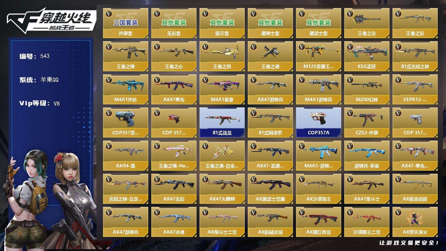 【账号佳】 R49039 可二次苹果QQ 8英雄角色数-156英雄武器数【5王者】【王者系列】:王者之影,王者之心,王者之魂【热门武器】:81式-光明之神,M4A1-仲达,M4A1-星象,M4A1-游骑兵,M200-幻神,CZS2-仲康【角色】:审判者,瞳,关小雨,职场灵狐-赛事经理,夏日灵狐-X,炽天使-X,零-新生,步练师【英雄武器】:AK47-火麒麟,AK47-沙漠领主,M4A1-雷神,M4A1-黑骑士,M4A1-黑龙,M4A1-死神,M4A1-游骑兵,M4A1-星象,M4A1-仲达,M4A1-竞界荣光,M4A1-赛博雷神,M4A1-海骑士,M4A1-猎神,M4A1-太白诗仙,SCAR Light-白虎,SCAR-探星者,SCAR-心动PICK,AN94-赳赳秦师,9A91-天神,M14EBR-葫芦山庄,M16-恶魔,QBZ03-金色蔷薇,QBZ03-死神*2,QBZ03-枪娘,HK416-极光,81式-光明之神,MK47-云舞,G3A3-衍神兵,QBZ191-封神榜,AWM-天龙,AWM-天使,AWM-指南针,巴雷特-毁灭,巴雷特-极光,巴雷特-雷霆,M200-幻神,98K-黑骑士,TAC-雷暴,加特林-堡垒*2,QBB95-极光*2,QBB95-再战涿鹿,汤姆逊-烈龙,CBJ-MS-毒蜂,CZS2-血月,CZS2-仲康,M12S-雷霆,PP19野牛-造纸术觉醒,DDM4-PDW-星际宇航觉醒,打击者-天神,地狱火,地狱烈炎,AA12-火药,贝雷塔-力拔山河,USP-机械迷城,沙鹰-修罗,沙鹰-飞电,沙鹰-火麒麟,沙鹰-幻兽,气手枪-血月*2,沙鹰-神兵修罗,毛瑟-毒蜂,蚩尤战弓觉醒,蟒蛇-鼓龙,左轮-卧龙觉醒,双持GLOCK18-本初,QSZ92-华夏传说,柯尔特-仲达,柯尔特-伏刹山海觉醒,蝴蝶刀-天神,女皇利刃-铁胆虎魄,炽芒蝶刃,清刚-觉醒,龙啸,神罚战斧,手斧-机械迷城,屠龙*8,尼泊尔-机械纪元,麒麟刺,马来剑-毁灭,唐刀-华夏传说,擎天觉醒,破邪蛇棍觉醒,马来剑-耀金伯爵【三国/其他套装】:毁灭套,仲康套【万化皮肤】:81式-光明之神-三足金乌,各种道具详情看截图、低价出售找回包 赔、截图展示段位不代 表实际段位,如赛季更新等不可抗拒因素发生变化、时限道具不保证所剩时间、标题未写送点劵默认不送【卖号买号首选亿梦】