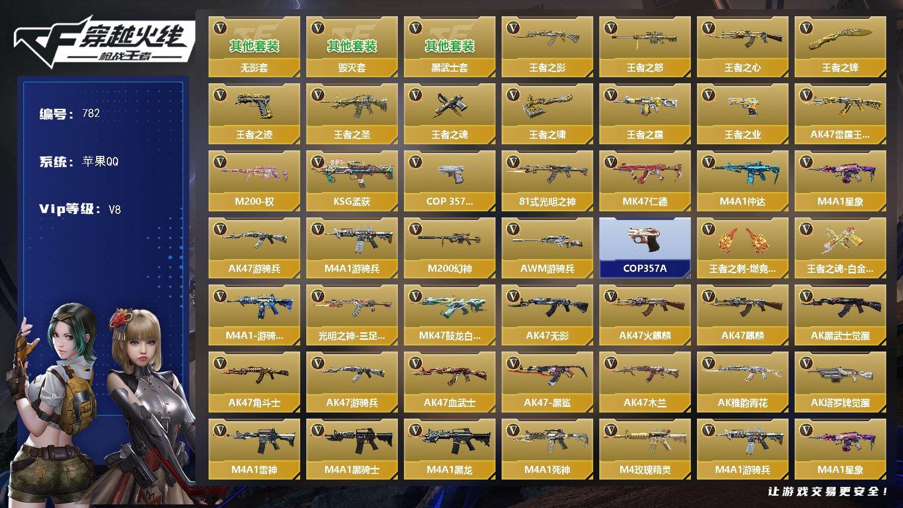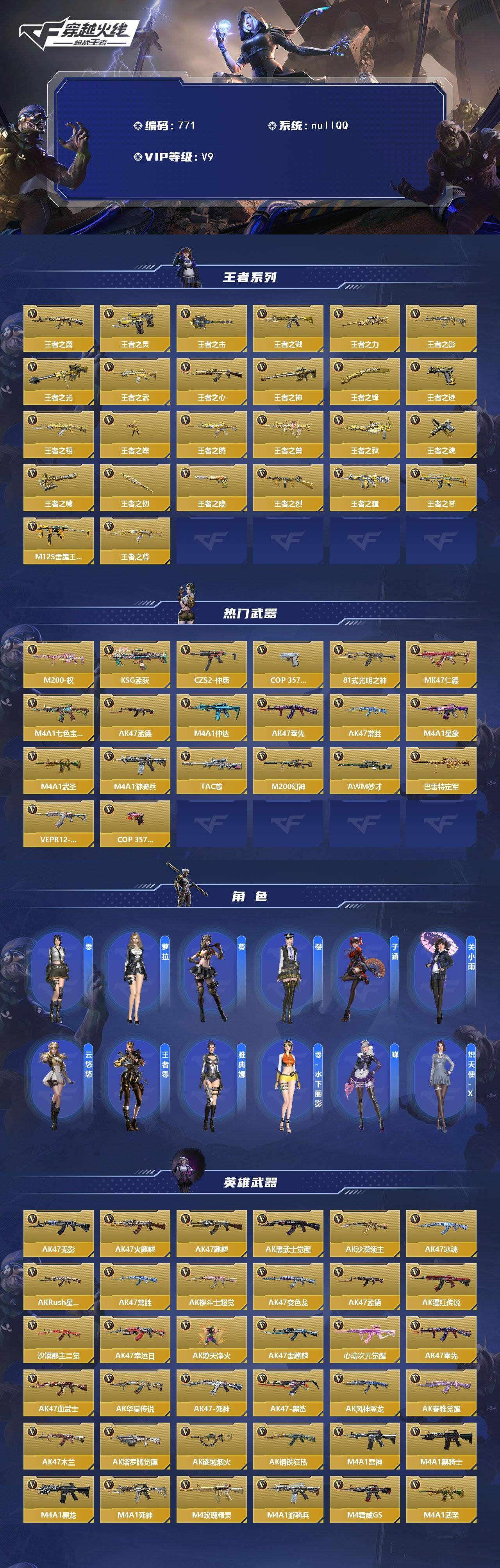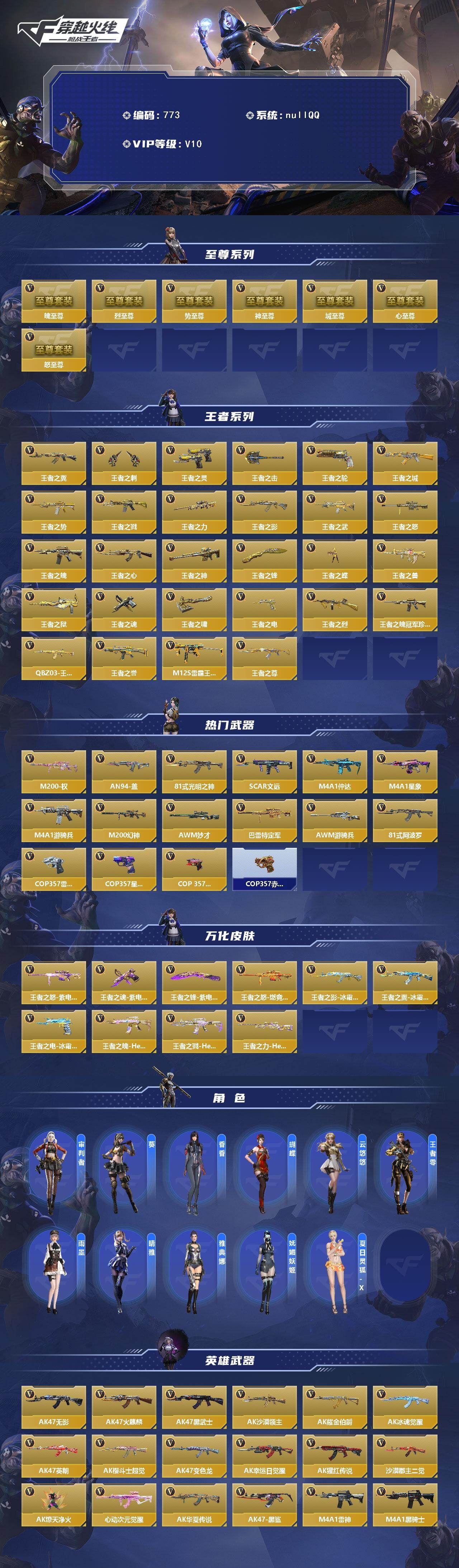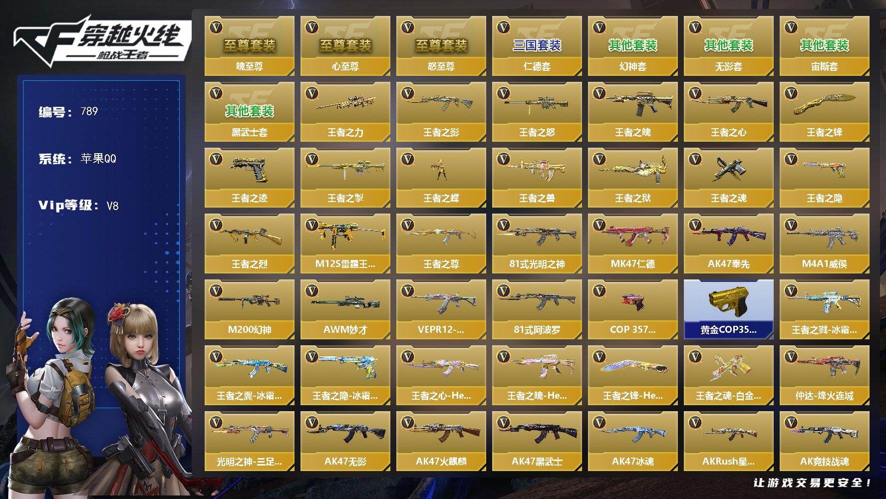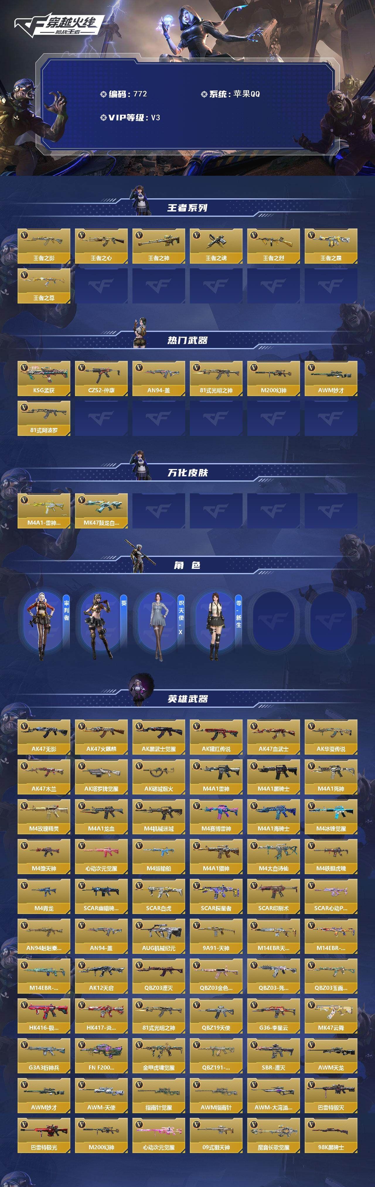 【账号佳】 可二次QQ 【cfm苹果】 枪皇-15英雄角色数-501英雄武器数【王者系列】:王者之翼,王者之灵,王者之击,王者之轮,王者之戮,王者之力,王者之影*2,王者之怒,王者之心*2,王者之神,王者之锋*2,王者之迹,王者之狱,王者之魂*2,王者之啸,王者之烈,王者之魄-冠军珍藏,M12S-雷霆王者,COP 357-雷霆王者,王者之尊【热门武器】:81式-光明之神,MK47-仁德,SCAR-文远,M4A1-仲达,AK47-常胜,M4A1-游骑兵,TAC-慈,M200-幻神,AWM-妙才,巴雷特-定军,81式-阿波罗,COP 357-雷神,COP 357-星象,COP 357-A*2,COP 357-绚樱【角色】:零,孤狼,樱,子涵,关小雨*2,云悠悠,春,职场灵狐-赛事经理,雅典娜,蔡文昭,零-新生,虹儿【英雄武器】:AK47-无影*4,AK47-火麒麟,AK47-黑武士觉醒,AK47-沙漠领主,AK47-耀金伯爵,AK47-冰魂觉醒,AK47-常胜,AK47-樱斗士-二觉,AK47-机械迷城*2,AK47-变色龙,AK47-天使,AK47-幸运日觉醒,AK47-沙漠郡主-二觉,AK47-雷麒麟,AK47-心动次元觉醒,AK47-血武士*2,AK47-华夏传说,AK47-黑鲨,AK47-春雅觉醒,AK47-木兰*2,AK47-塔罗牌觉醒,AK47-谜城烟火*2,M4A1-雷神*3,M4A1-黑骑士,M4A1-黑龙,M4A1-死神*2,M4A1-玫瑰精灵*2,M4A1-游骑兵,M4A1-枪娘,M4A1-君威GS,M4A1-卧龙觉醒,M4A1-竞技战魂*2,M4A1-樱龙·二觉,M4A1-龙血,M4A1-仲达,M4A1-机械迷城,M4A1-赛博雷神,M4A1-海骑士,M4A1-冰锋觉醒,M4A1-破空冰刃,M4A1-心动次元觉醒,M4A1-运输船*2,M4A1-猎神*2,M4A1-千变,M4A1-太白诗仙,M4A1-铁胆虎魄,SCAR-幽暗骑士*3,SCAR-幽暗骑士觉醒,SCAR-文远,SCAR Light-白虎,SCAR-探星者*2,SCAR-守护者觉醒,SCAR-印刷术,SCAR-印刷术觉醒,SCAR-心动PICK,剑齿虎,AN94-超新星,剑齿虎-炫彩*2,AN94-四凶觉醒*2,AN94-赳赳秦师,AUG-机械纪元*2,9A91-天神,9A91-魔蜥觉醒,M14EBR-葫芦山庄,QBZ03-湮灭,QBZ03-金色蔷薇,QBZ03-死神*2,QBZ03-玉面羞花,81式-光明之神,QBZ19-天使,G36-李星云,MK47-云舞,MK47-仁德,G3A3-衍神兵,FN F2000-十绝阵觉醒,QBZ97-浩瀚征途,QBZ191-金甲虎啸觉醒,QBZ191-封神榜,SBR-湮灭,AWM-天龙*5,AWM-妙才,AWM-裁决,AWM-天使,AWM-指南针觉醒,巴雷特-毁灭*10,巴雷特-极光*7,巴雷特-雷神,巴雷特-枪娘*3,巴雷特-定军,巴雷特-金色蔷薇,巴雷特-安琪拉*2,巴雷特-冬灭觉醒,巴雷特-朱雀,暗杀神,M200-幻神,M200-心动次元觉醒,09式狙-天神*3,98K-黑骑士*2,98K-血月,98K-星神,MR1-龙吟惊沧海,MR1-幽暗骑士,TAC-慈,TAC-晴舞,GM6-逆骨,VSK-94-金蚀,MG3-雏凤,加特林-堡垒*3,加特林-炼狱,加特林-堡垒觉醒,加特林-蟒蛇,刘易斯-血月,刘易斯-天使,MG36-黑骑士,MG36-魔礼青*2,QBB95-极光,QBB95-再战涿鹿,MK5-机械纪元,MK5-极光,MK5-魔鲲,汤姆逊-烈龙*2,寒霜烈龙,王者之烈,双持斯泰尔-天使*5,QCW05-变形金刚·大黄蜂,CZS2-心动次元,CZS2-心动次元觉醒,M12S-雷霆,PP19野牛-造纸术,PP19野牛-造纸术觉醒,地狱火*9,嗜血金鲨,地狱烈炎,AA12-雷神,毁灭征服者-超越Max,KSG-黑骑士,KSG-天蓬元帅,KSG-火力竞放觉醒,KSG-天使,KSG-极光,KSG-钟馗觉醒*2,贝雷塔-力拔山河,M1216-血月,Origin12-机变奇蛇觉醒,USP-神罚*2,USP-机械迷城*2,USP-仁德,沙鹰-修罗*13,沙鹰-火麒麟,沙鹰-天神,沙鹰-无影*2,沙鹰-定军,沙鹰-幻兽,双持沙鹰-亚龙,消音沙鹰-牛魔王,沙鹰-冰锋觉醒*2,沙鹰-超新星,沙鹰-神兵修罗,沙鹰-宇航兔兔,左轮-黑武士觉醒,蟒蛇-火力竞放,蟒蛇-鼓龙,双持GLOCK18-本初,COP 357-雷神,COP 357-星象,COP 357-雷霆王者,QSZ92-天使*2,QSZ92-华夏传说*2,双管猎枪-黑骑士,双管猎枪-威侯,柯尔特-仲达,柯尔特-伏刹山海觉醒,CZ75-死神,CZ75-穷奇,CZ75