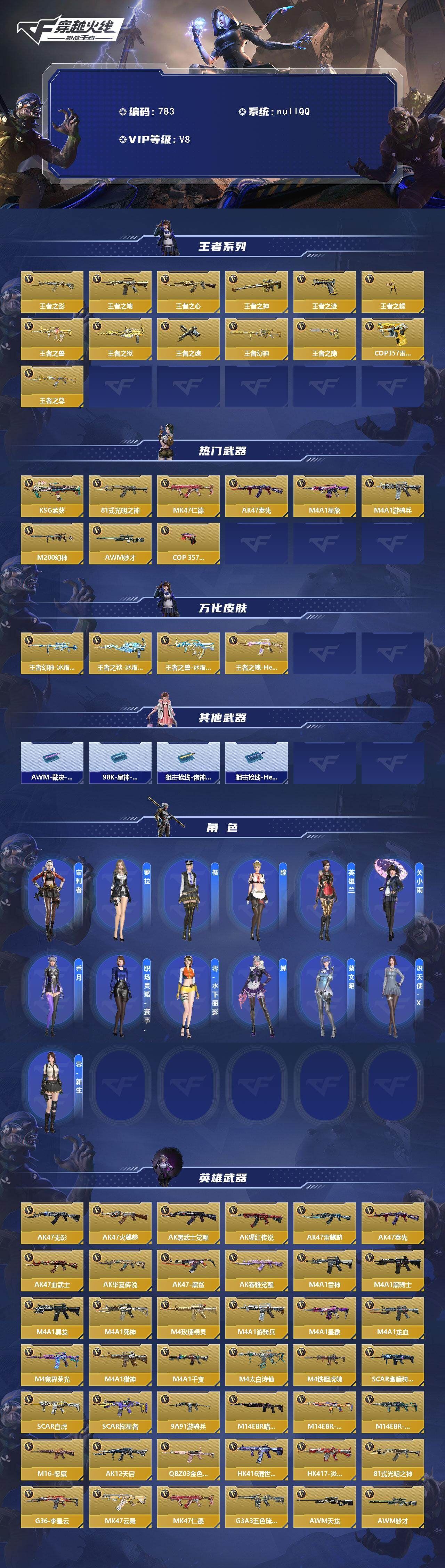 【账号佳】 可二次QQ 【枪战王者iOS】22英雄角色数-373英雄武器数【王者系列】:王者之翼,王者之刺,王者之灵,王者之击*2,王者之轮*2,王者之势,王者之戮,王者之力,王者之影,王者之光,王者之武,王者之怒,王者之魄,王者之心*2,王者之神,王者之锋*3,王者之迹*2,王者之掣,王者之翎,王者之蝶,王者之腾,王者之圣,王者之兽,王者之狱,王者之魂,王者之啸,王者之电,王者之痕,王者幻神,王者之仞,王者之隐*2,王者之烈,王者之技,M4A1-雷霆王者,AK47-雷霆王者,M12S-雷霆王者,COP 357-雷霆王者,王者之尊【热门武器】:M200-权,KSG-孟获,CZS2-仲康,COP 357-安琪拉,AK47-元让,AN94-盖,81式-光明之神,MK47-仁德,M4A1-七色宝葫,AK47-孟德,M4A1-仲达,AK47-奉先,M4A1-威侯,M4A1-星象*2,M4A1-武圣,M4A1-游骑兵*2,TAC-慈,M200-幻神,AWM-妙才,巴雷特-定军,VEPR12-宙斯,81式-阿波罗,COP 357-雷霆,COP 357-星象,COP 357-堕天神*2,COP 357-A,COP 357-绚樱*2【角色】:萝拉,葵,幽灵刀锋-觉醒,子涵*2,关小雨*5,晴雅,雅典娜,蝉*2,英雄兰-X,甄梦*2,炽天使-X,祝融夫人,零-新生,钟小魁【英雄武器】:AK47-无影*2,AK47-火麒麟*3,AK47-耀金伯爵,AK47-Rush-星速,AK47-樱斗士-超觉,AK47-竞技战魂,AK47-机械迷城,AK47-无影-葵,AK47-孟德,AK47-猩红传说,AK47-燎天净火,AK47-奉先,AK47-春雅觉醒,AK47-木兰,AK47-元让,AK47-雷霆,AK47-谜城烟火,M4A1-雷神,M4A1-黑骑士,M4A1-黑龙,M4A1-死神,M4A1-游骑兵*2,M4A1-沙漠领主,M4A1-武圣,M4A1-竞技战魂,M4A1-星象*2,M4A1-威侯,M4A1-雷神-萝拉,M4A1-仲达,M4A1-竞界荣光,M4A1-七色宝葫,M4A1-赛博雷神,M4A1-雷霆,M4A1-哈迪斯,M4A1-堕天神,M4A1-游骑兵-香香,M4A1-雷霆王者,M4A1-太白诗仙,M4A1-铁胆虎魄*2,SCAR Light-白虎,AN94-超新星,剑齿虎-炫彩,AN94-卷帘大将军,AN94-四凶觉醒,AN94-赳赳秦师,AN94-盖,9A91-死神,M14EBR-玄武,M16-恶魔,QBZ03-金色蔷薇*2,HK416-混世行者,81式-光明之神,G36-李星云,MK47-机械纪元,MK47-云舞,MK47-仁德,SKS-美杜莎,G3A3-衍神兵,FN F2000-十绝阵觉醒,QBZ97-浩瀚征途,QBZ191-金甲虎啸觉醒,SBR-湮灭,AWM-天龙,AWM-妙才,巴雷特-毁灭*6,巴雷特-极光*7,巴雷特-定军,巴雷特-安琪拉,巴雷特-冬灭觉醒,暗杀神,M200-幻神,M200-心动次元觉醒,M200-权,09式狙-天神*2,98K-星神,MR1-龙吟惊沧海,TAC-慈,TAC-晴舞,TAC-雷暴,GM6-战争风云觉醒,GM6-逆骨,VSK-94-九黎兵主觉醒,VSK-94-金蚀,加特林-炼狱,刘易斯-星际方舟觉醒,MG36-魔礼青,QBB95-极光,QBB95-再战涿鹿,QBB95-螳螂,MK5-机械纪元*2,MK5-魔鲲,汤姆逊-烈龙,王者之烈,双持斯泰尔-天使*2,斯泰尔-蝴蝶,QCW05-未来战士,CBJ-MS-毒蜂*2,P90-双脊龙,CZS2-善财童子,CZS2-血月,CZS2-仲康,M12S-雷霆,M12S-天公,VEPR12-宙斯,嗜血金鲨,地狱烈炎,AA12-竞界荣光,AA12-雷神,毁灭征服者-超越Max,亡命之徒-幻兽,KSG-天蓬元帅,KSG-极光,KSG-孟获,KSG-钟馗觉醒,贝雷塔-力拔山河,M1887-幽冥玄喵觉醒,M1216-霸王龙,USP-神罚*7,USP-雷暴*2,USP-机械迷城*2,USP-仁德,USP-太白诗仙,沙鹰-修罗*3,沙鹰-火麒麟,沙鹰-无影,气手枪-炼狱*2,沙鹰-孟德,双持沙鹰-金银双煞,沙鹰-修罗-铁骑*2,沙鹰-神兵修罗,双持沙鹰-元让,左轮-慈,蟒蛇-奉先,GLOCK18-宙斯,COP 357-星象,COP 357-雷霆,COP 357-堕天神*2,COP 357-雷霆王者,COP 357-安琪拉,QSZ92-天使,双管猎枪-黑骑士,双管猎枪-威侯,双管猎枪-哈迪斯,双管猎枪-未来战士,柯尔特-仲达,柯尔特-伏刹山海觉醒,双持柯尔特-极光,CZ75-穷奇,CZ75-策,MK23-幻神,MK23-双脊龙,激光短刃-黑骑士,蝴蝶刀-极光,白骨利刃,