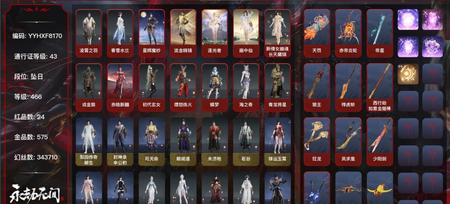 【账号佳】 网易邮箱【22红621金|等级462|收藏值398164|陨星|幻丝358242|金砖48】红色神品:沙漠香风,守墨麒,命定之辉,画中仙,戎金狼,赤皓新囍,初代玄女,熛怒炼火,樱云天女,苍穹之光,赤帝炎轮,悍虎斩,飞将戟,西行劫·如意金箍棒,少阳剑,天琼,锦鲤玉扇,逆晦朔,狂龙,惊百里,太玄之刃,帝星 角色金色皮肤:梨园传奇·柳生,封神录·申公豹,司天命,灵鹿巫者,墨染千秋·剪春漪,禄运玉霄,紫微星命,封神录·龙吉公主,畲族·凤凰装,姑射真人,烈武者,共赴无间·赤焰舞影,千秋匠心·玉叶景,观山海·青鸟,浣烟纱,瀚海苍鹰,福瑞天泽,葫芦兄弟·蛤蟆头领,观山海·秋神蓐收,斑斓衣,干将莫邪,百战·断链,观山海·冬神玄冥,共赴无间·幽夜玲珑,倾国倾城·羞花,赤阳天狐,封神录·妲己,护世四法·广目天王,日影花阴,黄昏巫主,绿野守护·悠竹萌客,楚韵九歌·山鬼,绮云衫,观山海·腓腓,塔罗序·衔环,卷王,天工奥妙,夜绸袍,黑猫警长·班长制服,寿竹云春,观山海·文鳐,虹猫蓝兔七侠传·虹猫,金财聚辉,封神录·姜子牙,绿野守护·山漠狞影,开辟鸿蒙·日月明,暖冬茶馨,雪铃绮歌,巫师3·特莉丝,夏日派对·绮夏幻梦,虹猫蓝兔七侠传·蓝兔,长歌诗韵·如梦令,墨染千秋·玄雷,斩神·林七夜,狩猎都市·雷行猎手,墨染千秋·墨游痕,黑猫警长·警长制服,武道无穷·少林,龙之影·生死局,墨染千秋·青玉案,甜夜安眠·鹅黄纱梦,开辟鸿蒙·风雨谐,铸神·天禄瑞光,智绘·萍之缘,新倩女幽魂·瑶光沐月,怪诞狂想·友情岁月,护世四法·多闻天王,斗罗大陆·唐三,沙狼之怒,追猎,倒反阴阳·炽羽,长歌诗韵·鹧鸪天,巫师3·杰洛特,巨阙,观山海·夏神祝融,游四海,观山海·相柳,夜华朝,耀世魂花,2674·嘉斯威珀,红川仙子,狩猎都市·紫藤神子,御宅罗梦,九阴圣女,狩猎都市·暗夜利刃,阴阳师·樱雨刀舞,妖刀姬,绿野守护·暗沼摩罗,阿娜希塔,探海裙,赤雾烟霞,倒反阴阳·铁面,新魔杰·斩魔天将,西行劫·杨戬,常胜袍,弘毅袍,龙之影·过江龙 发型金色皮肤:簪缨发,落霜发,韶光发,绿野守护·娇憨发,(挑染)暮落发,甜夜安眠·暖绒发,斗罗大陆·海神发,逆水寒·江海发,(挑染)熛怒发,巫师3·白狼发,月丹发,(挑染)樱舞发,狩猎都市·归宁发,(挑染)填海发,绿野守护·冷傲发,(挑染)鎏渊发,倒反阴阳·铭誓发,(挑染)万仞山发,(挑染)清威发,封神录·红鸾星发,排霜发,墨染千秋·春霁发,(挑染)鸿影发,观山海·青鸾发,千秋匠心·琳琅发,共赴无间·烬舞发,观山海·天刑发,(挑染)宵烛发,观山海·冥泉发,流萤发,缱绻发,幽焰发,鹤发,古溪发,封神录·笼烟芍药发,共赴无间·迷心发,秀逸发,塔罗序·珀光发,长歌诗韵·豪杰发,虹猫蓝兔七侠传·虹发,封神录·仙风发,(挑染)逐影发,鹤姿发,巫师3·王室顾问发,蜜语发,长歌诗韵·沉醉发,虹猫蓝兔七侠传·蓝发,斩神·炽羽尘光发,(挑染)雷霆客发,狩猎都市·迅猛发,墨染千秋·点惊鸿发 武器金色皮肤:惊火弦,穿云燕,咕 咕,天牛翼,镇海,朱雀,冬日序曲·雪野巡礼,青霜璃,戏祥云,绿野守护·雨幕,引冰落,萤火,天心玉,雪国礼炮,钻山,赤炎炮,观山海·嘉果花,龙啸,狩猎都市·脉冲银颚,鹤逐霞,丹鹤,凝冰魄,虎踞,鹦鹉螺,心魔,刑度,月虹弦角,乌木弓,枯影,诛神,豹胎易筋弓,转轮弓,仙毫,秉青,玄铜飞军,翠影,百战·惊锋,绿野守护·毛乎乎,镇恶,天狐,烛泪,无韵,斩银河,塑梦钥匙,青石猊,破天,龙蟠,雷王锯,断月影,麒麟牙,西行劫·三尖两刃刀,镇山河,仙彩,解腕钉,灵木角,斗罗大陆·海神三叉戟,观山海·金神钺,长虹,委蛇矛,糖果棍,冰辉,护世四法·降魔,武道无穷·封魔,2674·超越型,虹猫蓝兔七侠传·长虹剑,虹猫蓝兔七侠传·冰魄剑,财神剑,学宫之杖,倒马棍,糖衣甜心,判官笔,曼提柯尔之牙,桡尺刀,月尺刀,仙舞,破劫·千刃,华夏神兵·马首刀,折寒英,青峰叠扇,墨绒羽扇,拳皇·舞扇,腾云歌,耀夜流华,樱落,千堆雪,逍遥,合金双劫,咯咯,夔牛槌,傲骨,月瞳,嘶风,除岁,镇魔杵,玉矩,诡月,空寒,古墓丽影·登山镐,蛋仔派对·咸鱼,怨憎,武道无穷·双蝶,西摩格镰,天之刑,破重云,巫师3·湖女之剑,琴心,亢龙,隐锋,监星尺,劫烬·炼,赤霄,共赴无间·蝴蝶心,赤影玄印,光影裁决,观山海·水衡,壶中日月,含光承影剑】各种道具详情看截图、低价出售找回包 赔、截图展示段位不代 表实际段位,如赛季更新等不可抗拒因素发生变化、时限道具不保证所剩时间、标题未写送点劵默认不送【卖号买号首选亿梦】