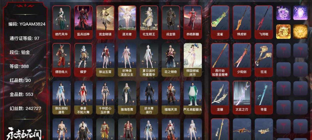 【账号佳】 【网易】【手机】20红553金, 技能奥义8, 总收藏值363241, 幻丝242727, 等级388, 三排铂金3, 通行证已升级Lv.97, 双马尾女双马尾男, 20红色神品: 赤皓新囍/化生明王/戎金狼/熛怒炼火/蝶梦/绝代风华/监兵凶神/流金晓锦/逐光者/少阳剑/太玄之刃/帝星/比羿/龙雀/悍虎斩/飞将戟/如意金箍棒/狂龙/龙骧/墨离, 【技能奥义】 剪纸彩刀/镇冥司/揽九天/彩俑娃娃/珥冰/御祥云/神君印/凶虎宁红夜: 赤皓新囍/山川润/倒反阴阳炽羽/昆仑之主/耀世魂花/夜华朝/蜘蛛精/碧水青天/九阴圣女/簪缨发/落霜发/双马尾女沈妙: 千机喵/奥村春NOIR/秋藏桂/悠竹萌客/娇憨发/NOIR发型/双马尾女天海: 化生明王/九骊之君/白熊/警长制服/少林/若水尊者/缘觉发/双马尾男殷紫萍: 萍之缘/福寿仙/鹅黄纱梦/云雪染/风雨谐/暮落发/暖绒发/双马尾女特木尔: 戎金狼/唐三/路奇迷踪/沙狼之怒/狼啸发/海神发/双马尾男季沧海: 熛怒炼火/不良人李星云/康复之星/巨阙/杰洛特/鹧鸪天/游四海/腾烟发/江海发/白狼发/含锋发/不如吾发/双马尾男胡桃: 蝶梦/高校水着/星空投影/日道神子/紫藤神子/御宅罗梦/贵胄少女/月丹发/洛天依投影发/归宁发/双马尾女妖刀姬: 暗夜利刃/流火映真/神罚之光崔三娘: 湘夫人/阿娜希塔/暗沼摩罗/赤雾烟霞/无拘/伏波龙女/冷傲发/双马尾女岳山: 戍关将/铁面/金戈止/斩魔天将/尼尔/常胜袍/弘毅袍/过江龙/玄鳞发/双马尾男无尘: 朝闻道/雨宫莲JOKER/申公豹/黄庭道/JOKER发型/双马尾男顾清寒: 龙吉公主/禄运玉霄/仲夏霜华/灵儿发/绯霜发/红鸾星发/春霁发/双马尾女武田信中: 花之倾奇/双马尾男迦南: 绝代风华/不知火舞/闭月/凛冬/玉叶景/瀚海苍鹰/鸿影发/翔鸾发/女忍发/琳琅发/双马尾女胡为: 监兵凶神/英雄袍/福瑞天泽/蛤蟆头领/悟空/秋神蓐收/夜行/不败擂主/双马尾男季莹莹: 盛夏白阳/哪吒/冬无归/干将莫邪/冬神玄冥/缱绻发/幽焰发/双马尾女玉玲珑: 妲己/丽娘/幽夜玲珑/春不敛/笼烟芍药发/惊雀发/迷心发/双马尾女哈迪: 卷王/夜绸袍/狮鬓发/秀逸发/双马尾男魏轻: 半夏晚风/钟鼎光/念奴娇/獬豸/极夜天曦/玄冥发/极夜发/傲采发/双马尾女刘炼: 流金晓锦/姜子牙/金财聚辉/风吹雪发/仙风发/双马尾男张起灵: 云间影/山漠狞影/越野帽衫/风纪发/鹤姿发/双马尾男席拉: 逐光者/雪铃绮歌/日月明/天虹咏/璀璨发/蜜语发/双马尾女蓝梦: 如梦令/牵云霞发/沉醉发/双马尾女万钧: 林七夜/雷行猎手/迅猛发/炽羽尘光发/双马尾男李寻欢: 墨游痕/点惊鸿发/双马尾男巫真: 双马尾女拳刃: 天狐/毛乎乎/醒狮/镇恶天下第一蓄转振长剑: 少阳剑/不良人龙泉剑/亢龙/含光承影/湖女之剑/赤霄/隐锋太刀: 太玄之刃/切影/残阳/毅魂守/霜素/风神切横刀: 帝星/比羿/尽春锋/烛泪/白鹿/雷厉阔刀: 龙雀/听涛_/斩银河/破天/赤影妖刀/青石猊/龙蟠斩马刀: 悍虎斩/飞将戟/千钧羽/星辉环月/潮/麒麟牙枪: 劫垢堀/委蛇矛/建木/海神三叉戟/灵木角/焦钰/白虹/镇山河/长虹棍: 如意金箍棒/冰辉/封魔/木棍/糖果棍/输液架匕首: 仙舞/判官笔/曼提柯尔之牙/桡尺刀/马首刀扇: 千堆雪/耀夜流华/腾云歌/舞扇/青峰叠扇链剑: 衔断/醉花风双截棍: 狂龙/九霄寒/咯咯/嘶风/夔牛槌/精武双刀: 龙骧/怨憎/破重云/空寒/西摩格镰双戟: 蝴蝶心/衔月/赤影玄印万仞轮: 穷奇飞刀: 不良人华阳针/玄铜飞军/福鱼刀/秉青/翠影/胧月魂连弩: 天牛翼/惊火弦/穿云燕鸟铳: 天心玉/引冰落/戏祥云/沉默审判/石中火/萤火/雨幕/雪夜巡礼火炮: 兔华笼/潜磷/钻山/雪国礼炮/雷落五眼铳: 丹鹤/凝冰魄/虎踞/赤霞弓箭: 乌木弓/豹胎易筋弓/逆逢,各种道具详情看截图、低价出售找回包 赔、截图展示段位不代 表实际段位,如赛季更新等不可抗拒因素发生变化、时限道具不保证所剩时间、标题未写送点劵默认不送【卖号买号首选亿梦】【4.4号可换绑】